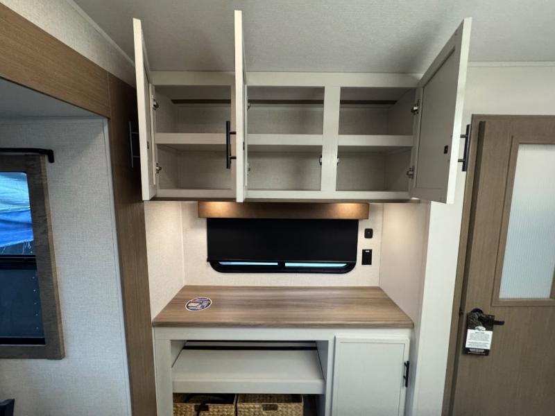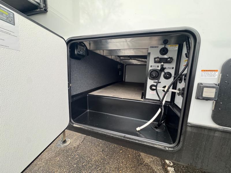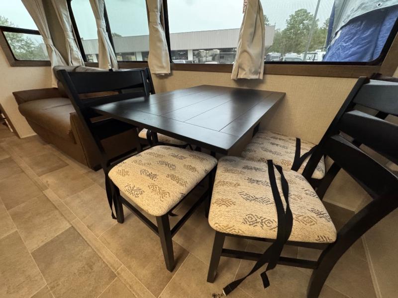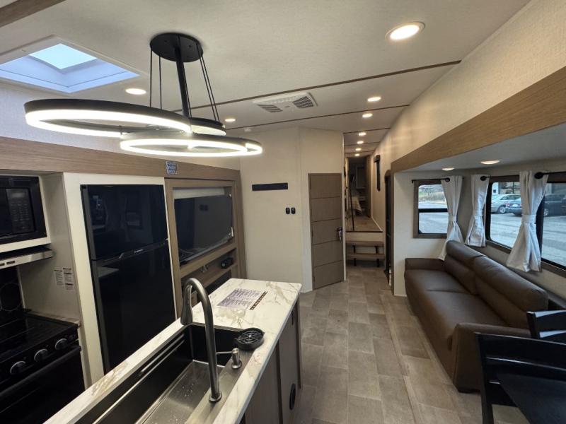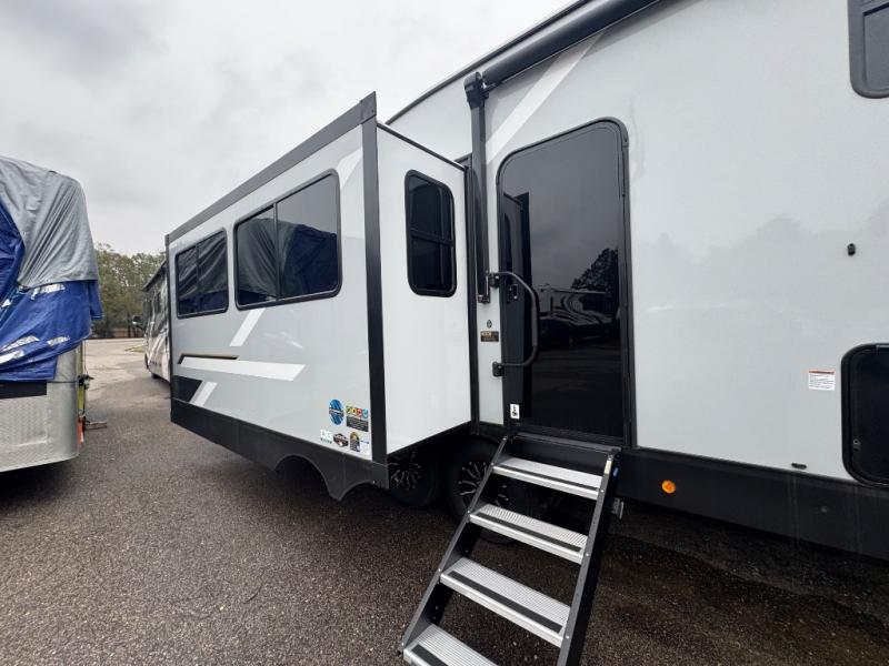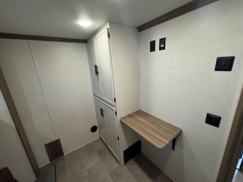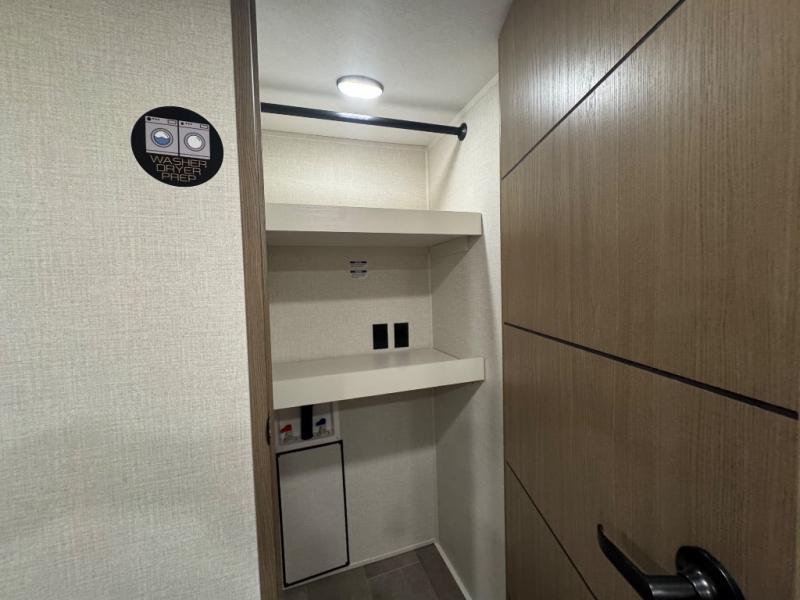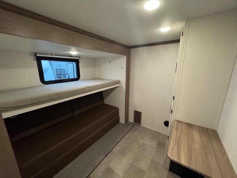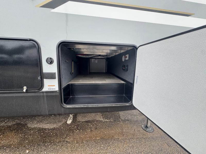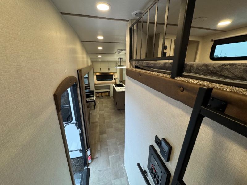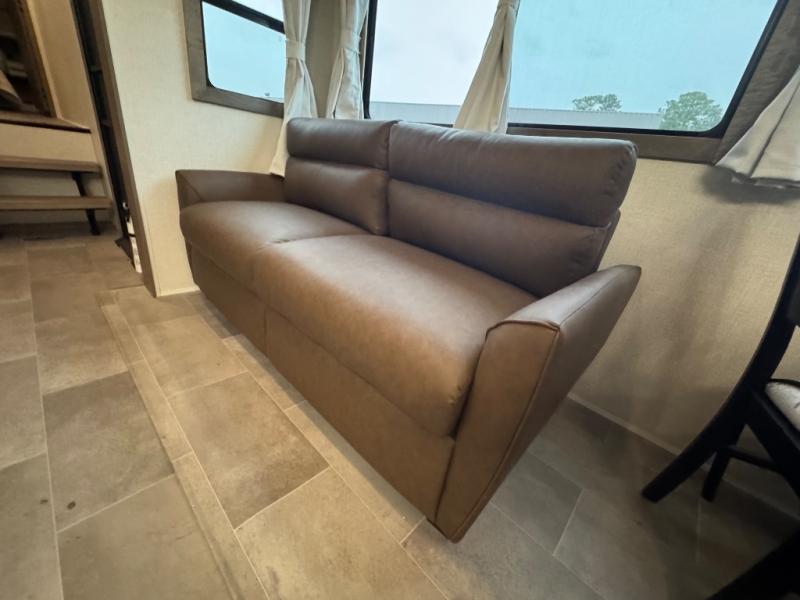 Wow! This fifth wheel will surely make an impression with its middle bunkhouse that can be utilized as an extra bedroom, second living room or even an office thanks to the desk and sofa that becomes a Versa queen bed at night. You will also find a flip-down upper bunk, a slide out for more floor space, and a wardrobe for clothing. The full bathroom is between this room and the front bedroom that offers lots of storage including a slide out wardrobe, a space prepped for a washer/dryer option, nightstands to place your cellphone and such, plus a queen bed with Versa Tilt technology. The kitchen at the back includes plenty of storage for your dishes, pans, drinkware, and dry goods. The cook will love the kitchen island and the full amenities. And the free-standing table with chairs plus the theater seating offer even more seating.