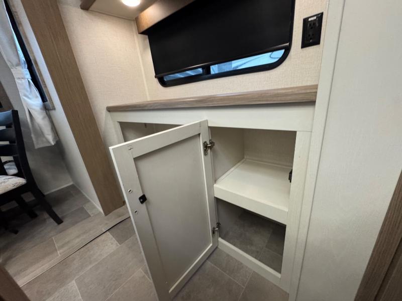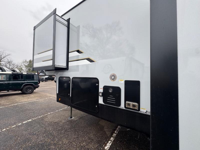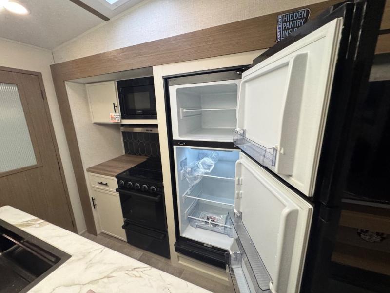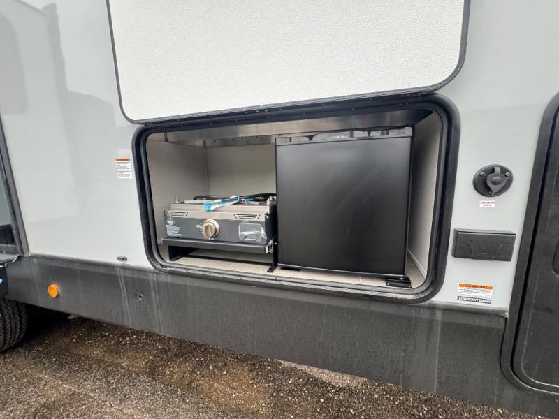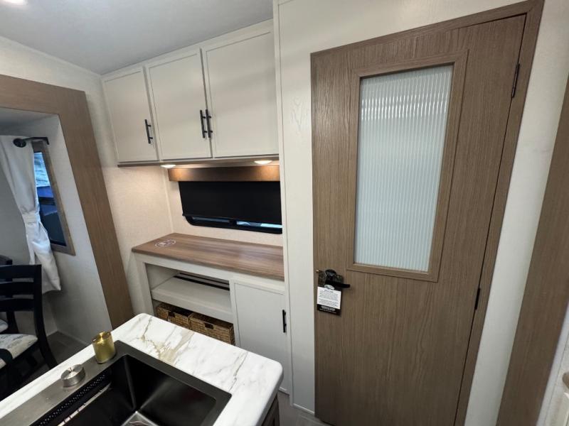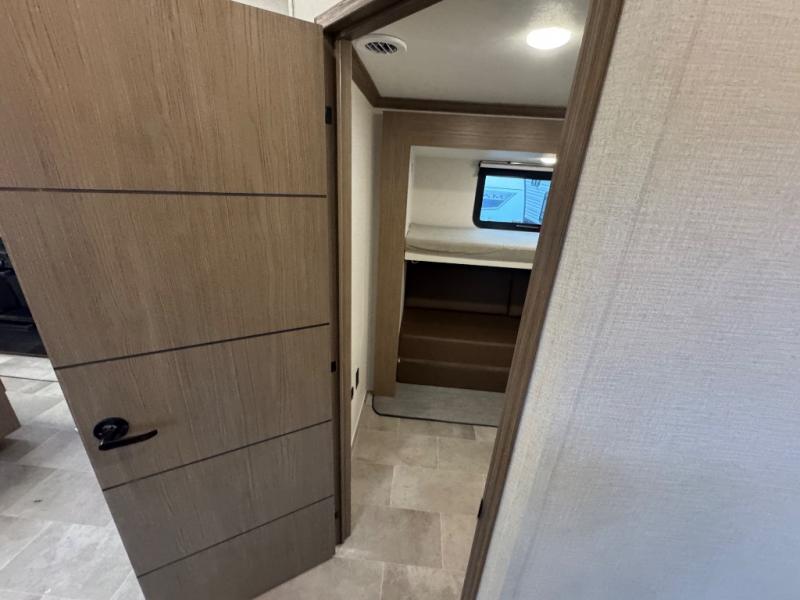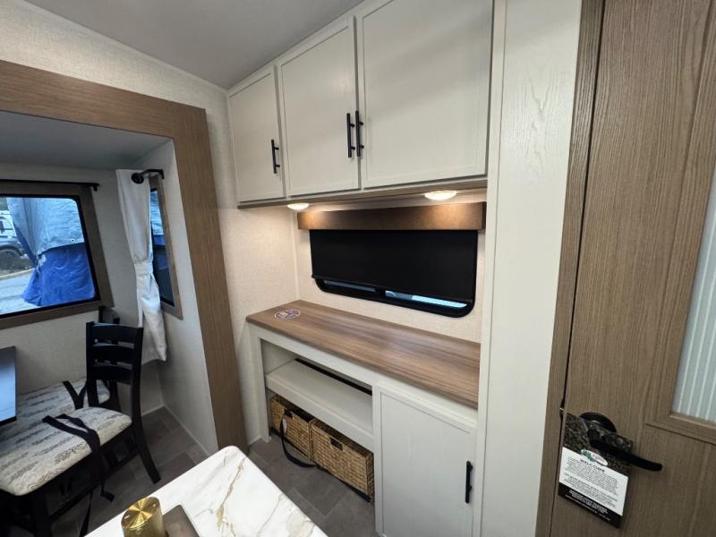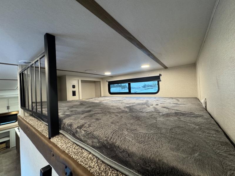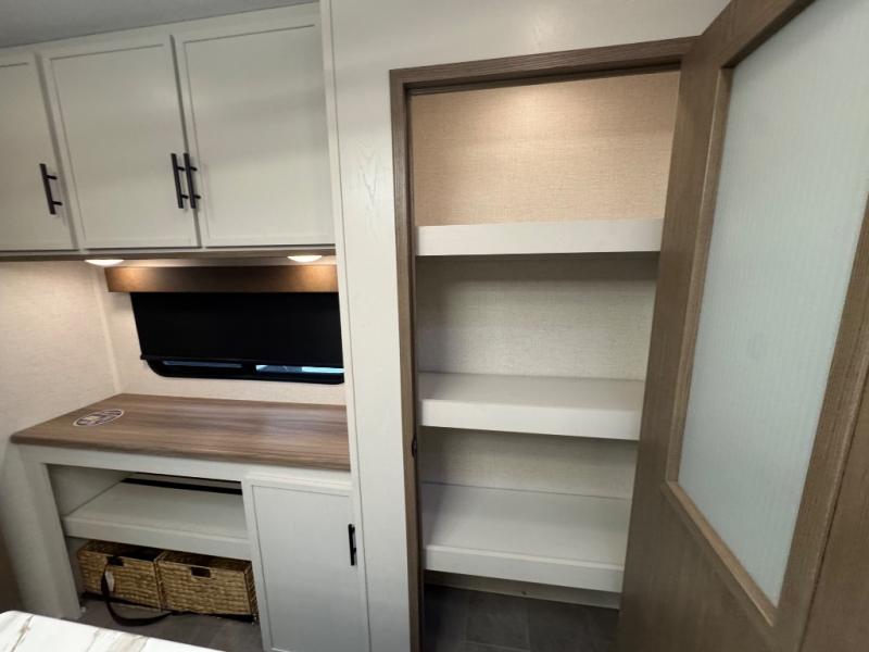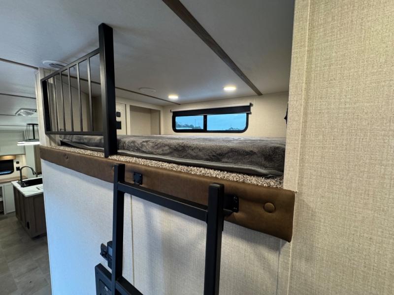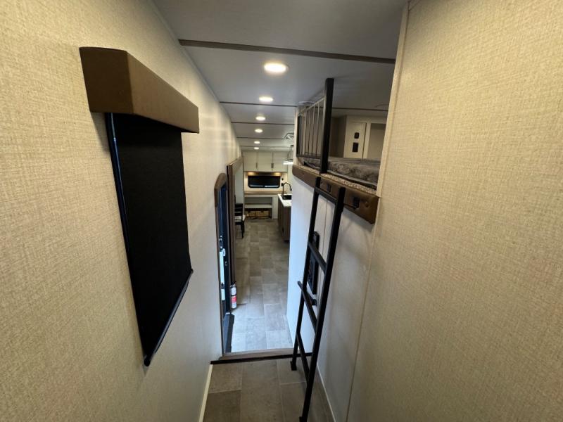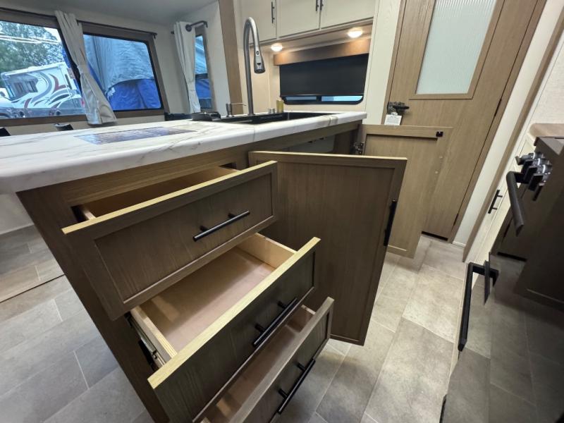 Wow! This fifth wheel will surely make an impression with its middle bunkhouse that can be utilized as an extra bedroom, second living room or even an office thanks to the desk and sofa that becomes a Versa queen bed at night. You will also find a flip-down upper bunk, a slide out for more floor space, and a wardrobe for clothing. The full bathroom is between this room and the front bedroom that offers lots of storage including a slide out wardrobe, a space prepped for a washer/dryer option, nightstands to place your cellphone and such, plus a queen bed with Versa Tilt technology. The kitchen at the back includes plenty of storage for your dishes, pans, drinkware, and dry goods. The cook will love the kitchen island and the full amenities. And the free-standing table with chairs plus the theater seating offer even more seating.