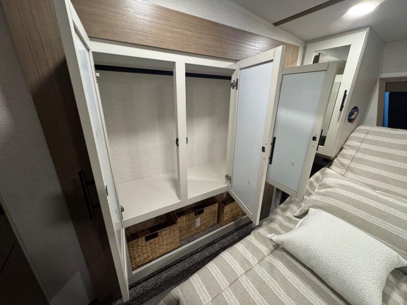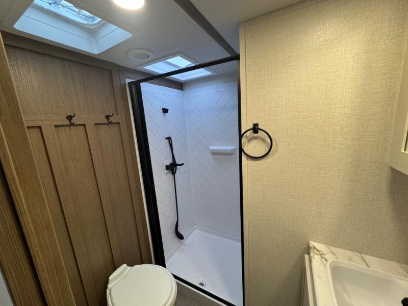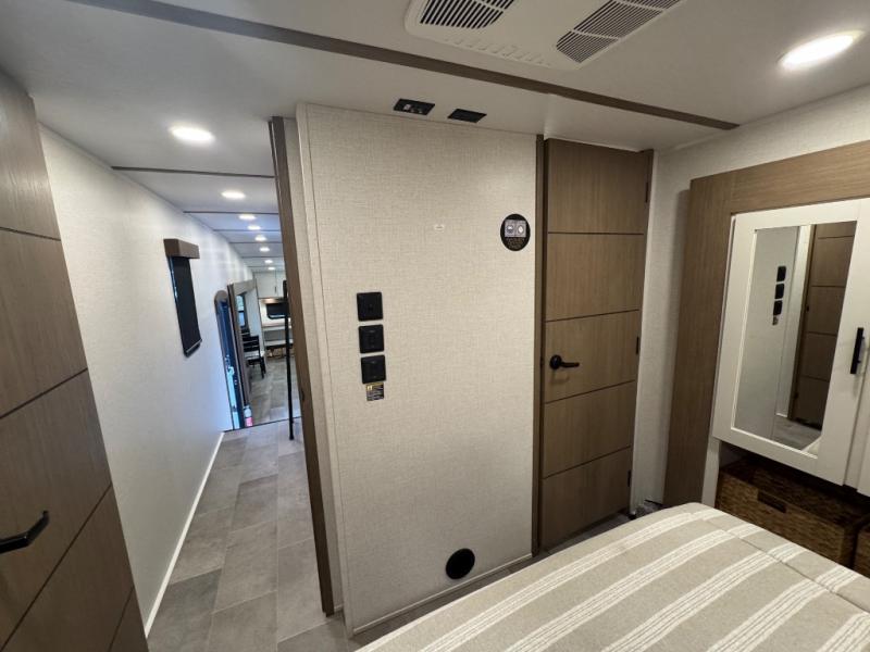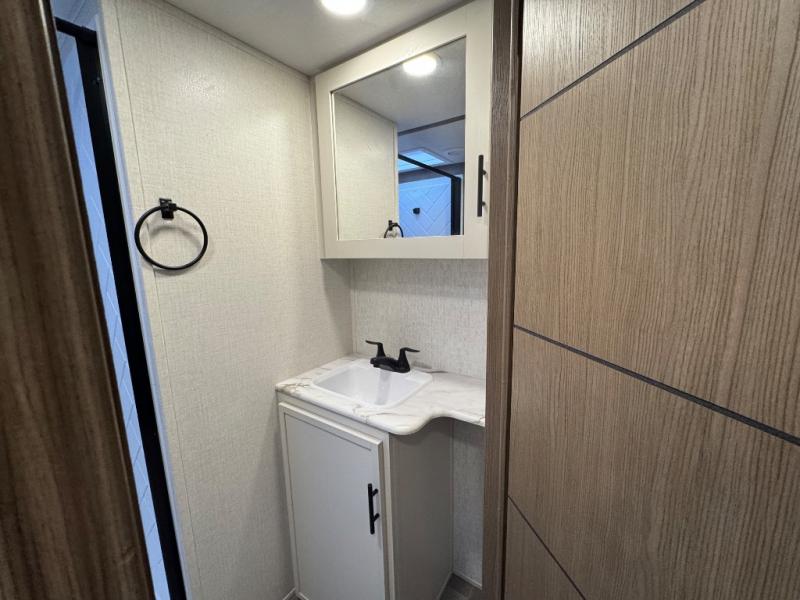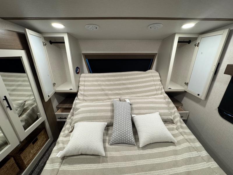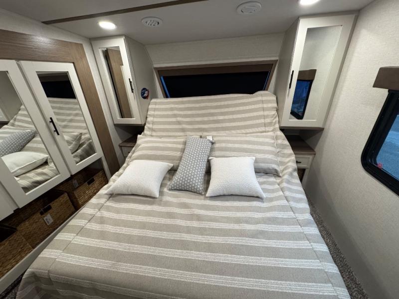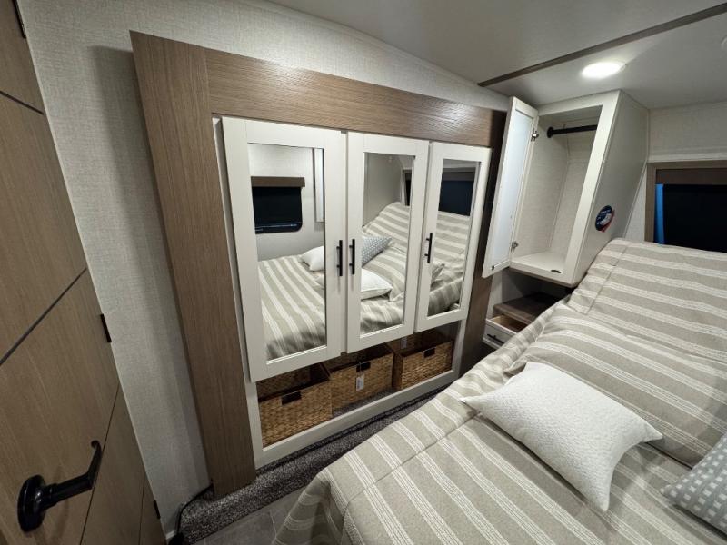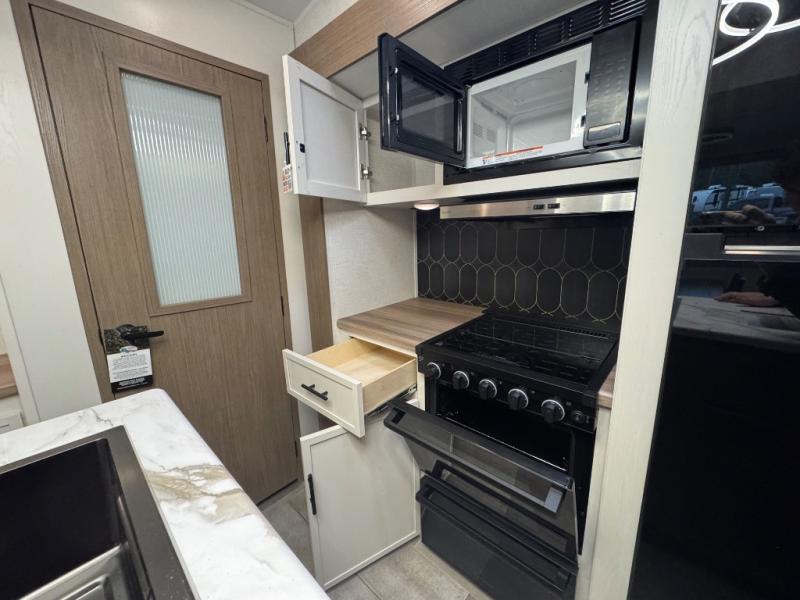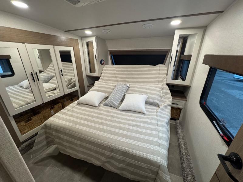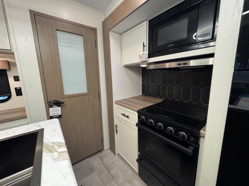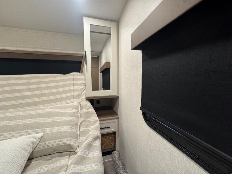 Wow! This fifth wheel will surely make an impression with its middle bunkhouse that can be utilized as an extra bedroom, second living room or even an office thanks to the desk and sofa that becomes a Versa queen bed at night. You will also find a flip-down upper bunk, a slide out for more floor space, and a wardrobe for clothing. The full bathroom is between this room and the front bedroom that offers lots of storage including a slide out wardrobe, a space prepped for a washer/dryer option, nightstands to place your cellphone and such, plus a queen bed with Versa Tilt technology. The kitchen at the back includes plenty of storage for your dishes, pans, drinkware, and dry goods. The cook will love the kitchen island and the full amenities. And the free-standing table with chairs plus the theater seating offer even more seating.