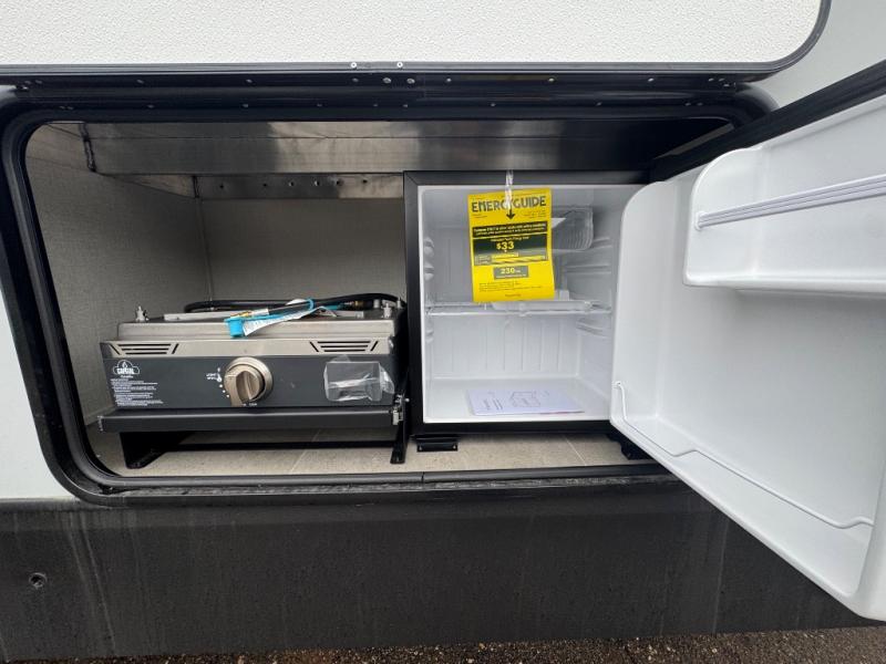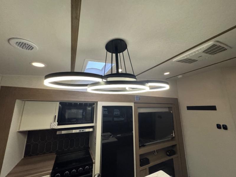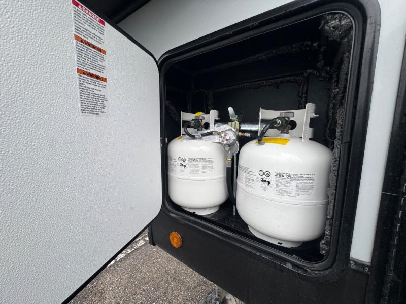 With any Impression fifth wheel by Forest River, the focus of the design is comfort and value, built with quality craftsmanship and attention to customer's desires in each Impression! The exterior includes upgraded E-rated tires, custom exterior graphics package, and insulated slam latch baggage doors. There is also an enclosed docking station, an outside shower, and a 100W roof panel for off-grid capabilities. The fully heated and enclosed AccessiBelly has removable underbelly panels along with enclosed tank valves. There is an industry leading 15K A/C plus 35K BTU furnace to keep you comfortable. The interior has lumbercore cabinetry, residential linoleum, residential backsplash in the kitchen, and oversized opening windows in the living area for more natural lighting and good air flow.