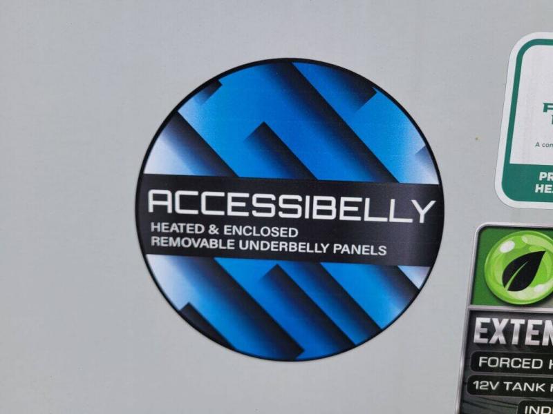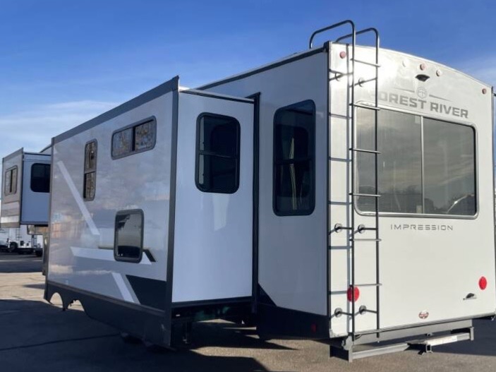 With any Impression mid-profile fifth wheel by Forest River, the focus of the design is comfort and value, built with quality craftsmanship and attention to customer's desires in each Impression! The exterior includes upgraded E-rated tires, custom exterior graphics package, and insulated slam latch baggage doors. There is also an enclosed docking station, an outside shower, and a 100W roof solar panel for off-grid capabilities. The fully heated and enclosed AccessiBelly has removable underbelly panels and offers four seasons of travel, and there is an industry leading 15K A/C plus 35K BTU furnace to keep you comfortable. The interior has lumbercore cabinetry, residential linoleum, residential backsplash in the kitchen, and oversized opening windows in the living area for more natural lighting and good air flow.
