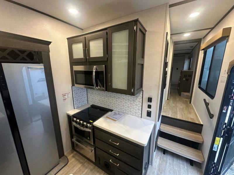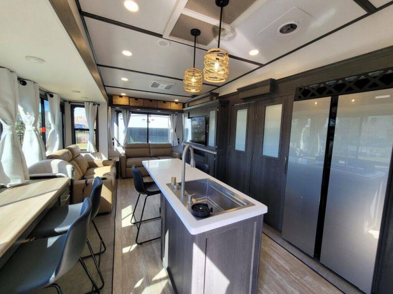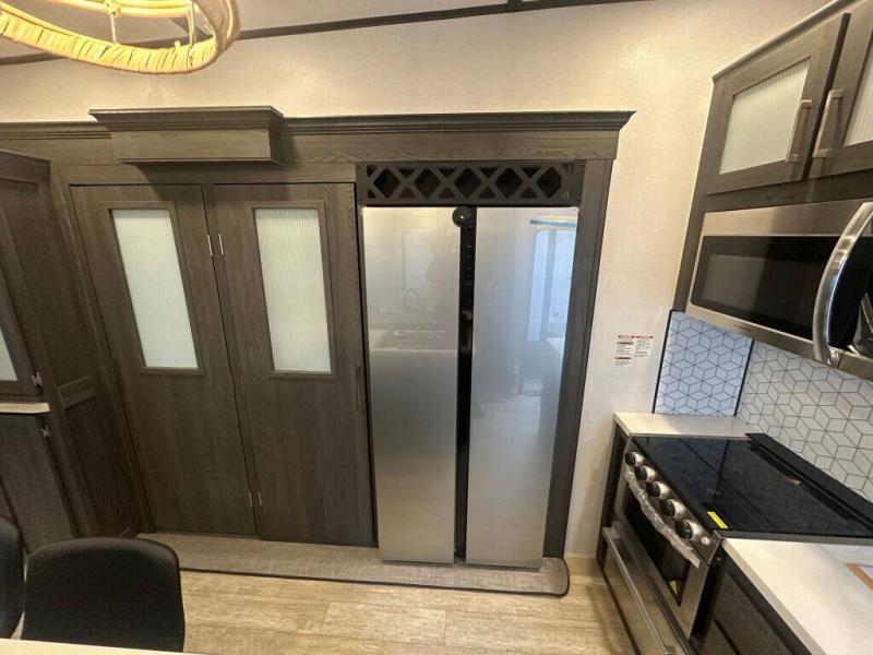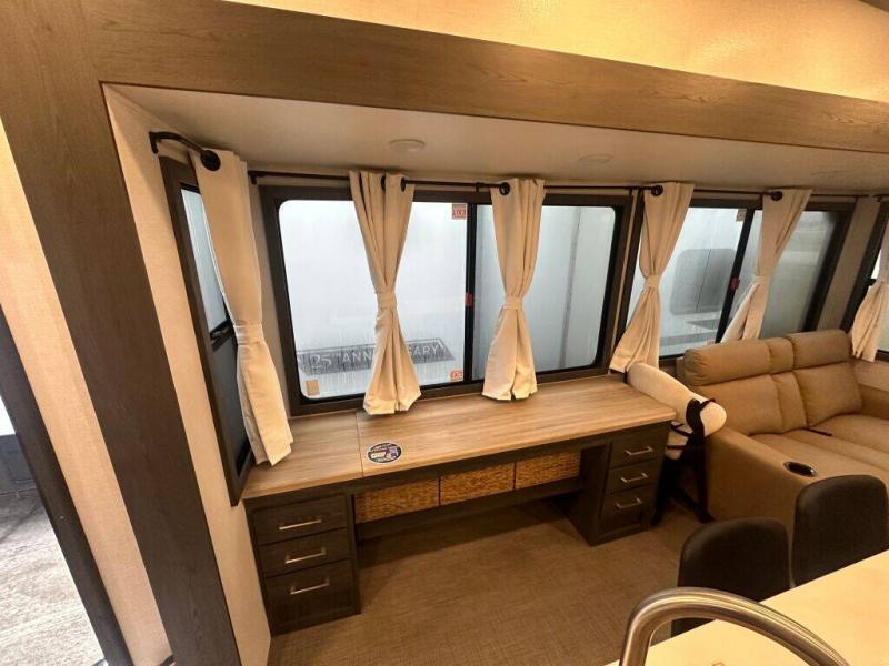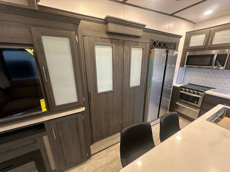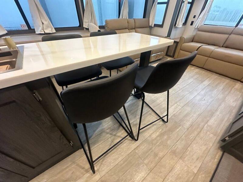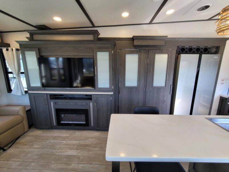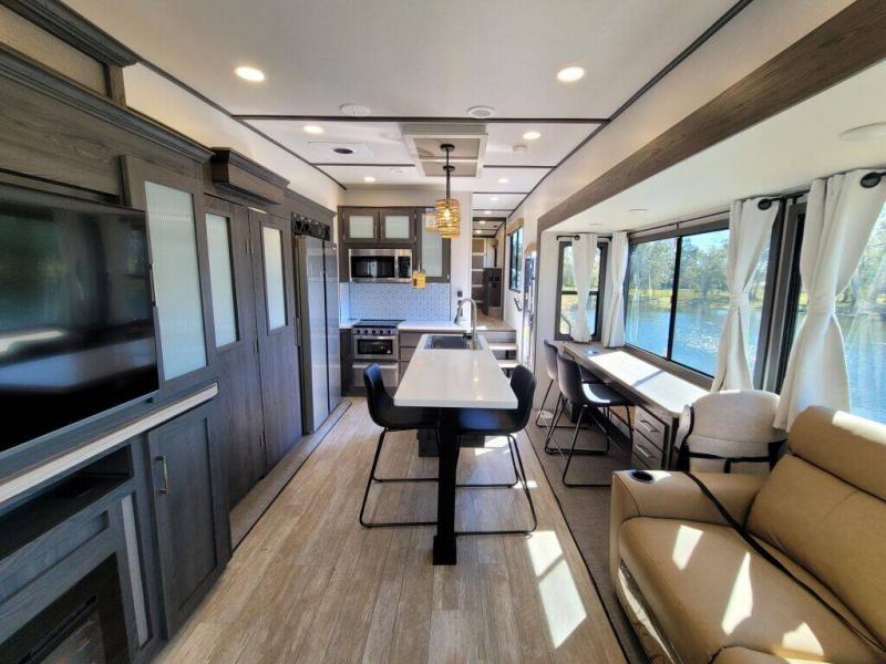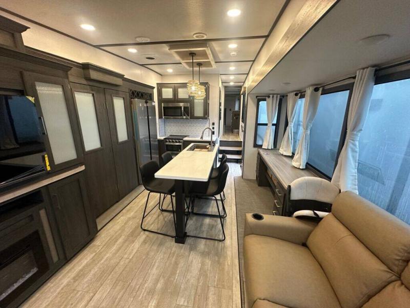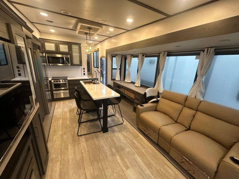Step inside this luxurious fifth wheel that can sleep five each night! The rear tri-fold hide-a-bed sofa and theater seating provide a relaxing evening by the entertainment center with a 55" TV. Next to the entertainment center is a hidden door with cabinets and 16 cu. ft. 12V refrigerator, and a 36" x 74" flip-down bunk with storage. The kitchen has plenty of countertop space to prepare your best home cooked meals and an island with four bar stools to enjoy your meals. You also have a desk with storage to get some work done if needed. As you walk up the floating steps, you will notice the full bathroom to your left with a walk-in shower with a skylight for added natural lighting and a dual sink vanity for two to get ready at once. The front private bedroom has a king bed with Versa Tilt technology slide, a dresser next to a bench and a front wardrobe that is prepped for a washer and dryer!