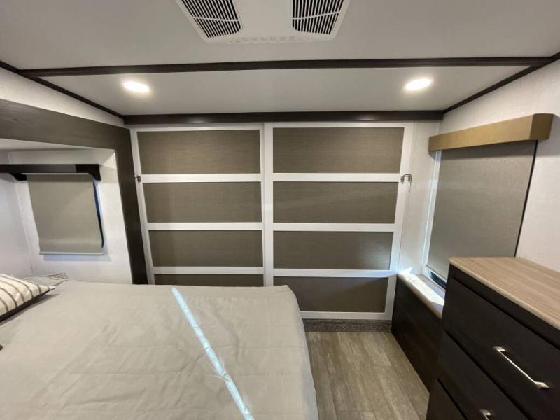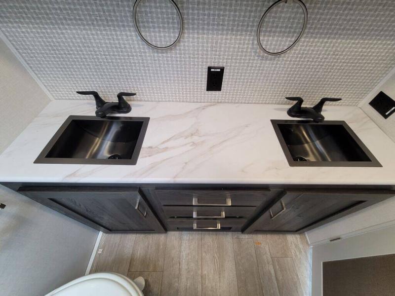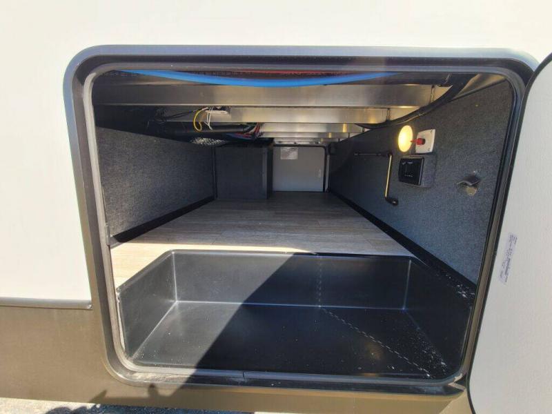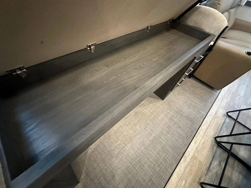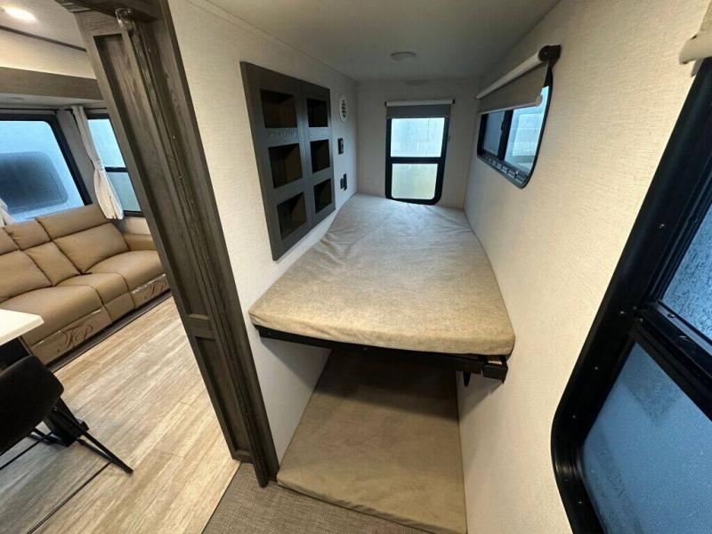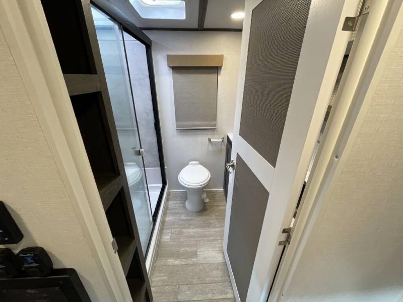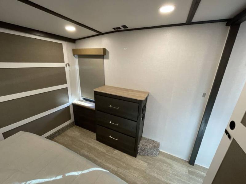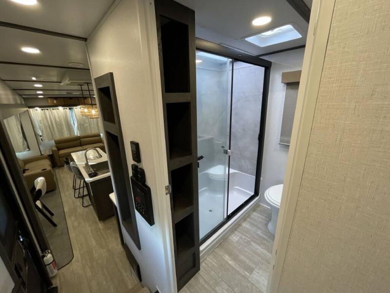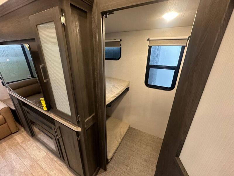 Step inside this luxurious fifth wheel that can sleep five each night! The rear tri-fold hide-a-bed sofa and theater seating provide a relaxing evening by the entertainment center with a 55" TV. Next to the entertainment center is a hidden door with cabinets and 16 cu. ft. 12V refrigerator, and a 36" x 74" flip-down bunk with storage. The kitchen has plenty of countertop space to prepare your best home cooked meals and an island with four bar stools to enjoy your meals. You also have a desk with storage to get some work done if needed. As you walk up the floating steps, you will notice the full bathroom to your left with a walk-in shower with a skylight for added natural lighting and a dual sink vanity for two to get ready at once. The front private bedroom has a king bed with Versa Tilt technology slide, a dresser next to a bench and a front wardrobe that is prepped for a washer and dryer!