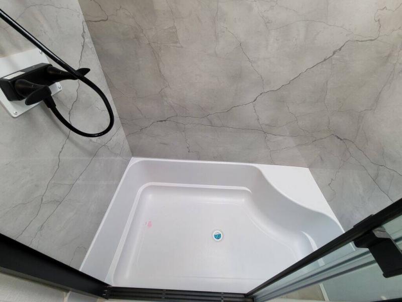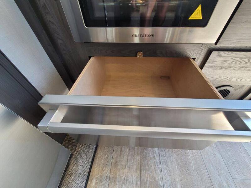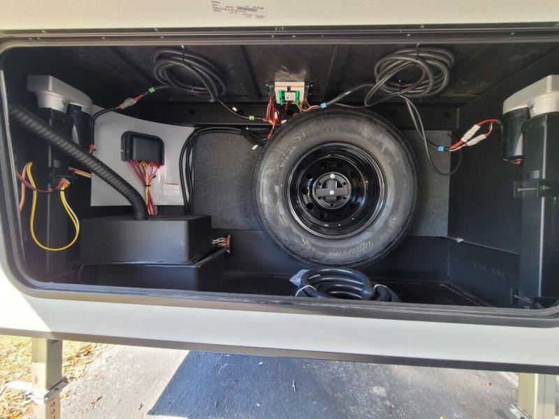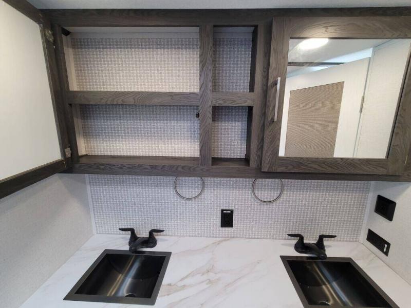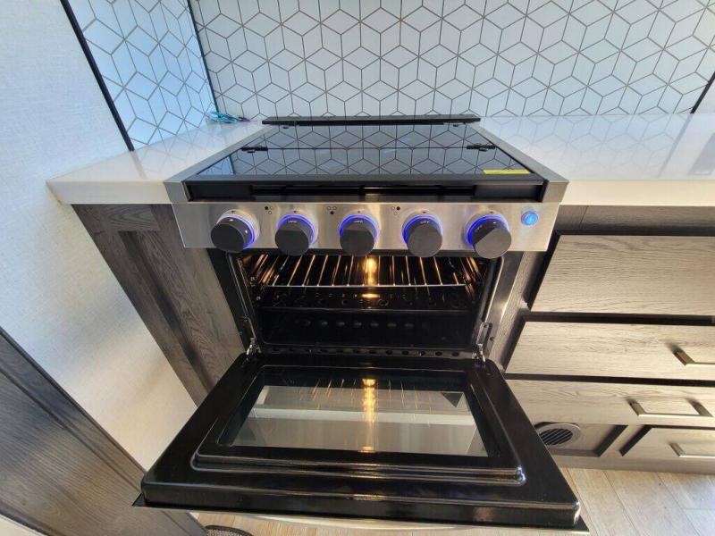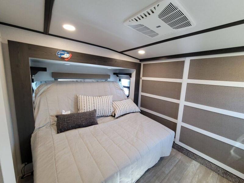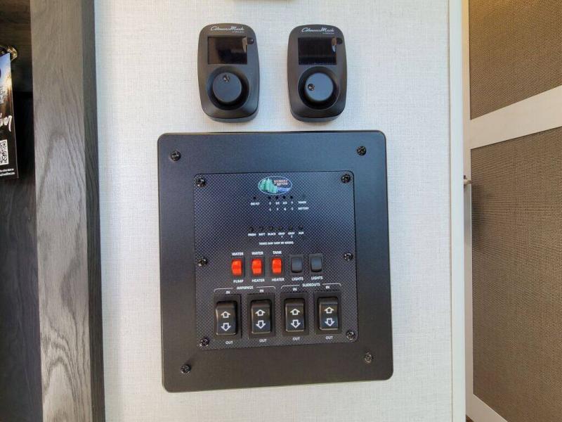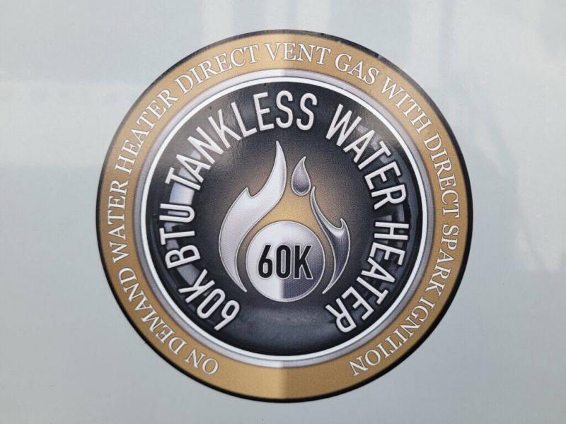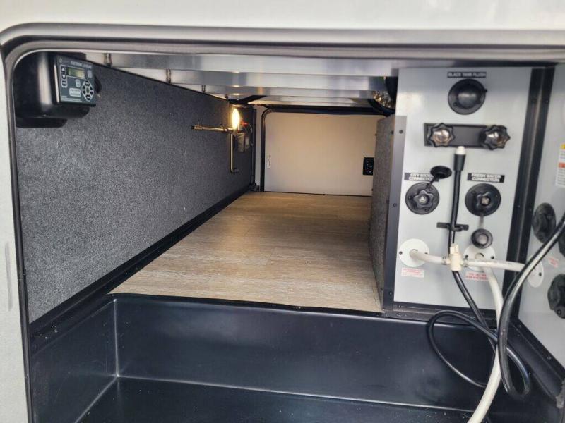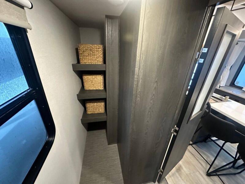 Step inside this luxurious fifth wheel that can sleep five each night! The rear tri-fold hide-a-bed sofa and theater seating provide a relaxing evening by the entertainment center with a 55" TV. Next to the entertainment center is a hidden door with cabinets and 16 cu. ft. 12V refrigerator, and a 36" x 74" flip-down bunk with storage. The kitchen has plenty of countertop space to prepare your best home cooked meals and an island with four bar stools to enjoy your meals. You also have a desk with storage to get some work done if needed. As you walk up the floating steps, you will notice the full bathroom to your left with a walk-in shower with a skylight for added natural lighting and a dual sink vanity for two to get ready at once. The front private bedroom has a king bed with Versa Tilt technology slide, a dresser next to a bench and a front wardrobe that is prepped for a washer and dryer!