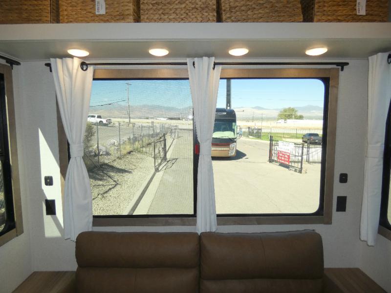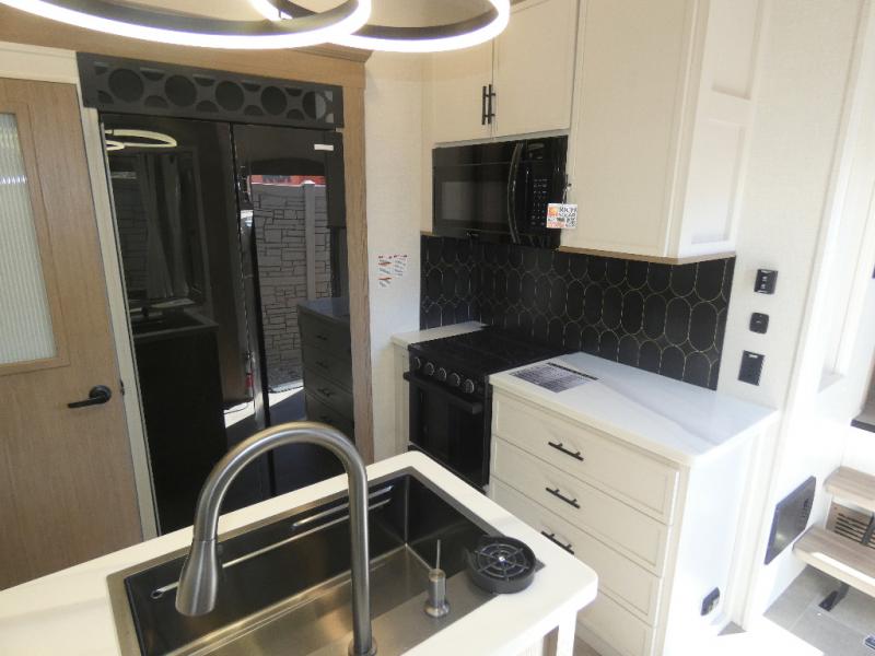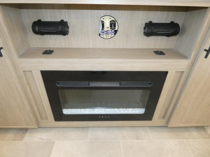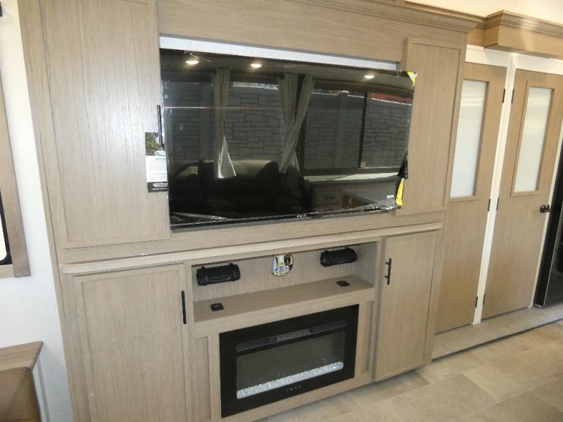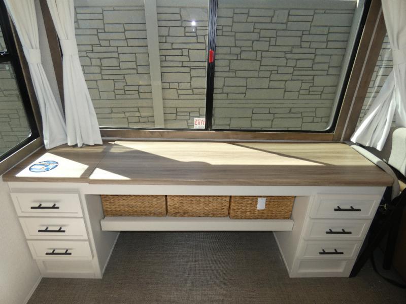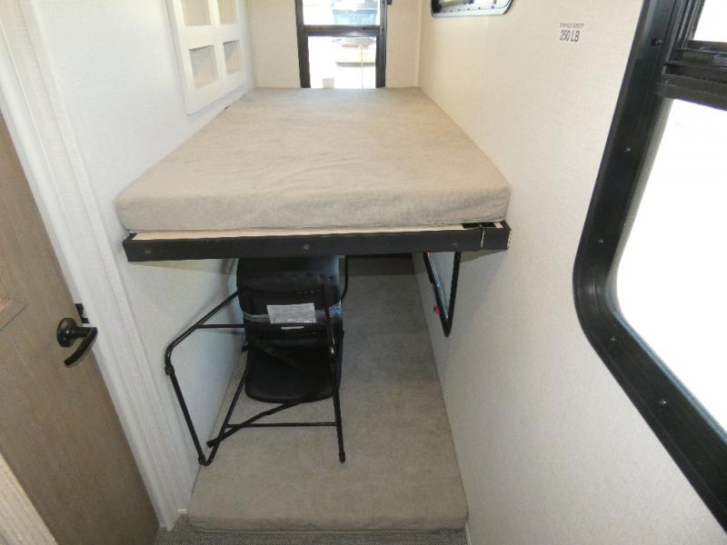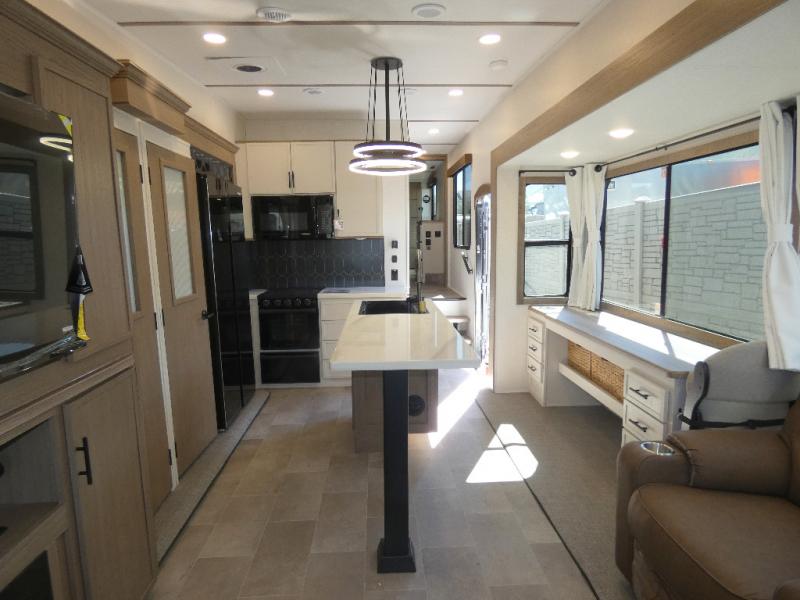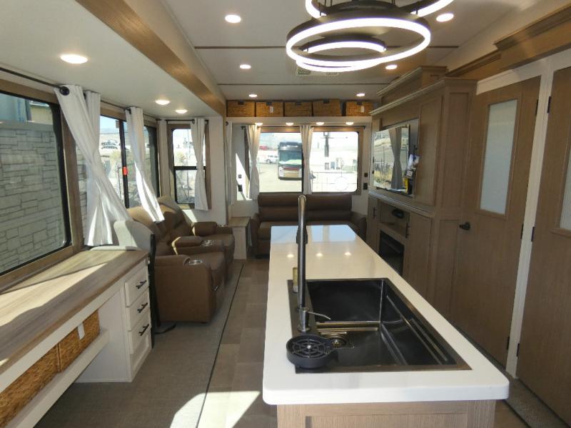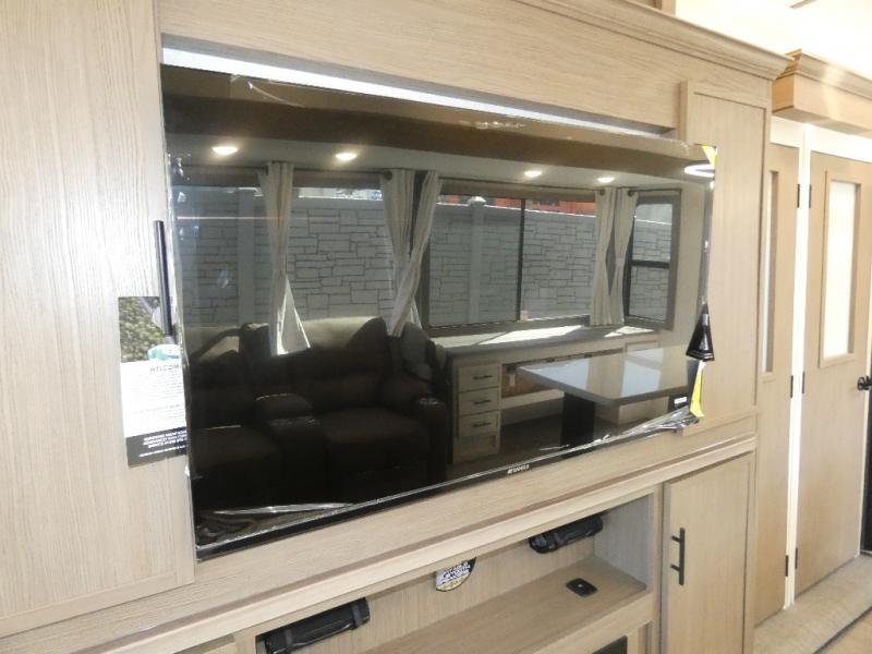 Step inside this luxurious fifth wheel that can sleep five each night! The rear tri-fold hide-a-bed sofa and theater seating provide a relaxing evening by the entertainment center with a 55" TV. Next to the entertainment center is a hidden door with cabinets and 16 cu. ft. 12V refrigerator, and a 36" x 74" flip-down bunk with storage. The kitchen has plenty of countertop space to prepare your best home cooked meals and an island with four bar stools to enjoy your meals. You also have a desk with storage to get some work done if needed. As you walk up the floating steps, you will notice the full bathroom to your left with a walk-in shower with a skylight for added natural lighting and a dual sink vanity for two to get ready at once. The front private bedroom has a king bed with Versa Tilt technology slide, a dresser next to a bench and a front wardrobe that is prepped for a washer and dryer!