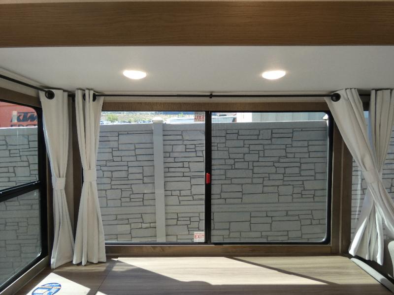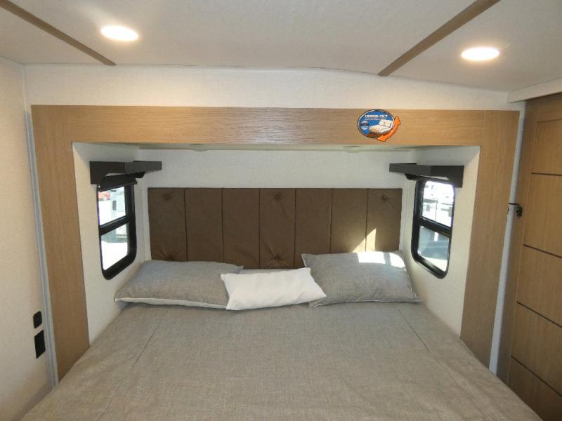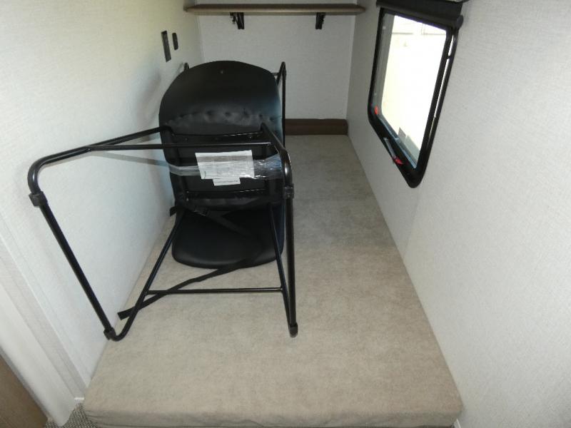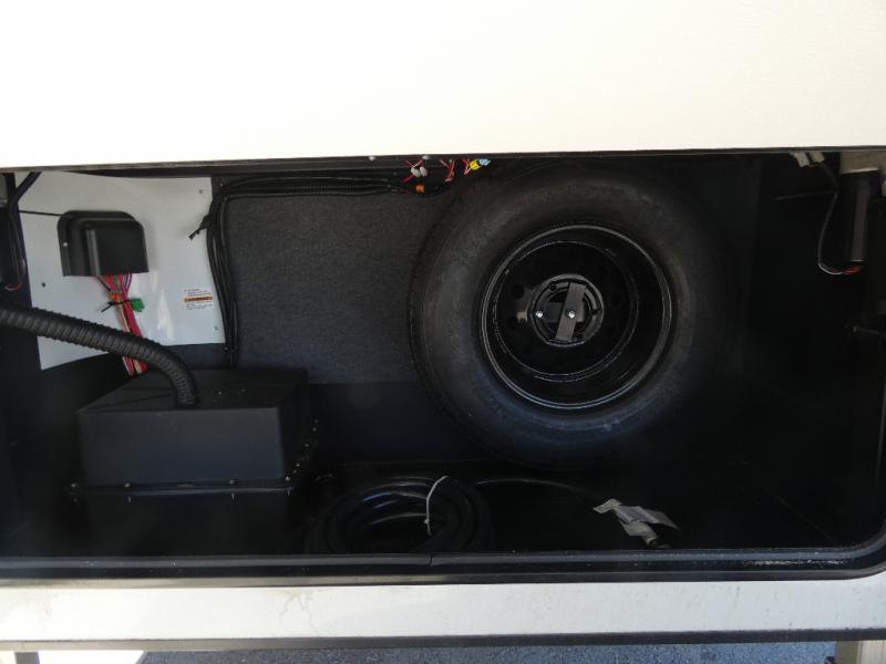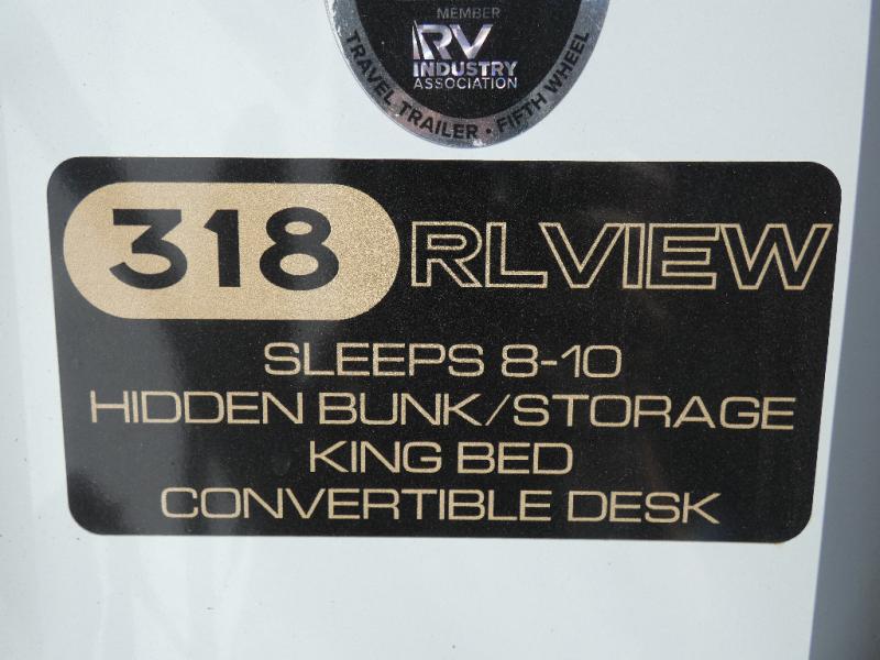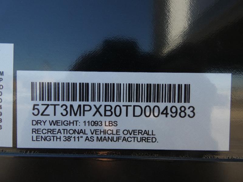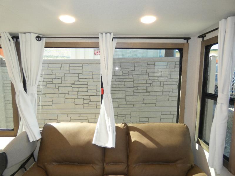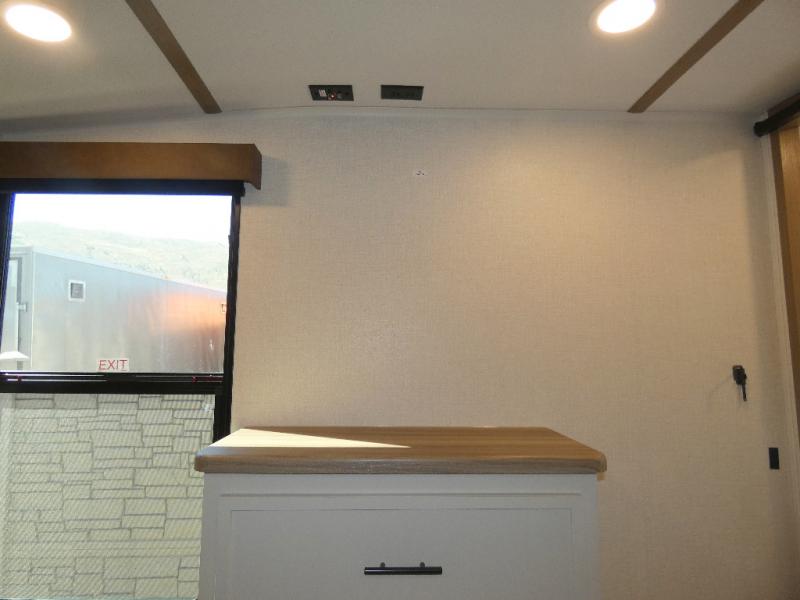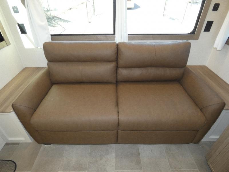 Step inside this luxurious fifth wheel that can sleep five each night! The rear tri-fold hide-a-bed sofa and theater seating provide a relaxing evening by the entertainment center with a 55" TV. Next to the entertainment center is a hidden door with cabinets and 16 cu. ft. 12V refrigerator, and a 36" x 74" flip-down bunk with storage. The kitchen has plenty of countertop space to prepare your best home cooked meals and an island with four bar stools to enjoy your meals. You also have a desk with storage to get some work done if needed. As you walk up the floating steps, you will notice the full bathroom to your left with a walk-in shower with a skylight for added natural lighting and a dual sink vanity for two to get ready at once. The front private bedroom has a king bed with Versa Tilt technology slide, a dresser next to a bench and a front wardrobe that is prepped for a washer and dryer!
