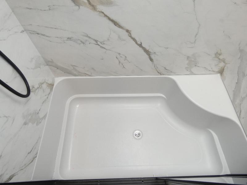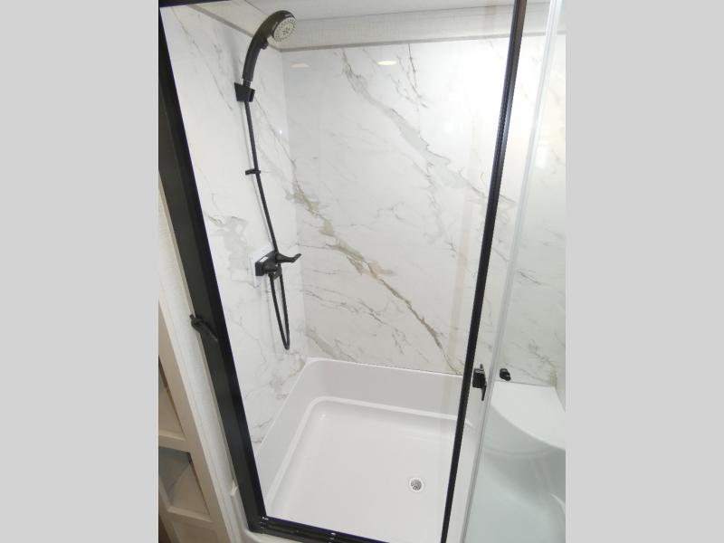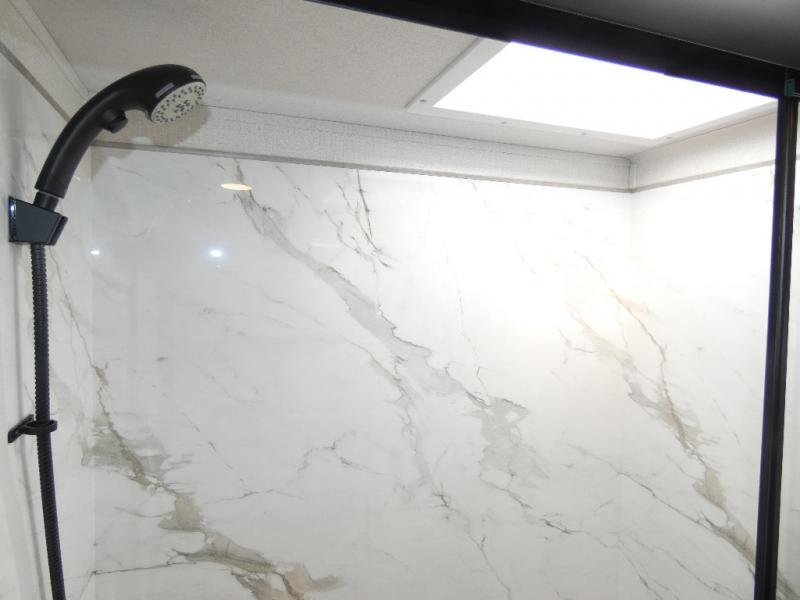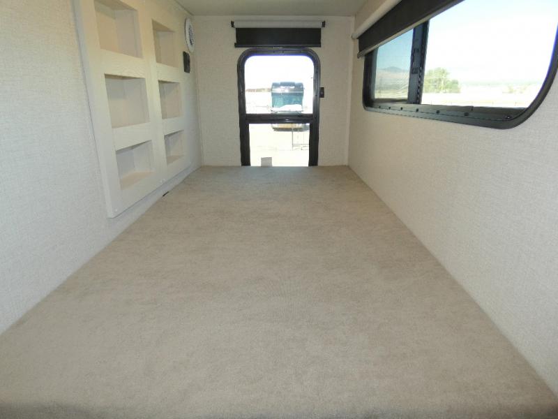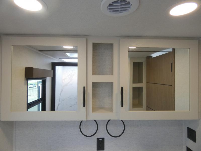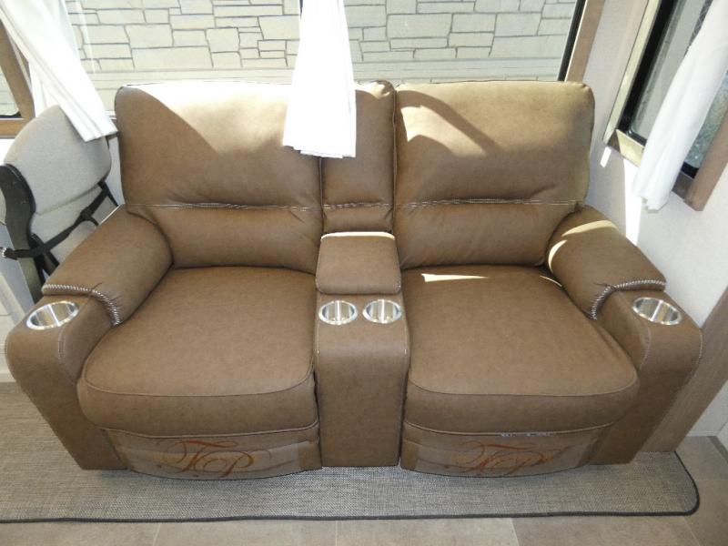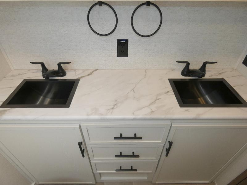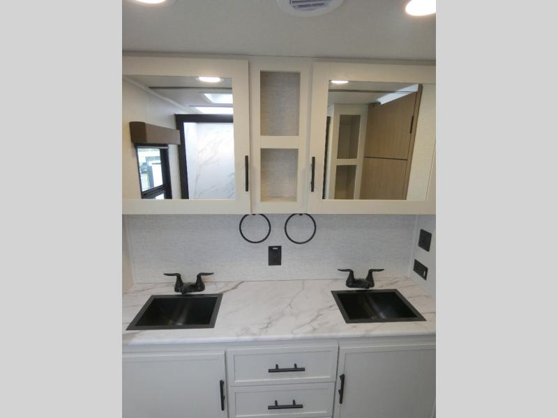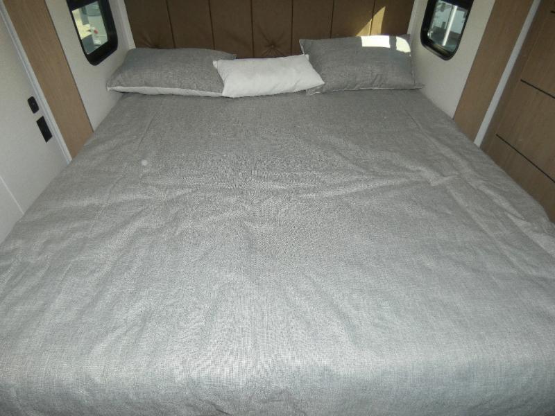 Step inside this luxurious fifth wheel that can sleep five each night! The rear tri-fold hide-a-bed sofa and theater seating provide a relaxing evening by the entertainment center with a 55" TV. Next to the entertainment center is a hidden door with cabinets and 16 cu. ft. 12V refrigerator, and a 36" x 74" flip-down bunk with storage. The kitchen has plenty of countertop space to prepare your best home cooked meals and an island with four bar stools to enjoy your meals. You also have a desk with storage to get some work done if needed. As you walk up the floating steps, you will notice the full bathroom to your left with a walk-in shower with a skylight for added natural lighting and a dual sink vanity for two to get ready at once. The front private bedroom has a king bed with Versa Tilt technology slide, a dresser next to a bench and a front wardrobe that is prepped for a washer and dryer!