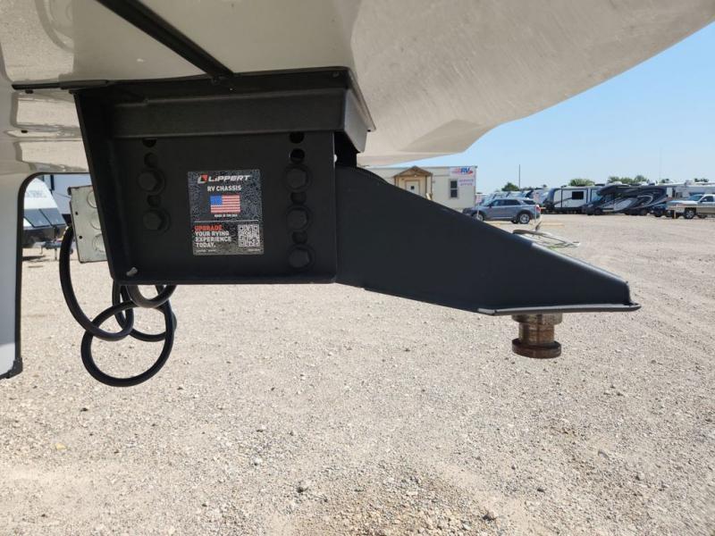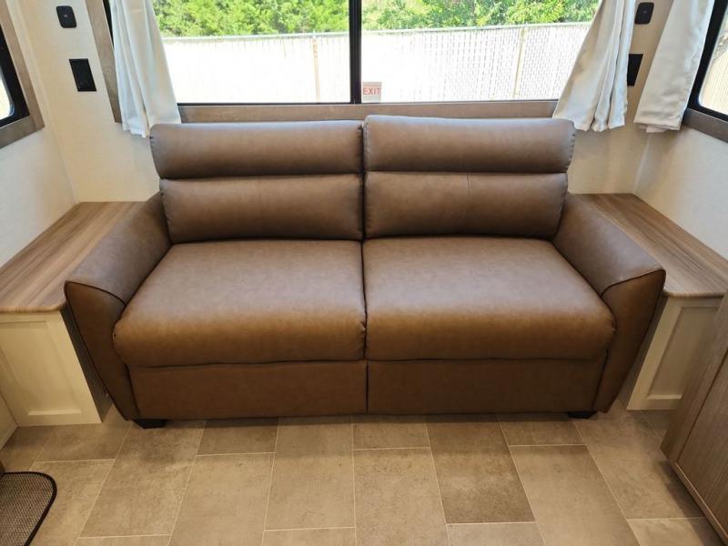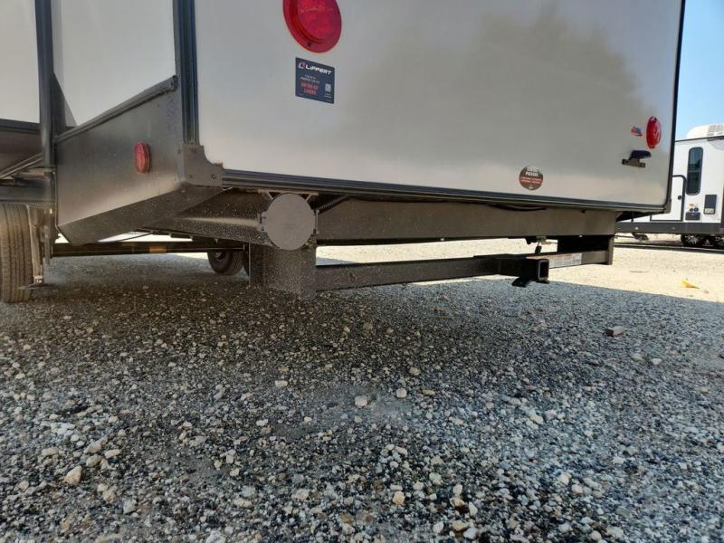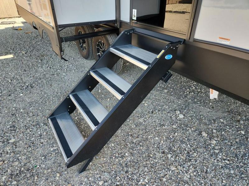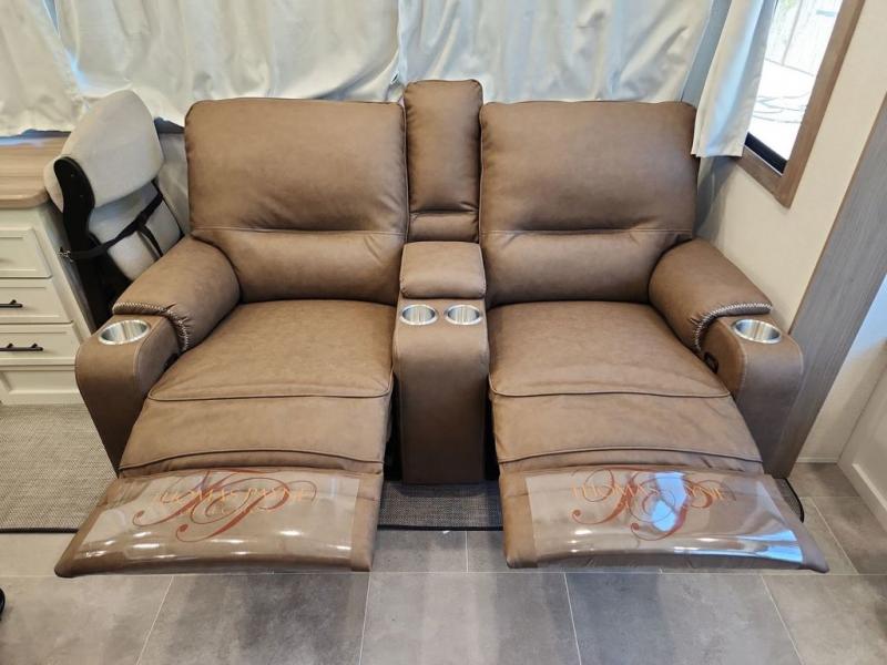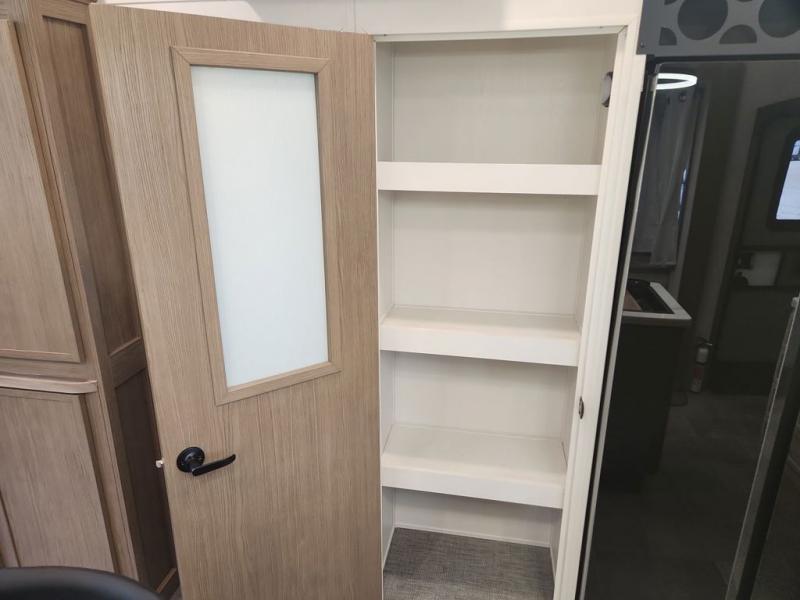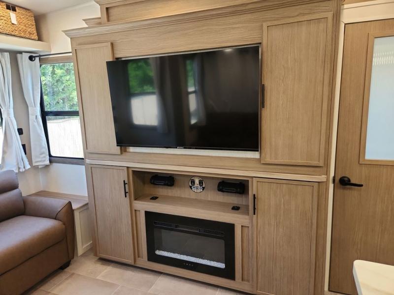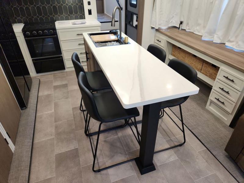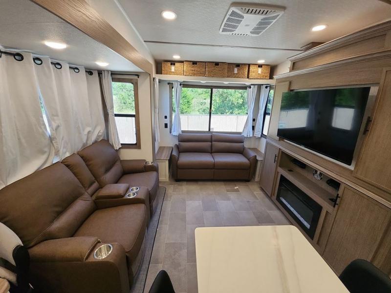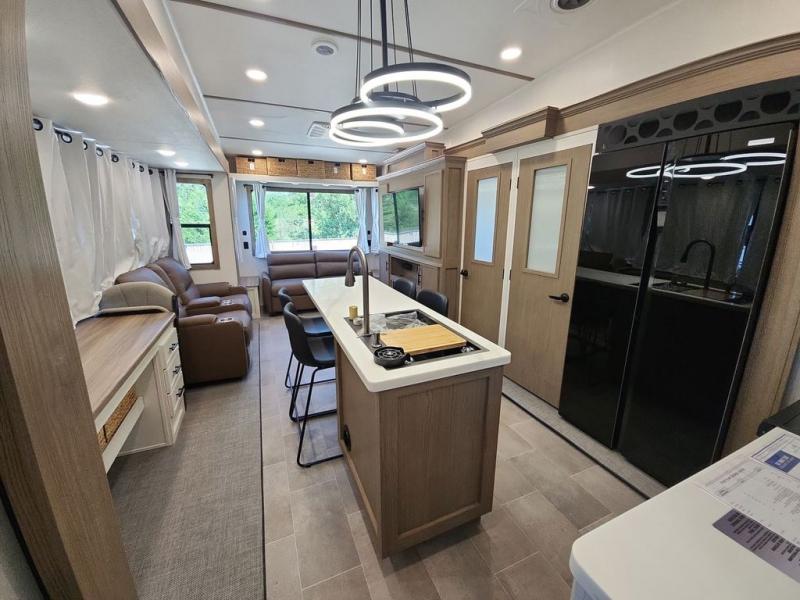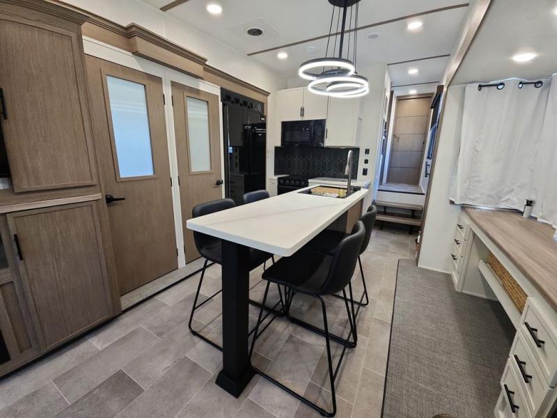 Step inside this luxurious fifth wheel that can sleep five each night! The rear tri-fold hide-a-bed sofa and theater seating provide a relaxing evening by the entertainment center with a 55" TV. Next to the entertainment center is a hidden door with cabinets and 16 cu. ft. 12V refrigerator, and a 36" x 74" flip-down bunk with storage. The kitchen has plenty of countertop space to prepare your best home cooked meals and an island with four bar stools to enjoy your meals. You also have a desk with storage to get some work done if needed. As you walk up the floating steps, you will notice the full bathroom to your left with a walk-in shower with a skylight for added natural lighting and a dual sink vanity for two to get ready at once. The front private bedroom has a king bed with Versa Tilt technology slide, a dresser next to a bench and a front wardrobe that is prepped for a washer and dryer!
