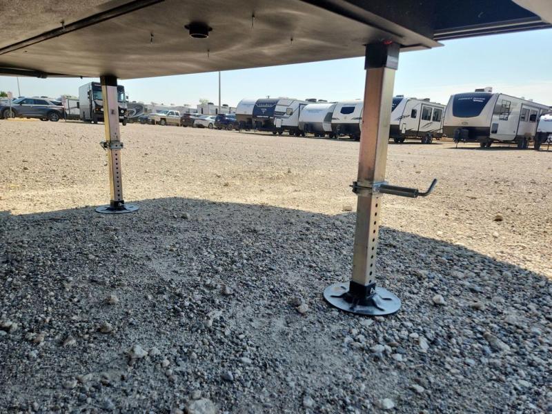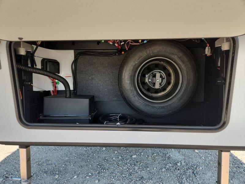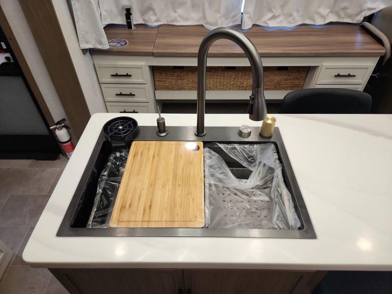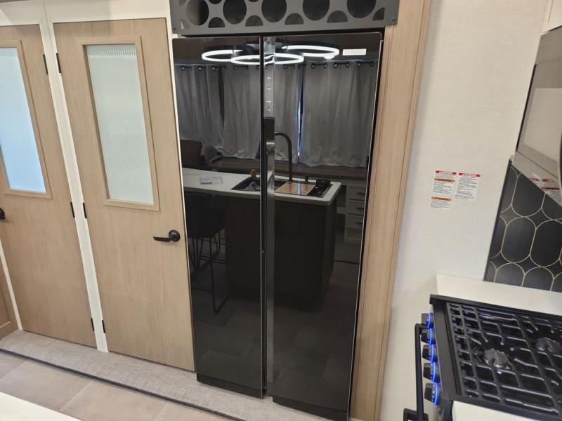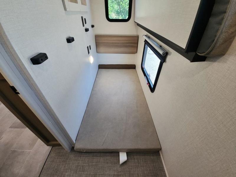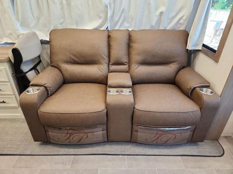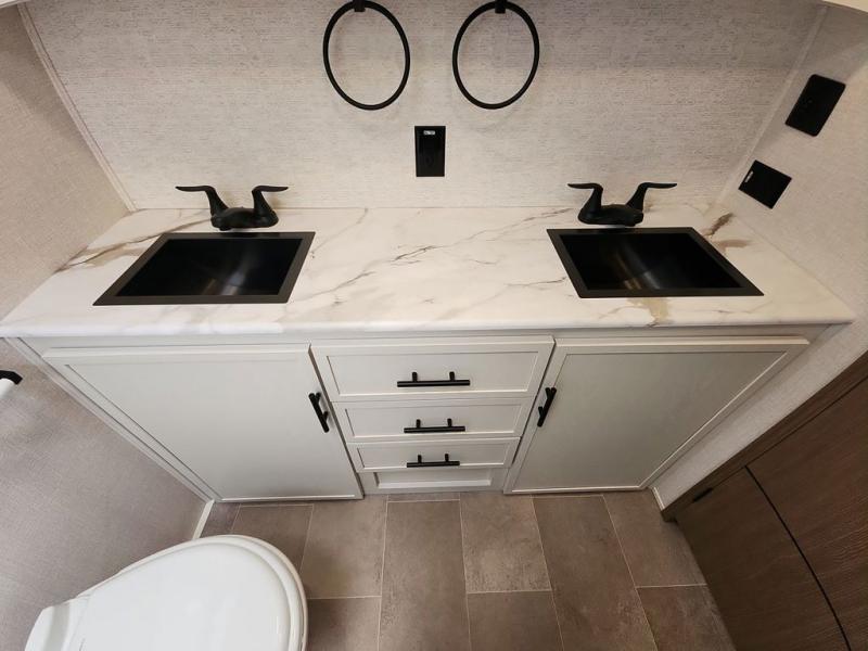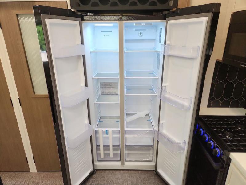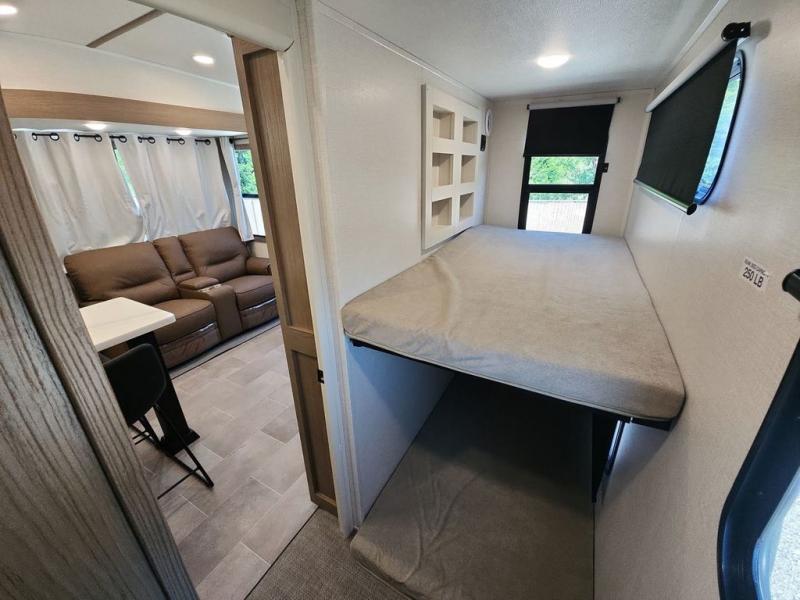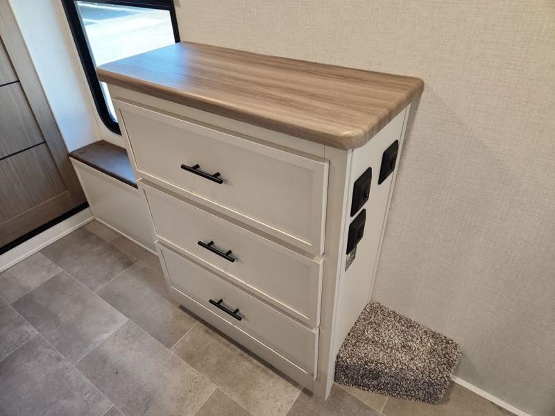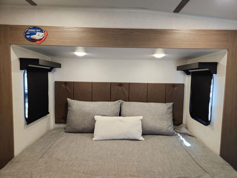 Step inside this luxurious fifth wheel that can sleep five each night! The rear tri-fold hide-a-bed sofa and theater seating provide a relaxing evening by the entertainment center with a 55" TV. Next to the entertainment center is a hidden door with cabinets and 16 cu. ft. 12V refrigerator, and a 36" x 74" flip-down bunk with storage. The kitchen has plenty of countertop space to prepare your best home cooked meals and an island with four bar stools to enjoy your meals. You also have a desk with storage to get some work done if needed. As you walk up the floating steps, you will notice the full bathroom to your left with a walk-in shower with a skylight for added natural lighting and a dual sink vanity for two to get ready at once. The front private bedroom has a king bed with Versa Tilt technology slide, a dresser next to a bench and a front wardrobe that is prepped for a washer and dryer!