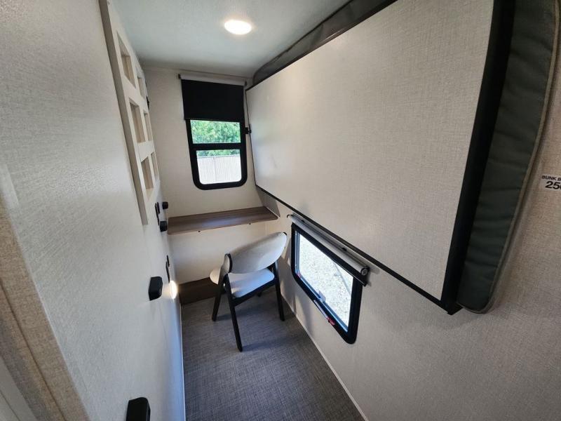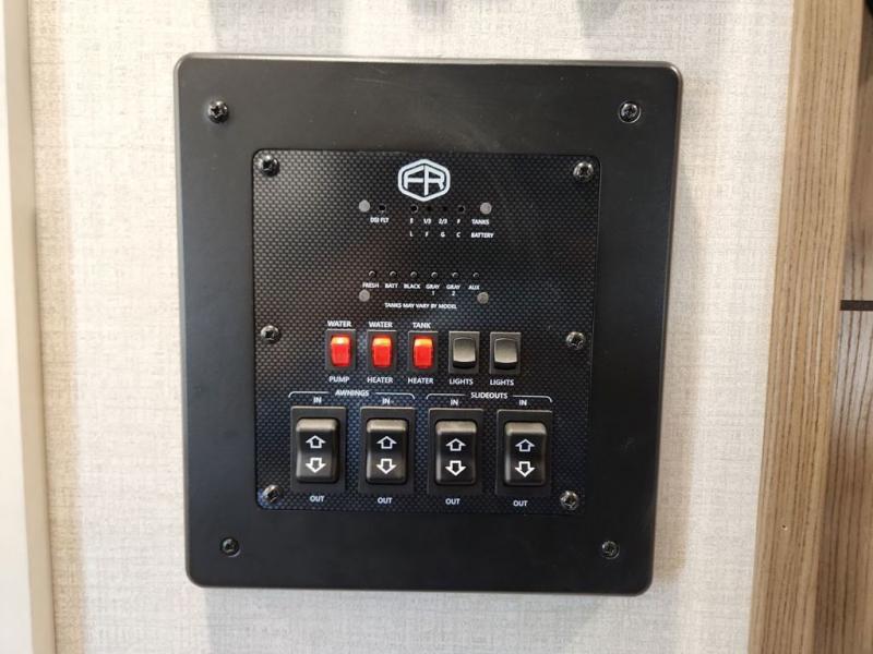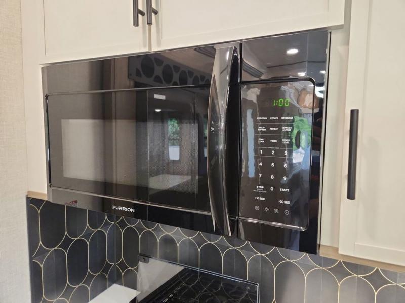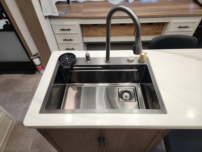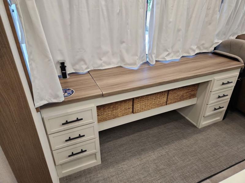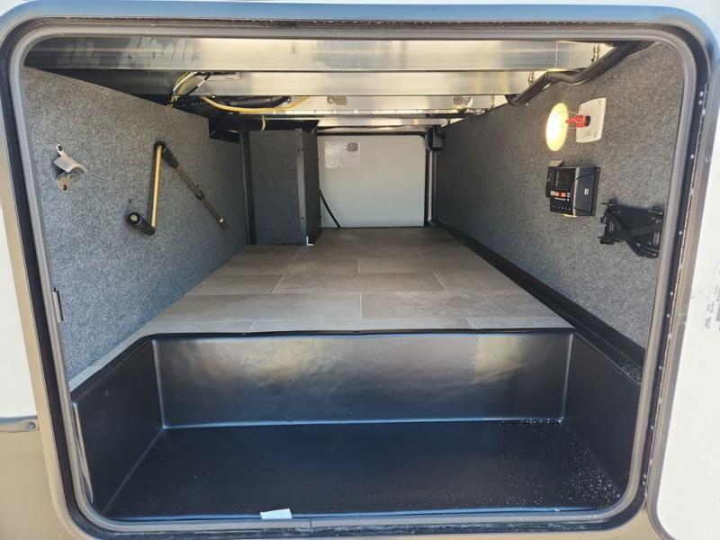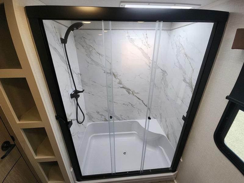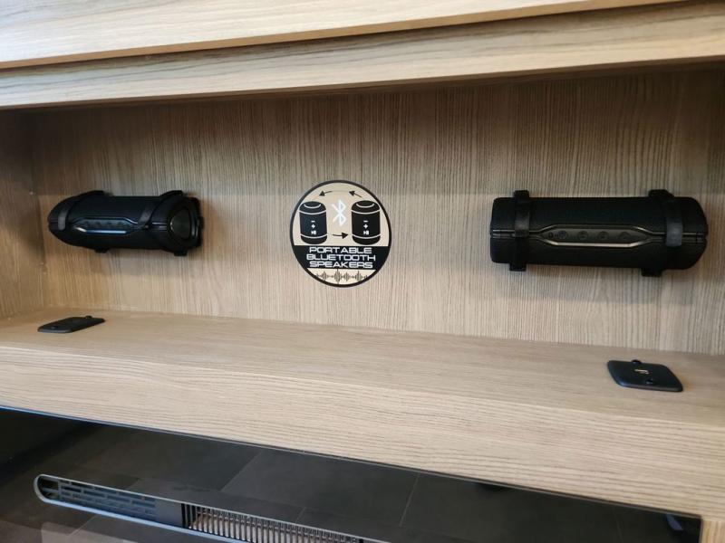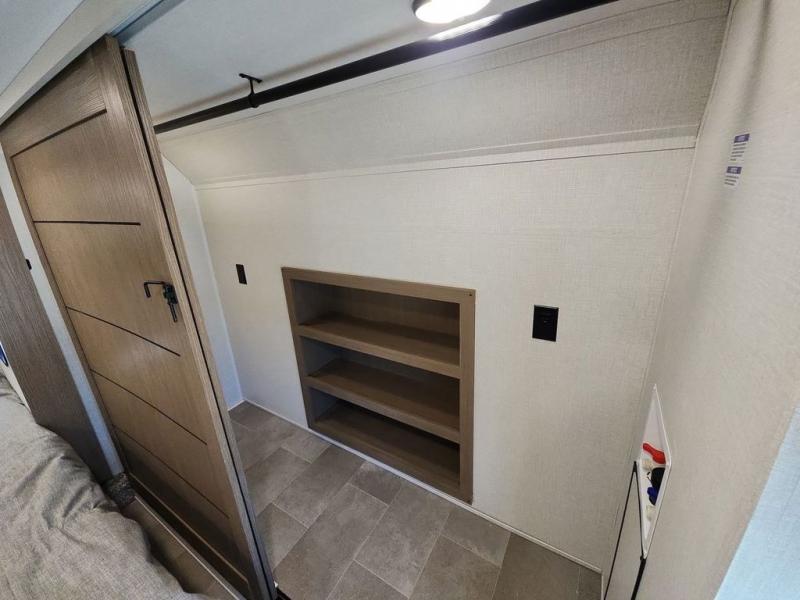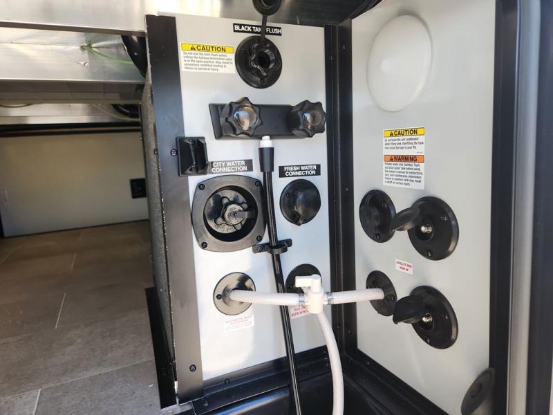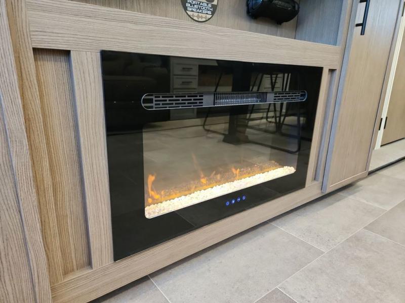 Step inside this luxurious fifth wheel that can sleep five each night! The rear tri-fold hide-a-bed sofa and theater seating provide a relaxing evening by the entertainment center with a 55" TV. Next to the entertainment center is a hidden door with cabinets and 16 cu. ft. 12V refrigerator, and a 36" x 74" flip-down bunk with storage. The kitchen has plenty of countertop space to prepare your best home cooked meals and an island with four bar stools to enjoy your meals. You also have a desk with storage to get some work done if needed. As you walk up the floating steps, you will notice the full bathroom to your left with a walk-in shower with a skylight for added natural lighting and a dual sink vanity for two to get ready at once. The front private bedroom has a king bed with Versa Tilt technology slide, a dresser next to a bench and a front wardrobe that is prepped for a washer and dryer!
