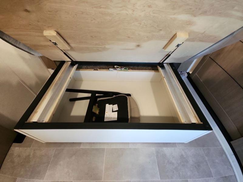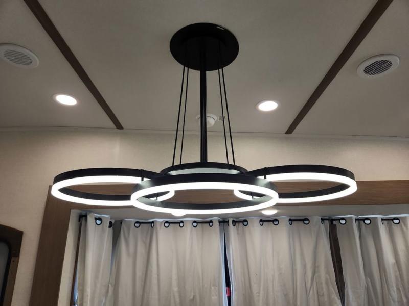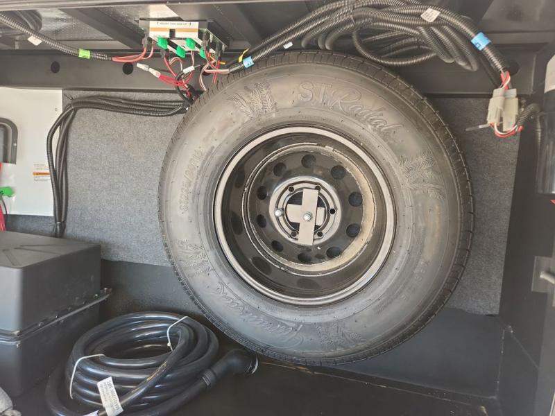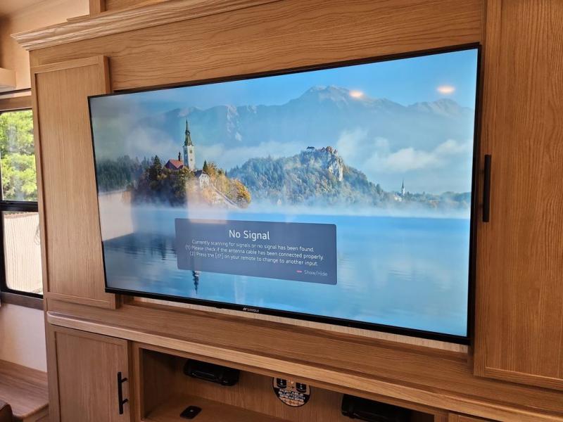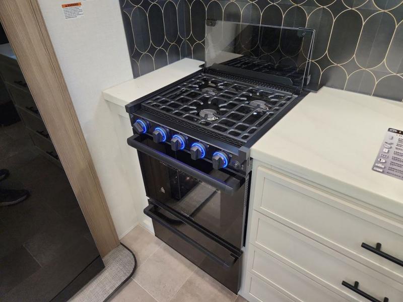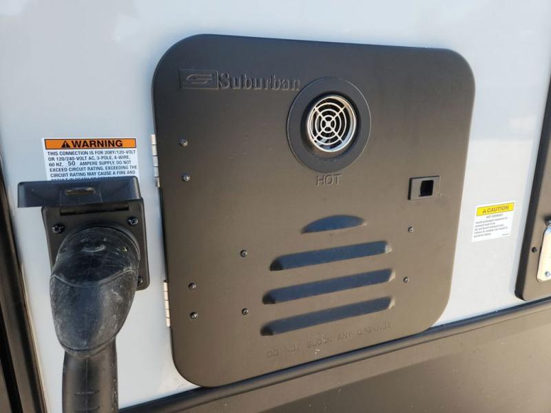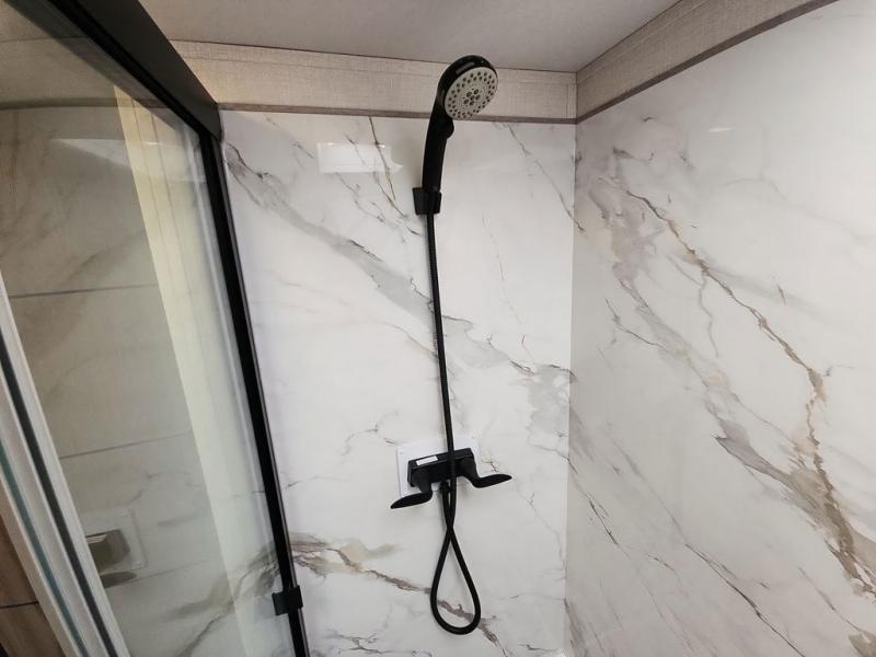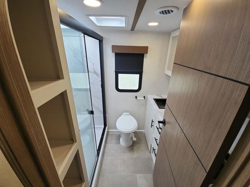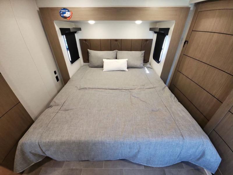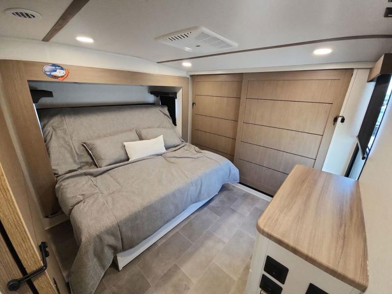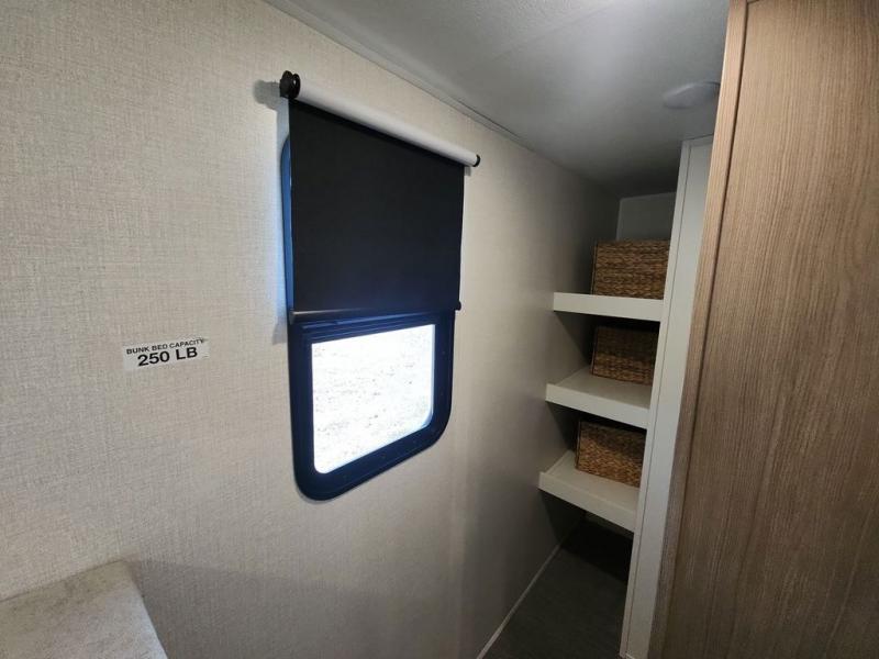 Step inside this luxurious fifth wheel that can sleep five each night! The rear tri-fold hide-a-bed sofa and theater seating provide a relaxing evening by the entertainment center with a 55" TV. Next to the entertainment center is a hidden door with cabinets and 16 cu. ft. 12V refrigerator, and a 36" x 74" flip-down bunk with storage. The kitchen has plenty of countertop space to prepare your best home cooked meals and an island with four bar stools to enjoy your meals. You also have a desk with storage to get some work done if needed. As you walk up the floating steps, you will notice the full bathroom to your left with a walk-in shower with a skylight for added natural lighting and a dual sink vanity for two to get ready at once. The front private bedroom has a king bed with Versa Tilt technology slide, a dresser next to a bench and a front wardrobe that is prepped for a washer and dryer!
