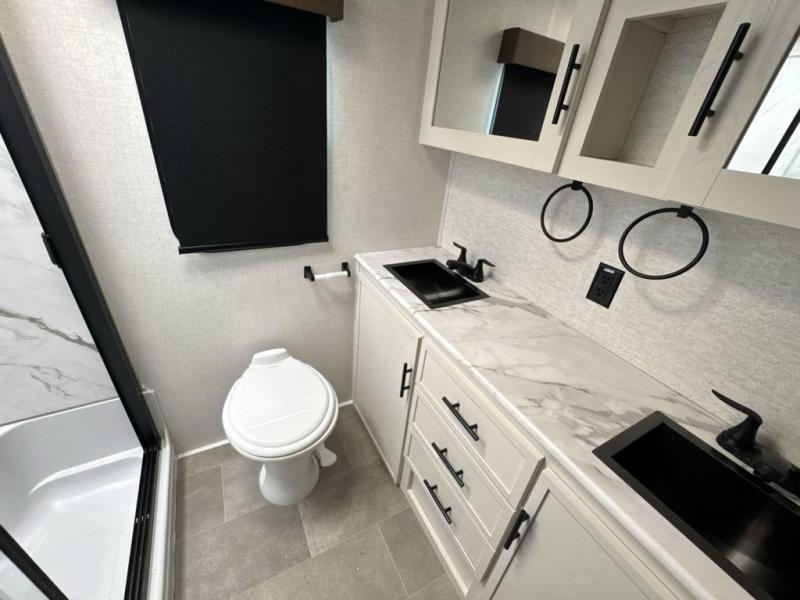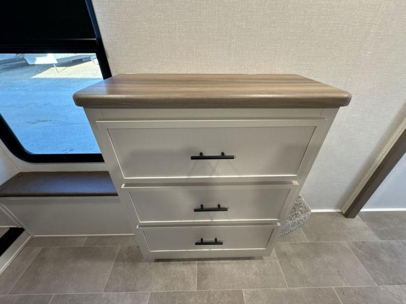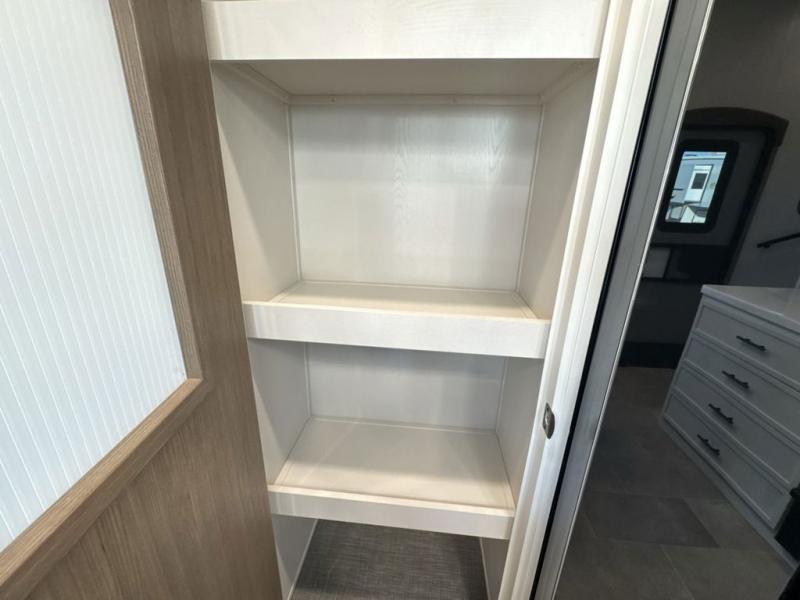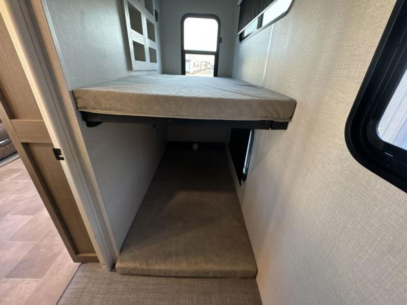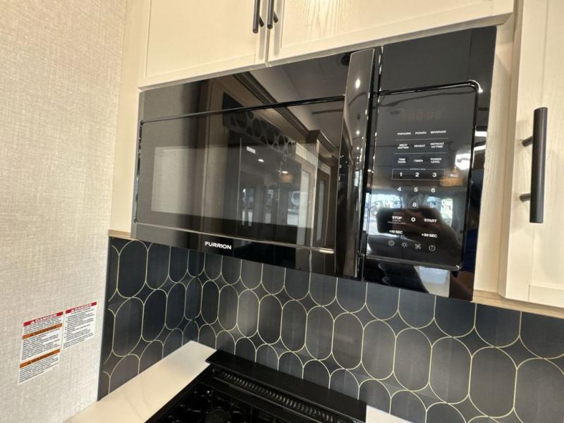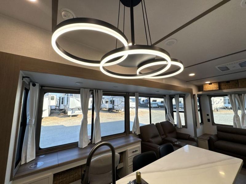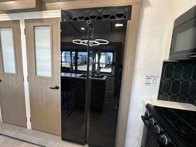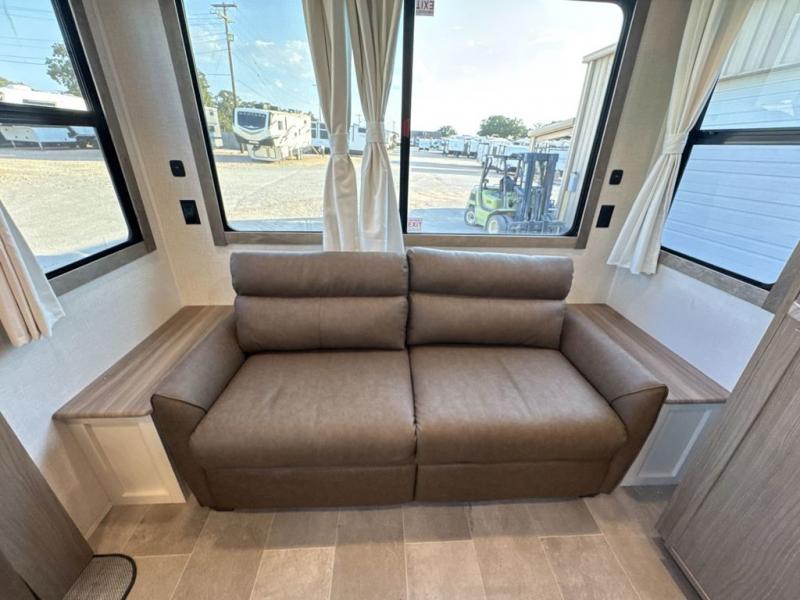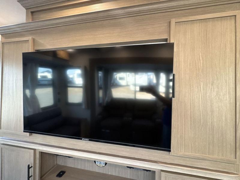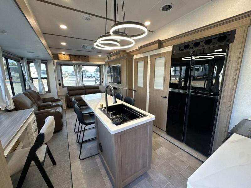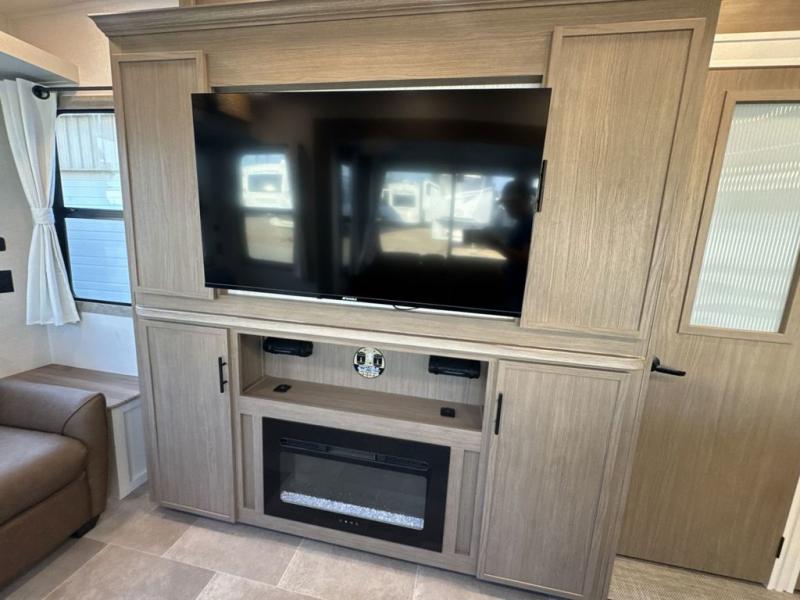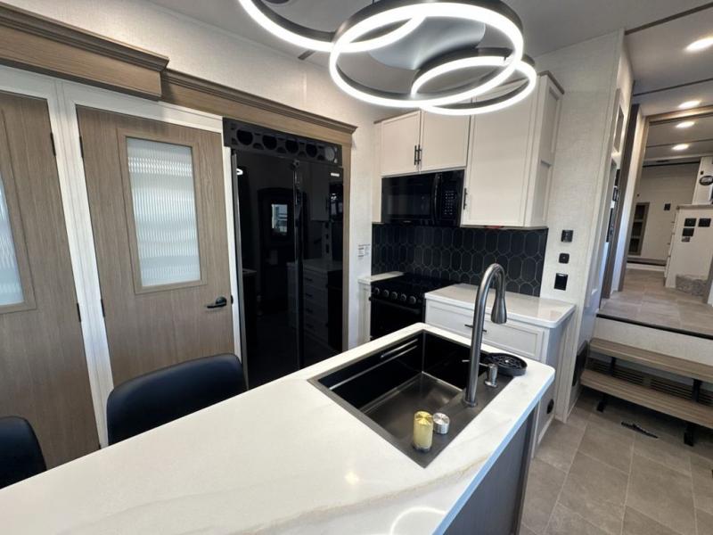 Step inside this luxurious fifth wheel that can sleep five each night! The rear tri-fold hide-a-bed sofa and theater seating provide a relaxing evening by the entertainment center with a 55" TV. Next to the entertainment center is a hidden door with cabinets and 16 cu. ft. 12V refrigerator, and a 36" x 74" flip-down bunk with storage. The kitchen has plenty of countertop space to prepare your best home cooked meals and an island with four bar stools to enjoy your meals. You also have a desk with storage to get some work done if needed. As you walk up the floating steps, you will notice the full bathroom to your left with a walk-in shower with a skylight for added natural lighting and a dual sink vanity for two to get ready at once. The front private bedroom has a king bed with Versa Tilt technology slide, a dresser next to a bench and a front wardrobe that is prepped for a washer and dryer!