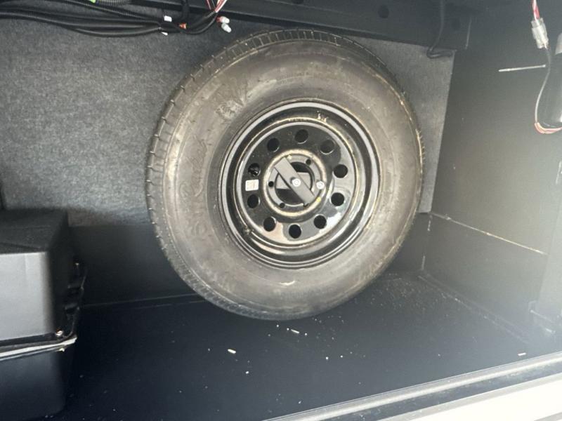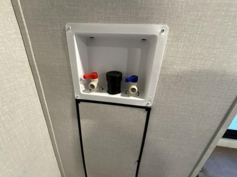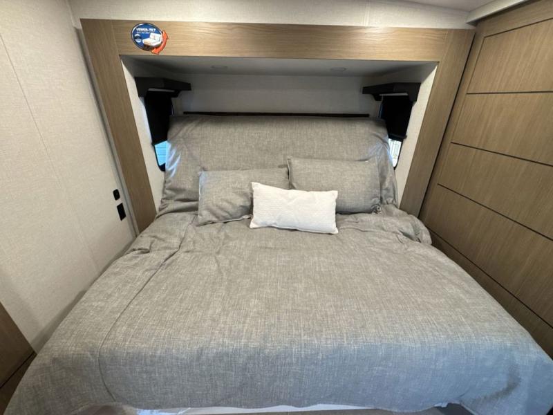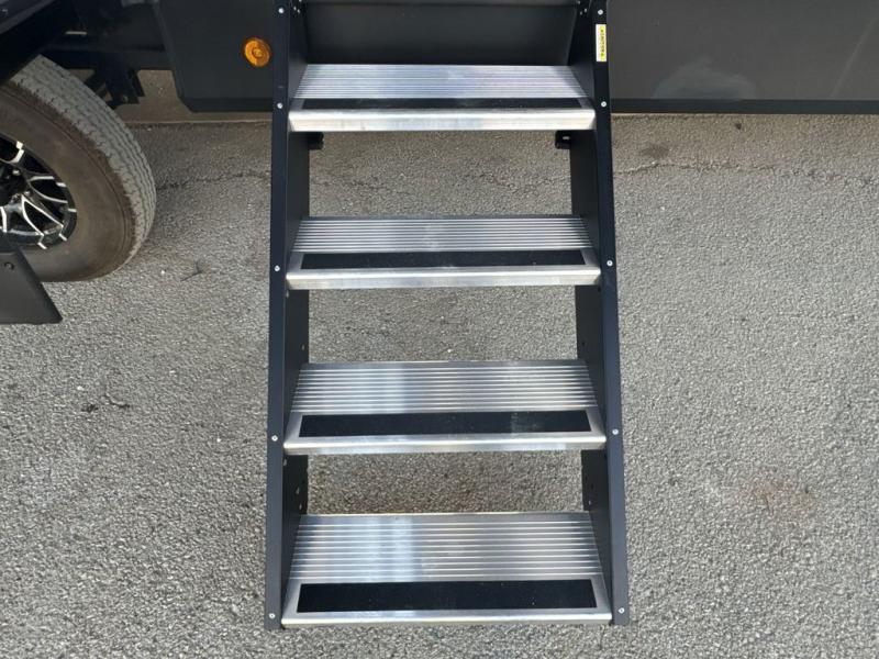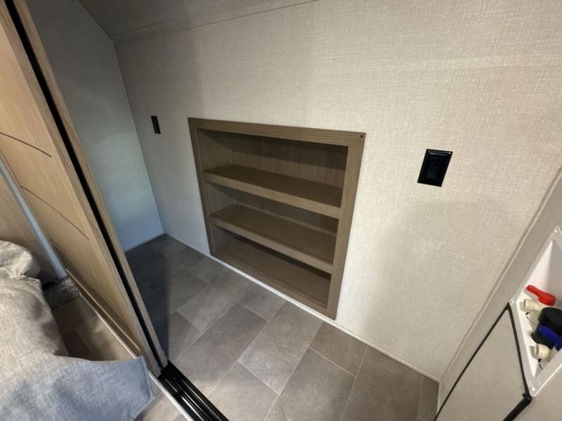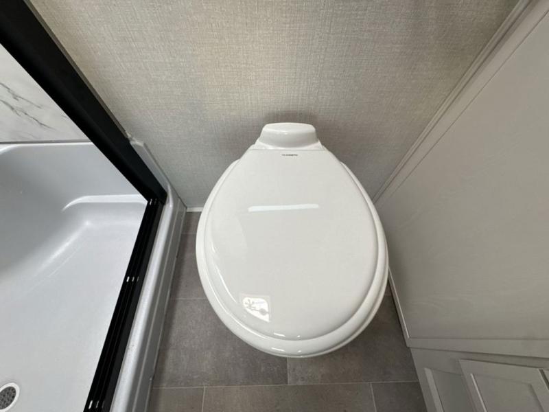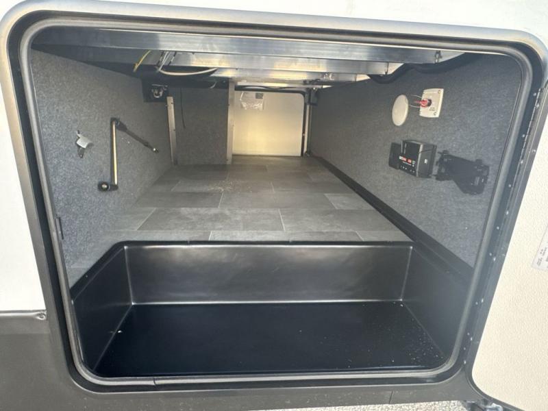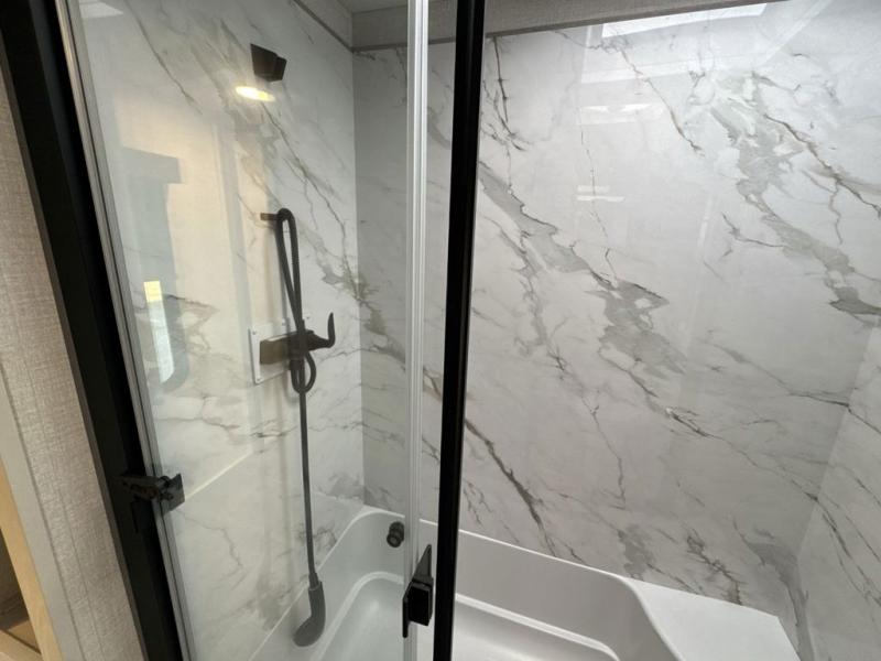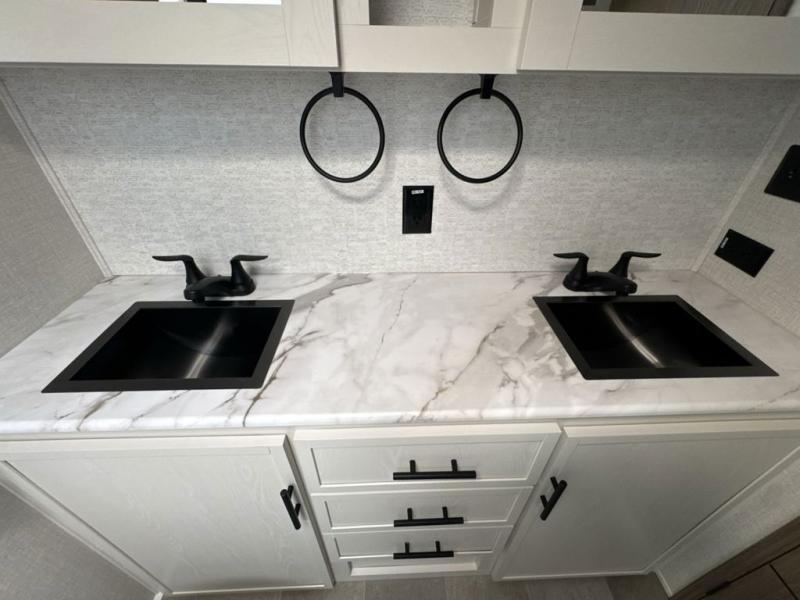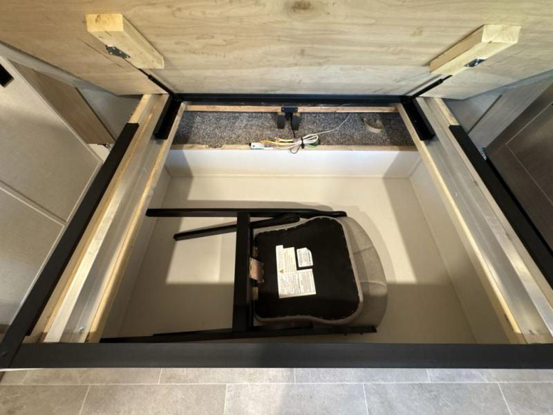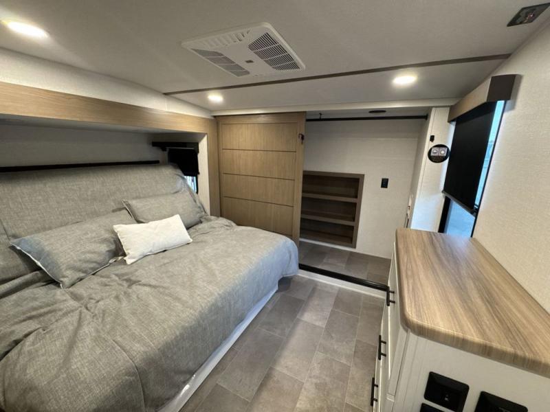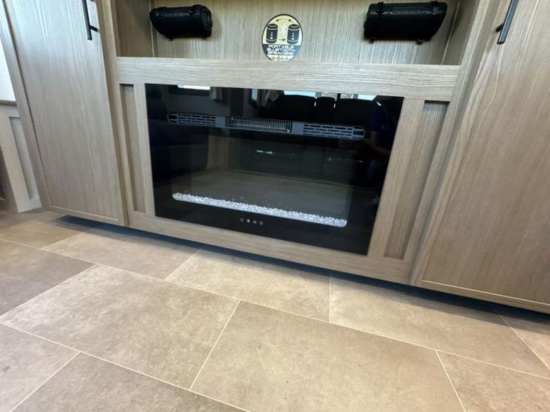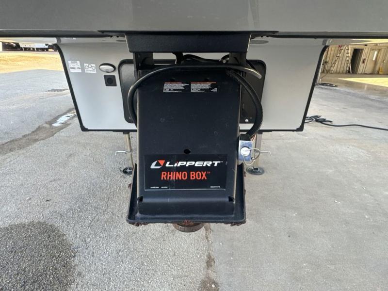 Step inside this luxurious fifth wheel that can sleep five each night! The rear tri-fold hide-a-bed sofa and theater seating provide a relaxing evening by the entertainment center with a 55" TV. Next to the entertainment center is a hidden door with cabinets and 16 cu. ft. 12V refrigerator, and a 36" x 74" flip-down bunk with storage. The kitchen has plenty of countertop space to prepare your best home cooked meals and an island with four bar stools to enjoy your meals. You also have a desk with storage to get some work done if needed. As you walk up the floating steps, you will notice the full bathroom to your left with a walk-in shower with a skylight for added natural lighting and a dual sink vanity for two to get ready at once. The front private bedroom has a king bed with Versa Tilt technology slide, a dresser next to a bench and a front wardrobe that is prepped for a washer and dryer!