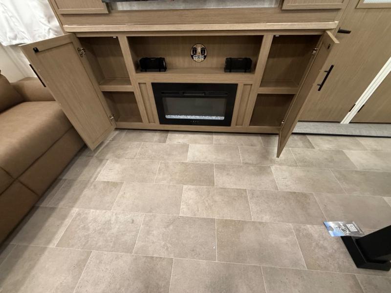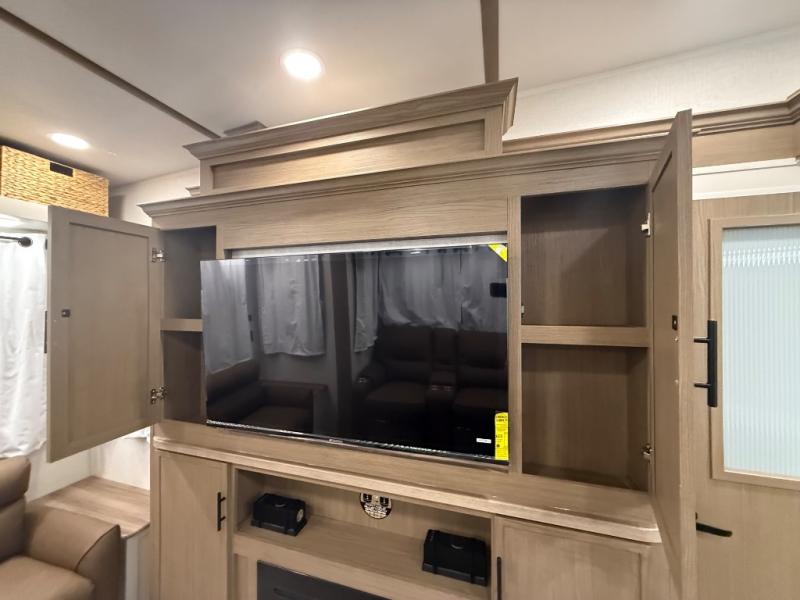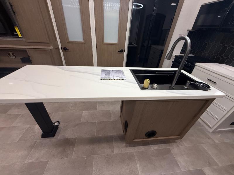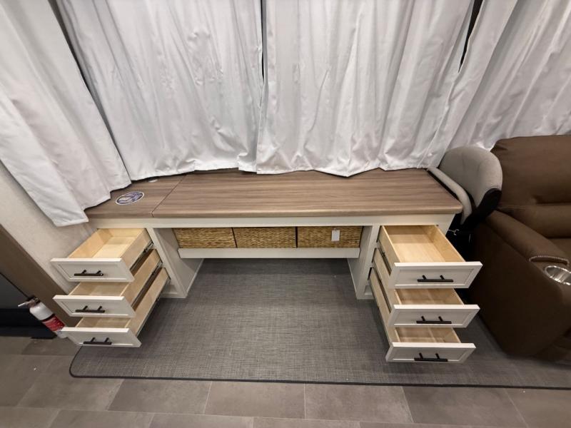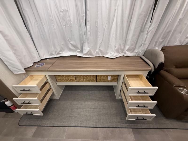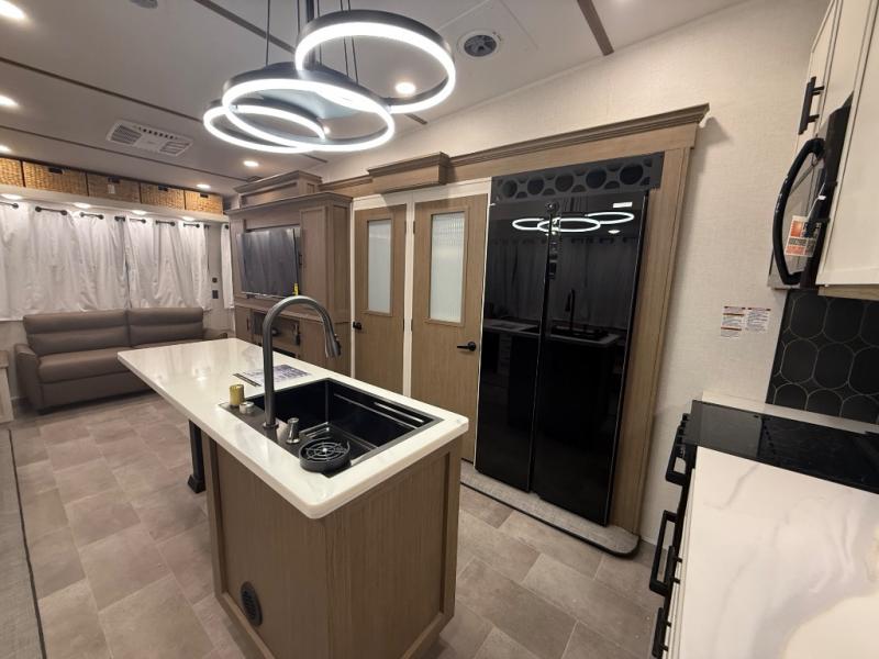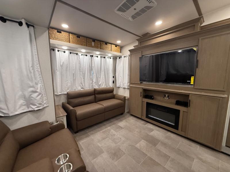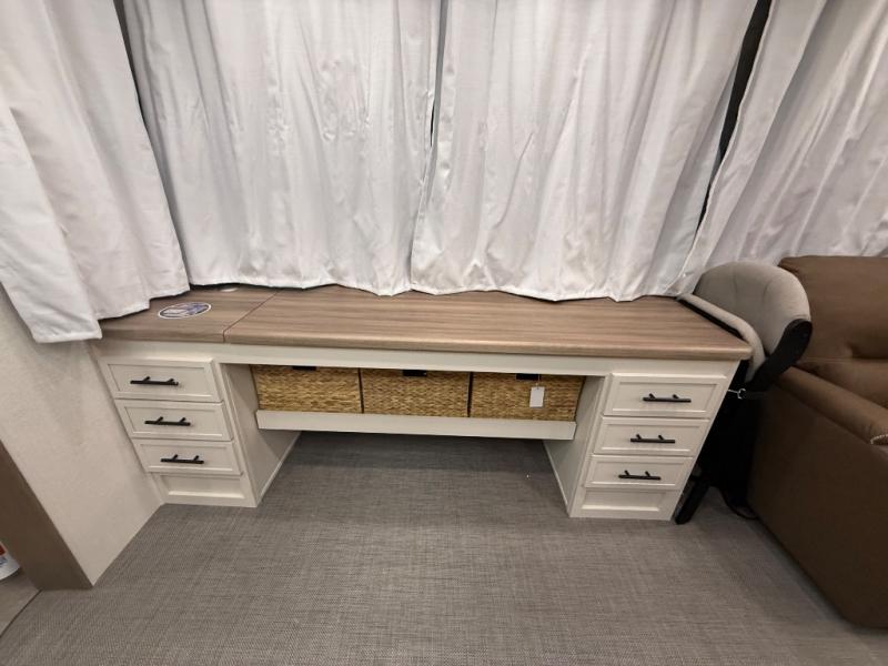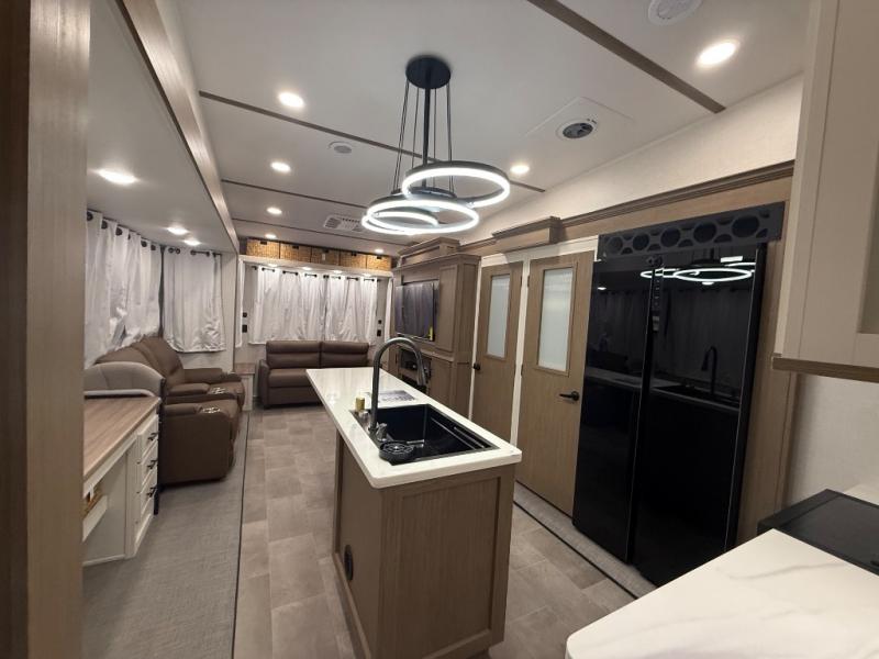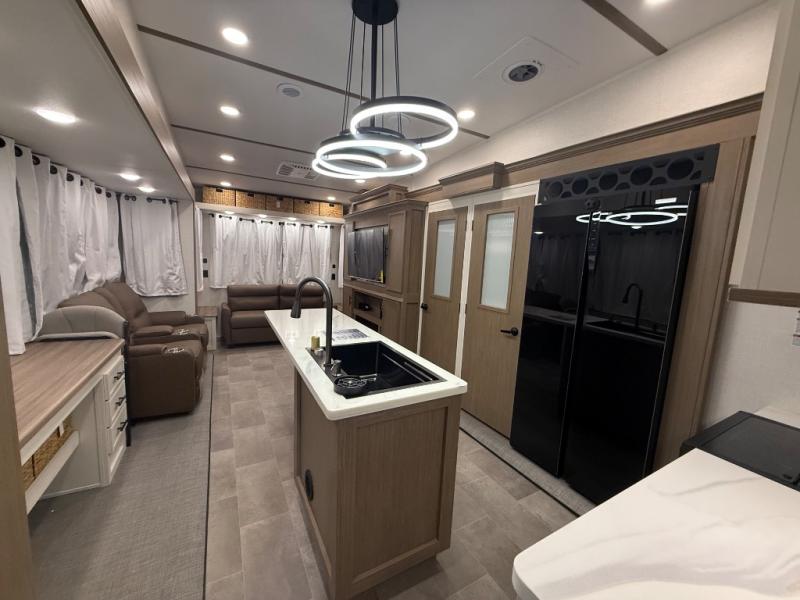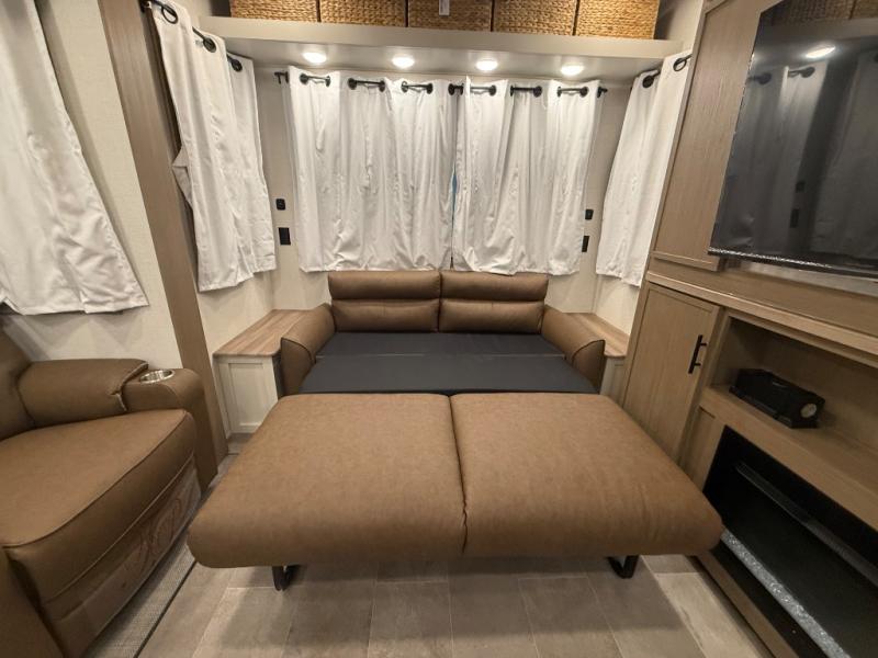 Step inside this luxurious fifth wheel that can sleep the whole gang each night! The rear tri-fold hide-a-bed sofa and theater seating provide a relaxing evening by the entertainment center with a TV. Next to the entertainment center is a hidden door with cabinets and 16 cu. ft. 12V refrigerator, and a 36" x 74" flip-down bunk with storage. The kitchen has plenty of countertop space to prepare your best home cooked meals and an island with four bar stools to enjoy your meals. You also have a desk with storage to get some work done if needed. As you walk up the floating steps, you will notice the full bathroom to your left with a walk-in shower with a skylight for added natural lighting and a dual sink vanity for two to get ready at once. The front private bedroom has a king bed with Versa Tilt technology slide, a dresser next to a bench and a front wardrobe that is prepped for a washer and dryer!