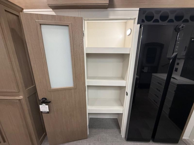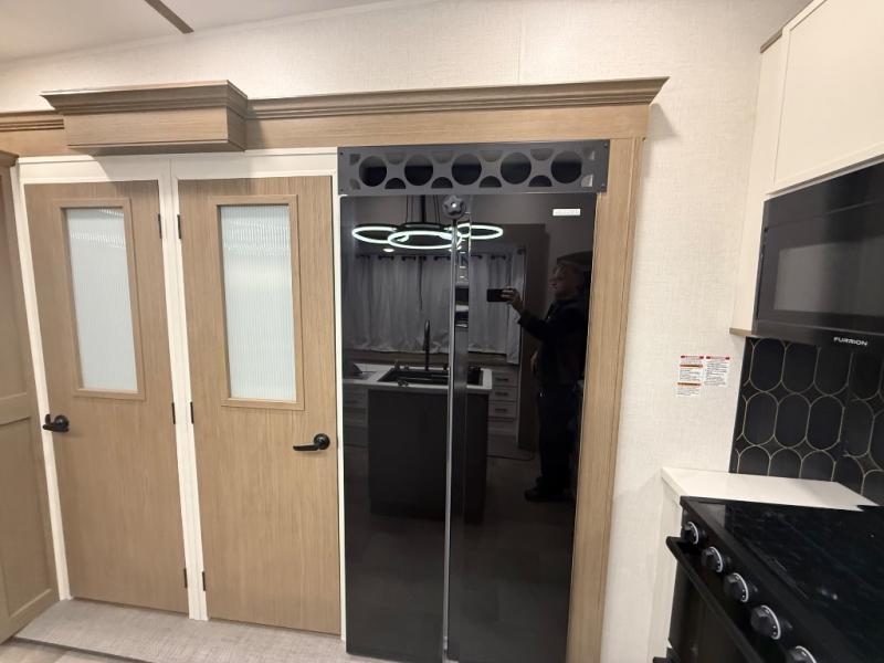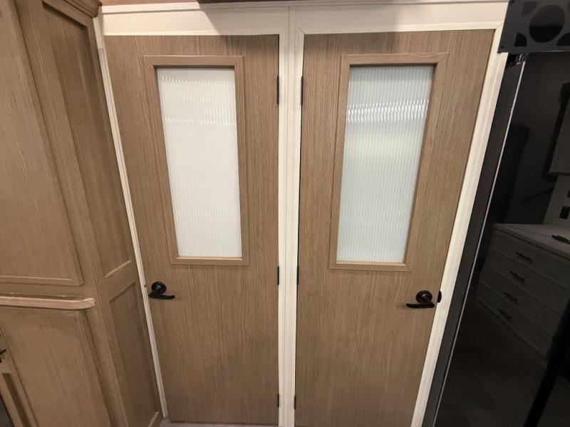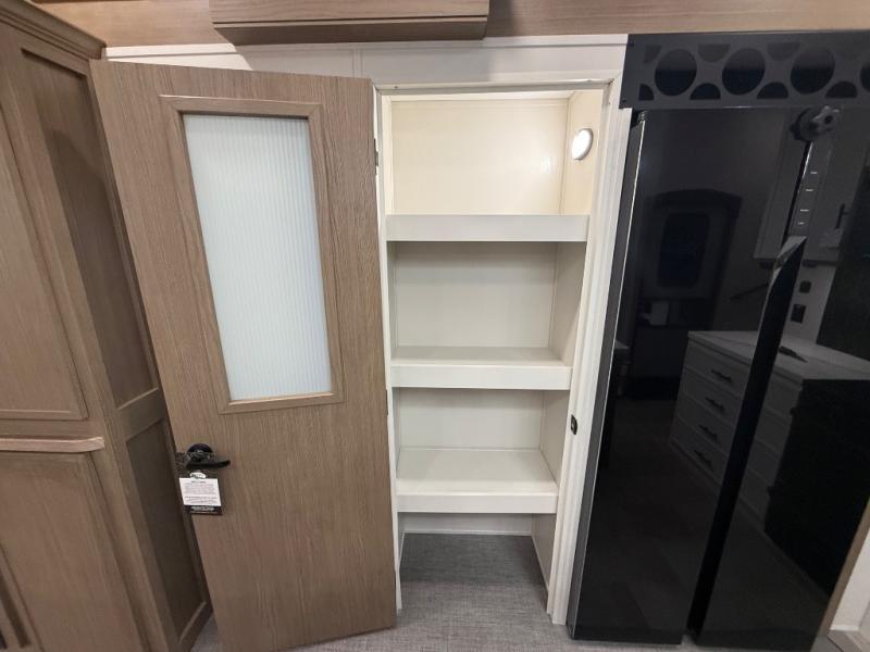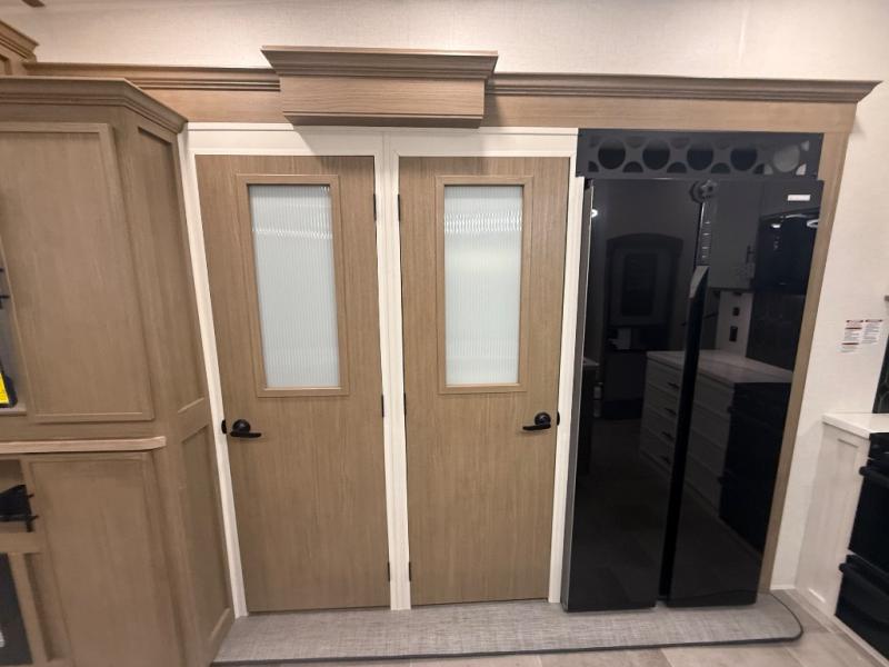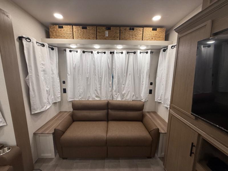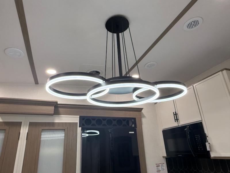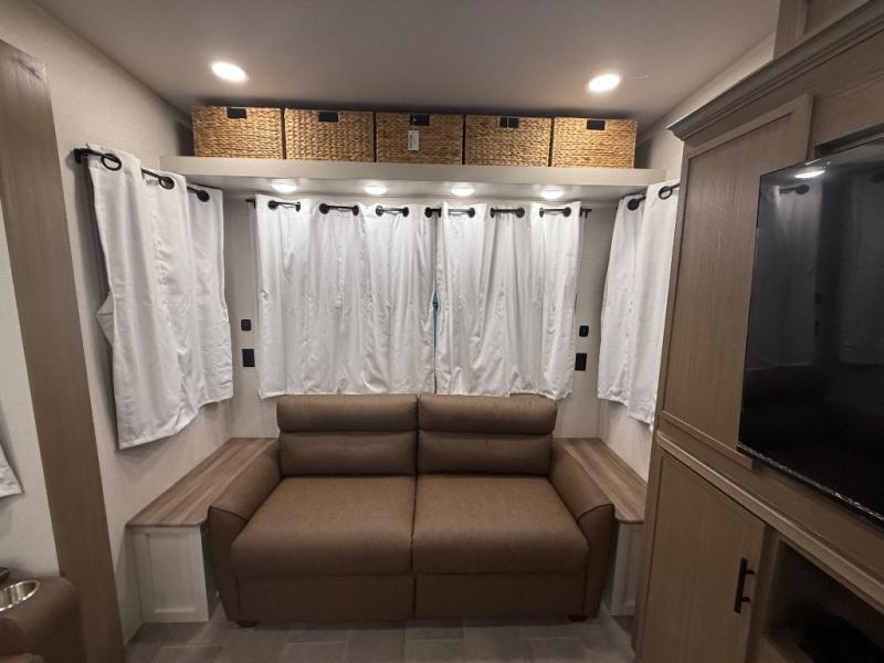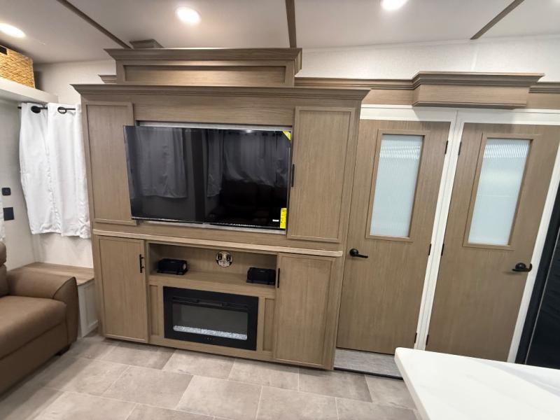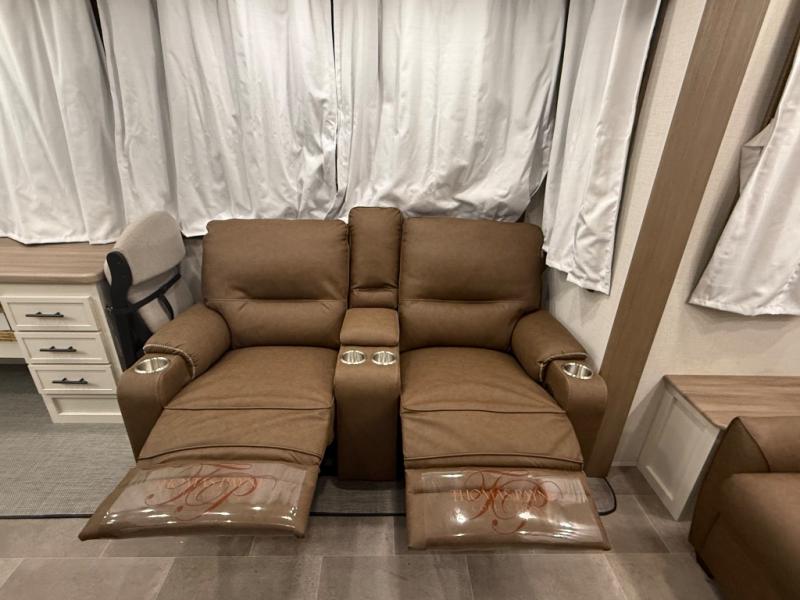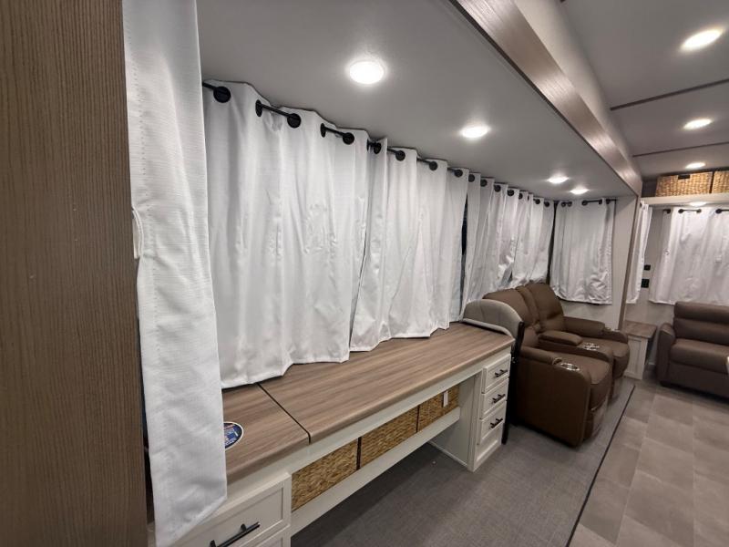 Step inside this luxurious fifth wheel that can sleep the whole gang each night! The rear tri-fold hide-a-bed sofa and theater seating provide a relaxing evening by the entertainment center with a TV. Next to the entertainment center is a hidden door with cabinets and 16 cu. ft. 12V refrigerator, and a 36" x 74" flip-down bunk with storage. The kitchen has plenty of countertop space to prepare your best home cooked meals and an island with four bar stools to enjoy your meals. You also have a desk with storage to get some work done if needed. As you walk up the floating steps, you will notice the full bathroom to your left with a walk-in shower with a skylight for added natural lighting and a dual sink vanity for two to get ready at once. The front private bedroom has a king bed with Versa Tilt technology slide, a dresser next to a bench and a front wardrobe that is prepped for a washer and dryer!