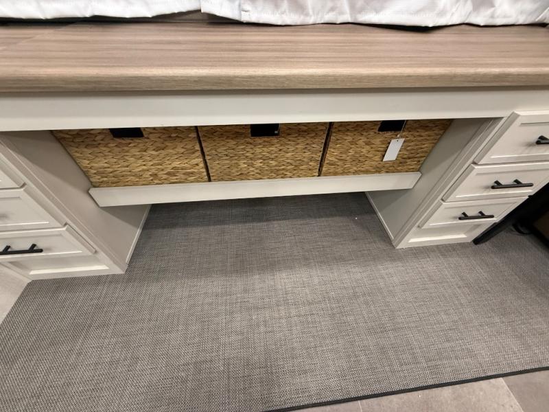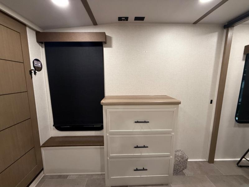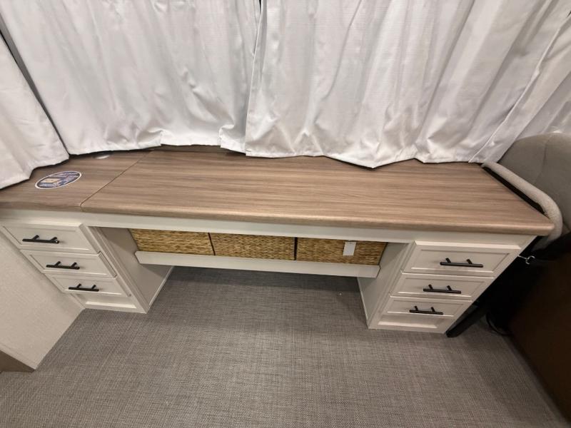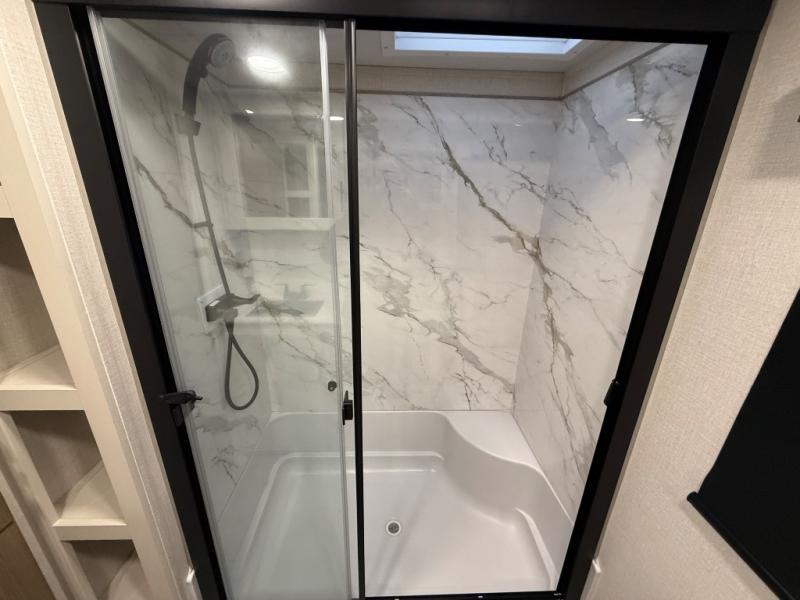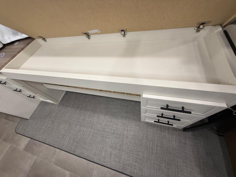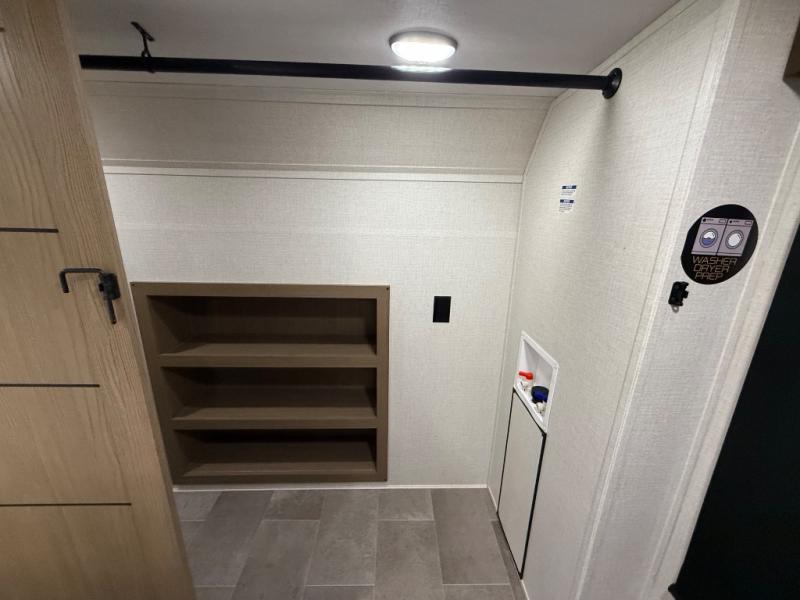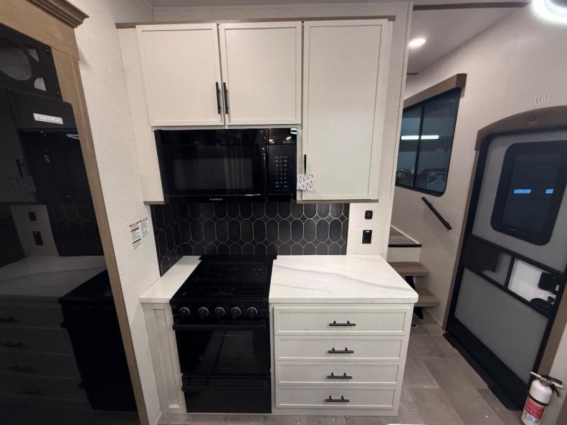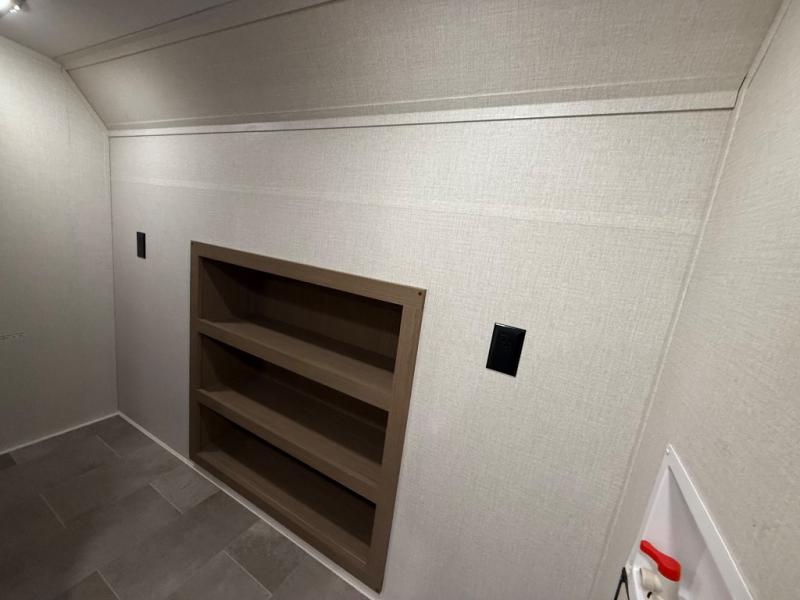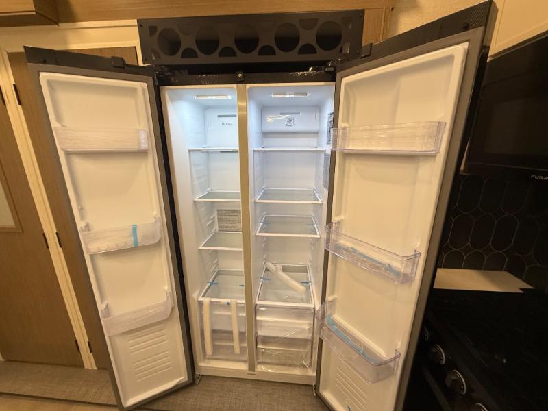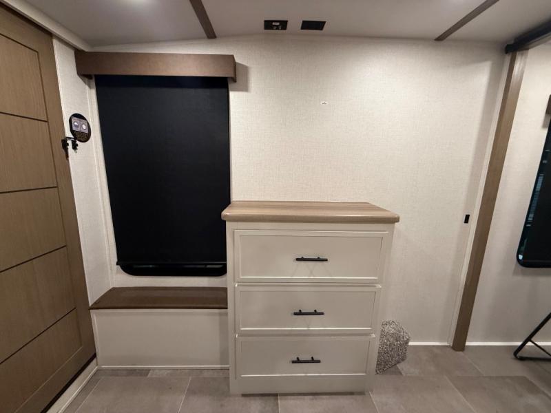 Step inside this luxurious fifth wheel that can sleep the whole gang each night! The rear tri-fold hide-a-bed sofa and theater seating provide a relaxing evening by the entertainment center with a TV. Next to the entertainment center is a hidden door with cabinets and 16 cu. ft. 12V refrigerator, and a 36" x 74" flip-down bunk with storage. The kitchen has plenty of countertop space to prepare your best home cooked meals and an island with four bar stools to enjoy your meals. You also have a desk with storage to get some work done if needed. As you walk up the floating steps, you will notice the full bathroom to your left with a walk-in shower with a skylight for added natural lighting and a dual sink vanity for two to get ready at once. The front private bedroom has a king bed with Versa Tilt technology slide, a dresser next to a bench and a front wardrobe that is prepped for a washer and dryer!