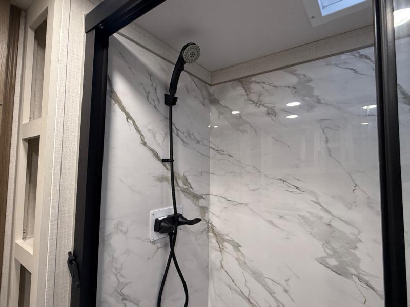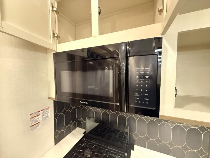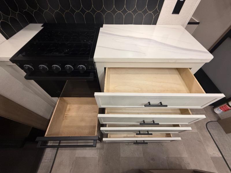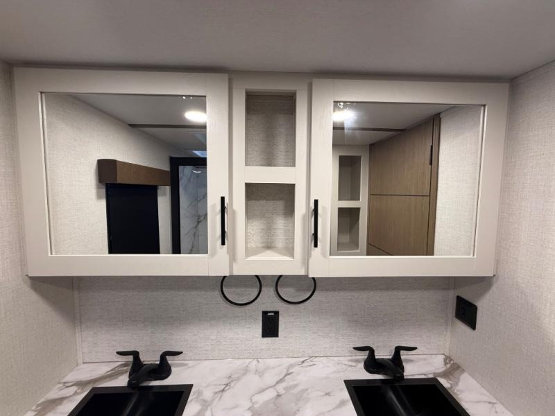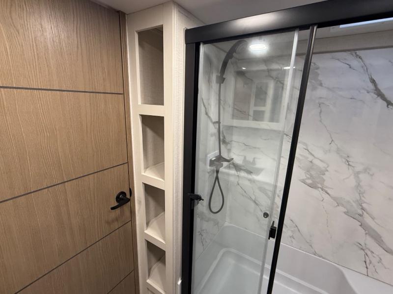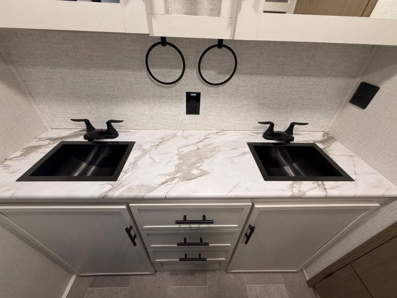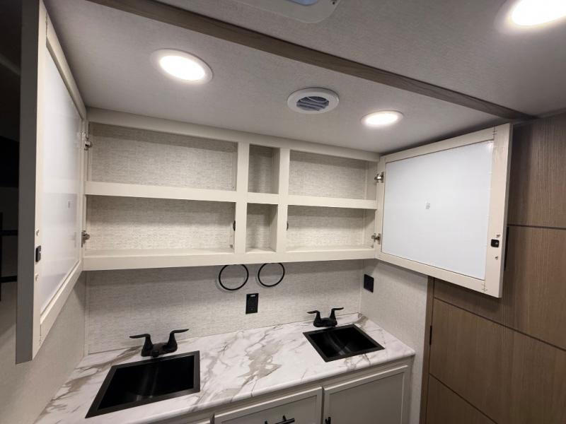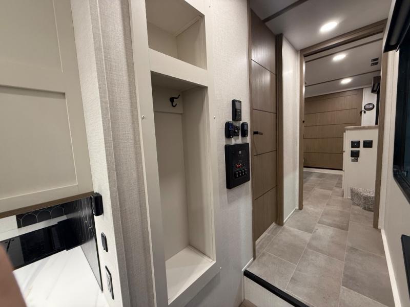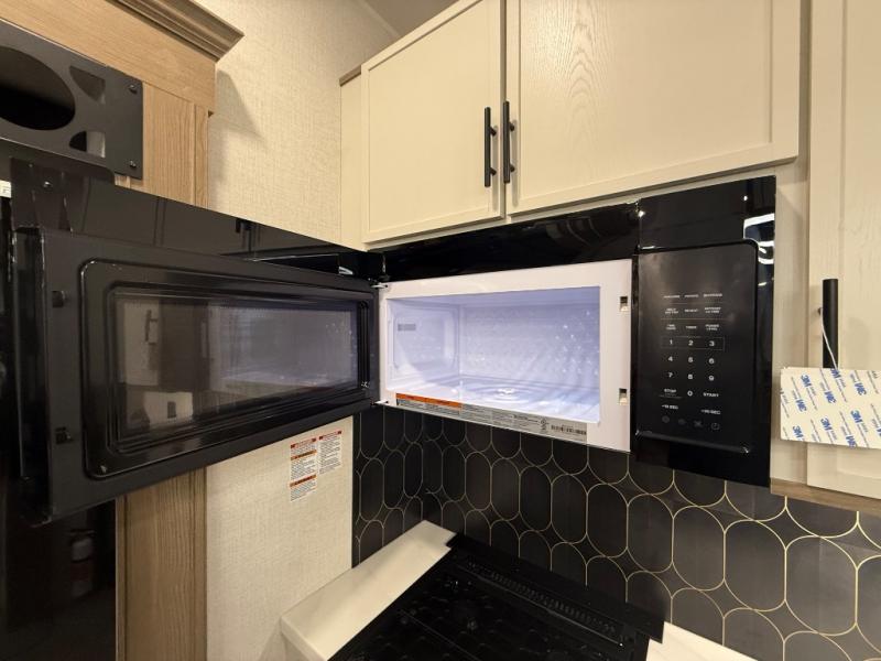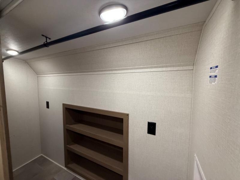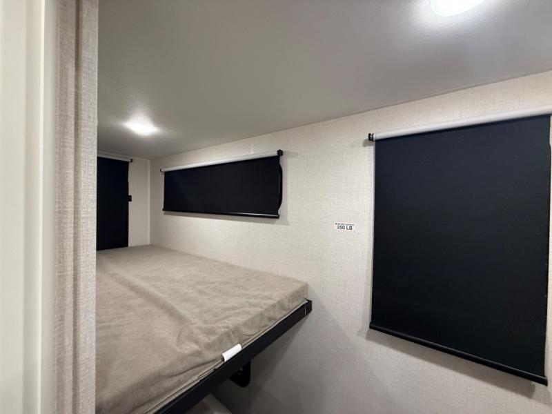 Step inside this luxurious fifth wheel that can sleep the whole gang each night! The rear tri-fold hide-a-bed sofa and theater seating provide a relaxing evening by the entertainment center with a TV. Next to the entertainment center is a hidden door with cabinets and 16 cu. ft. 12V refrigerator, and a 36" x 74" flip-down bunk with storage. The kitchen has plenty of countertop space to prepare your best home cooked meals and an island with four bar stools to enjoy your meals. You also have a desk with storage to get some work done if needed. As you walk up the floating steps, you will notice the full bathroom to your left with a walk-in shower with a skylight for added natural lighting and a dual sink vanity for two to get ready at once. The front private bedroom has a king bed with Versa Tilt technology slide, a dresser next to a bench and a front wardrobe that is prepped for a washer and dryer!