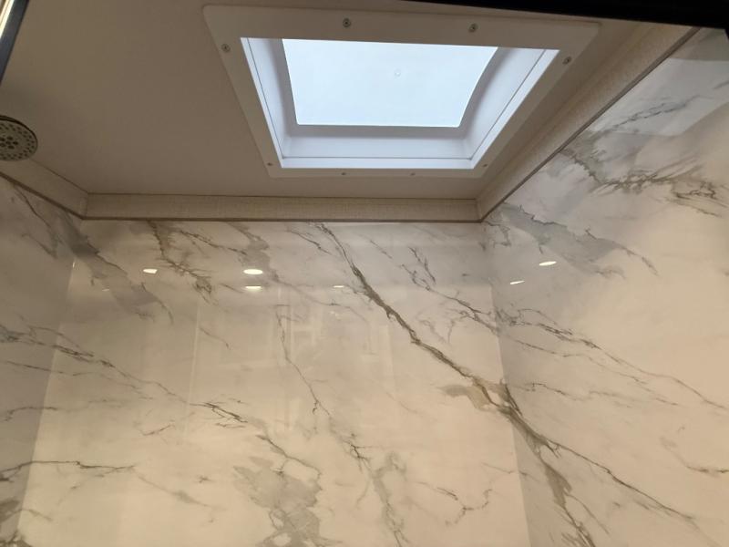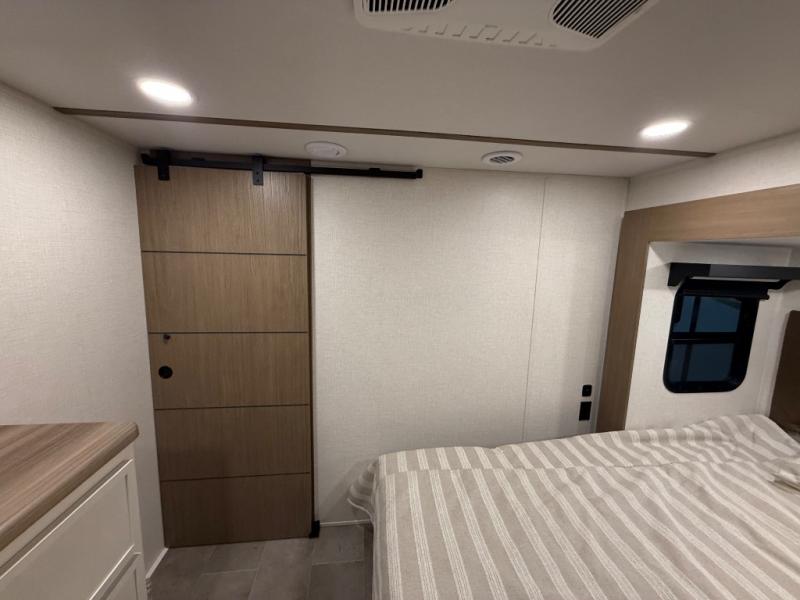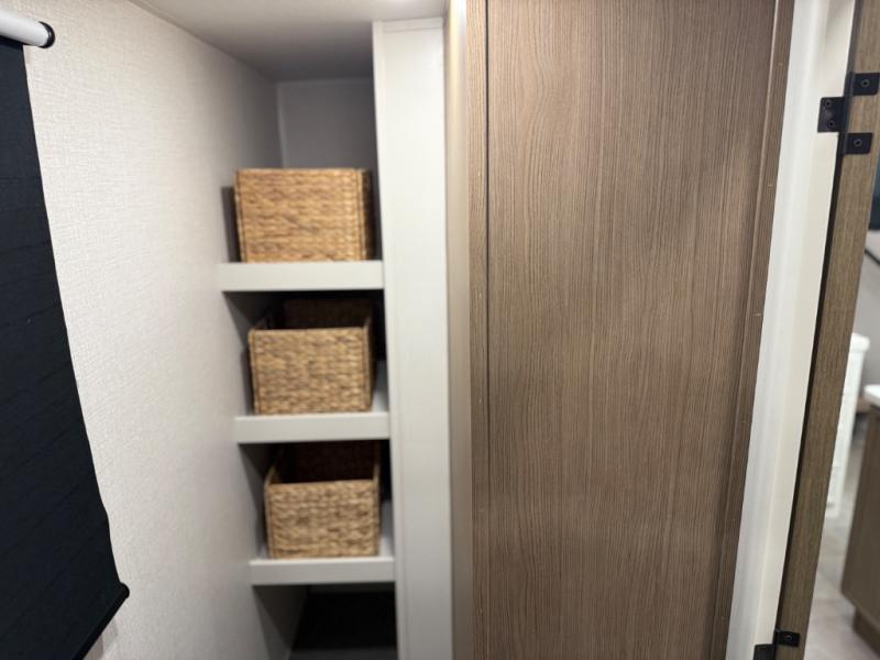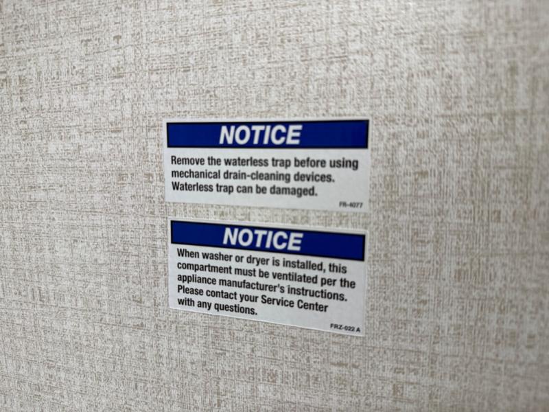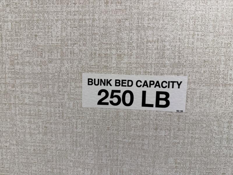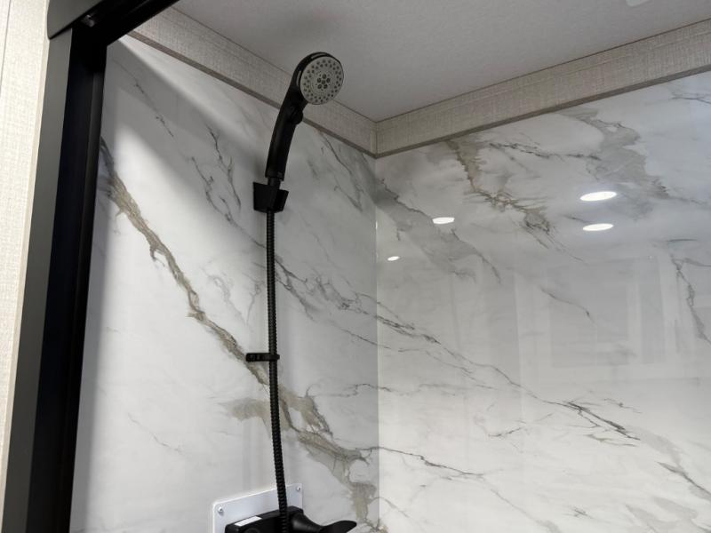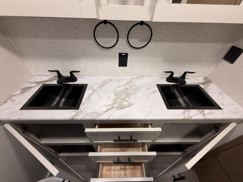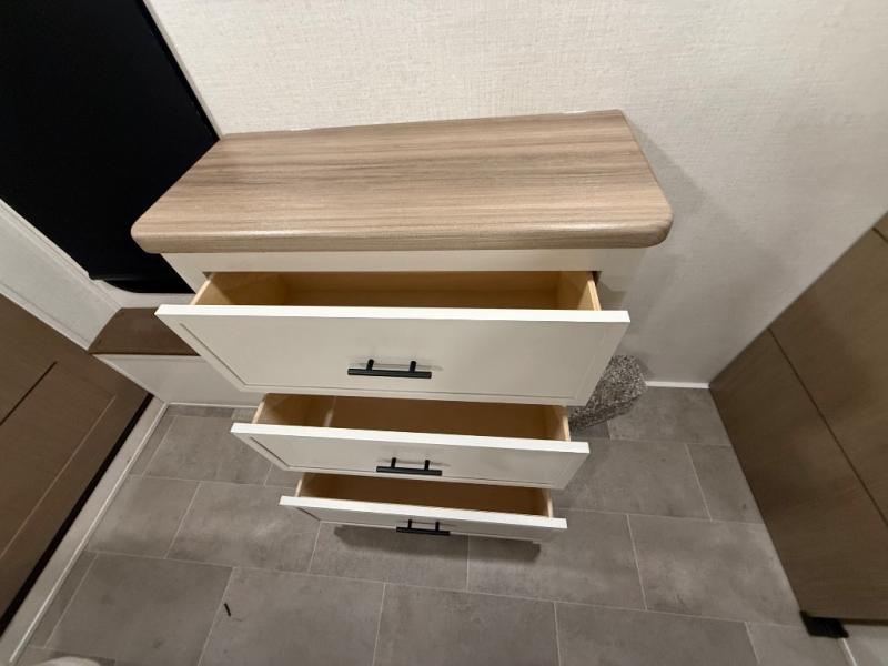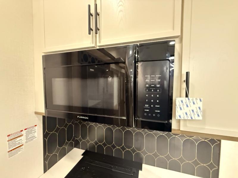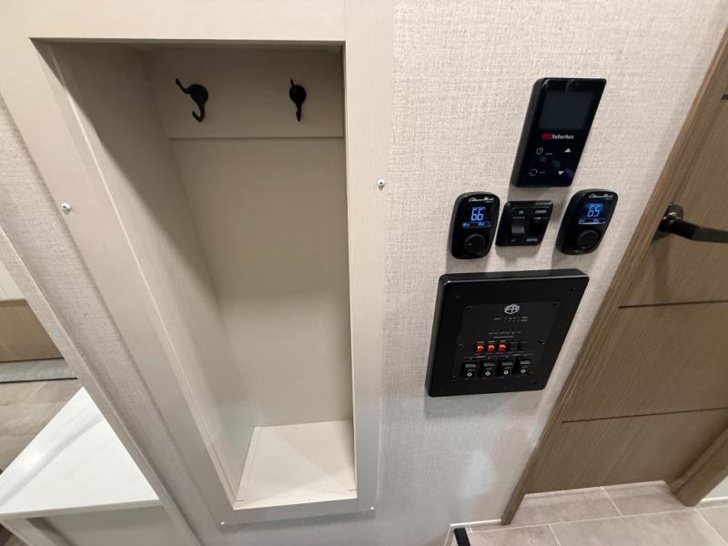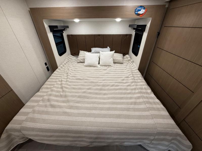 Step inside this luxurious fifth wheel that can sleep the whole gang each night! The rear tri-fold hide-a-bed sofa and theater seating provide a relaxing evening by the entertainment center with a TV. Next to the entertainment center is a hidden door with cabinets and 16 cu. ft. 12V refrigerator, and a 36" x 74" flip-down bunk with storage. The kitchen has plenty of countertop space to prepare your best home cooked meals and an island with four bar stools to enjoy your meals. You also have a desk with storage to get some work done if needed. As you walk up the floating steps, you will notice the full bathroom to your left with a walk-in shower with a skylight for added natural lighting and a dual sink vanity for two to get ready at once. The front private bedroom has a king bed with Versa Tilt technology slide, a dresser next to a bench and a front wardrobe that is prepped for a washer and dryer!