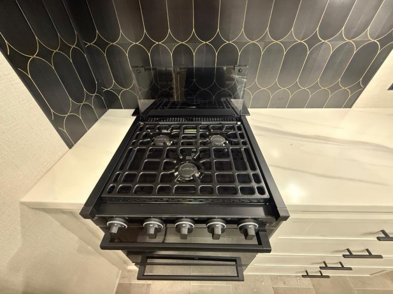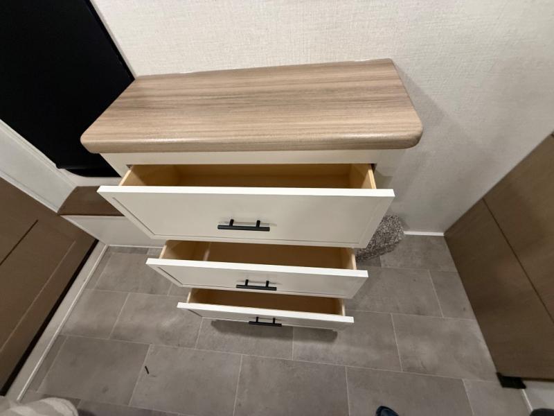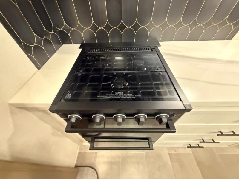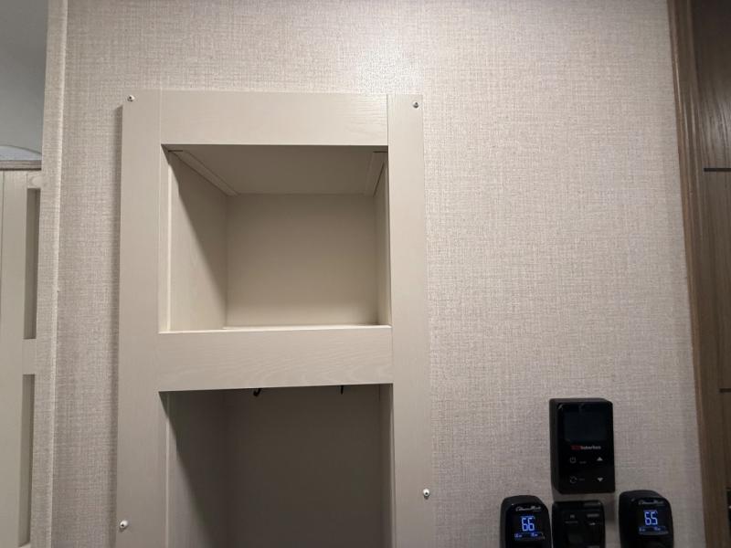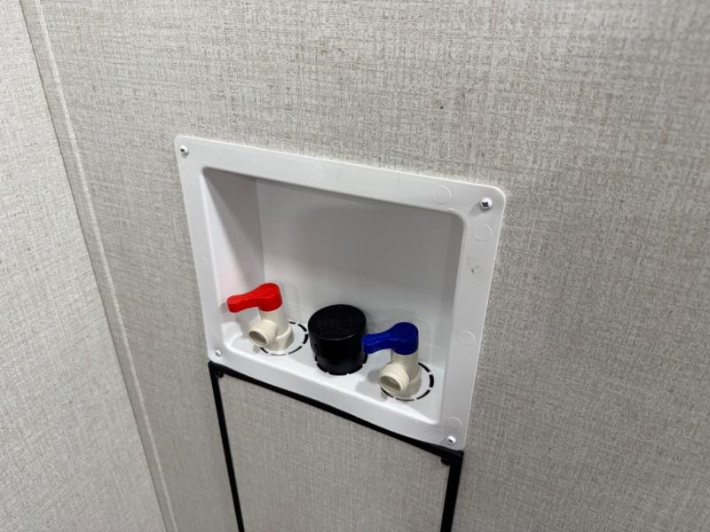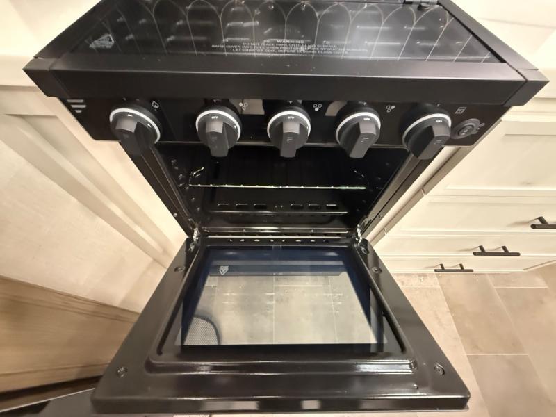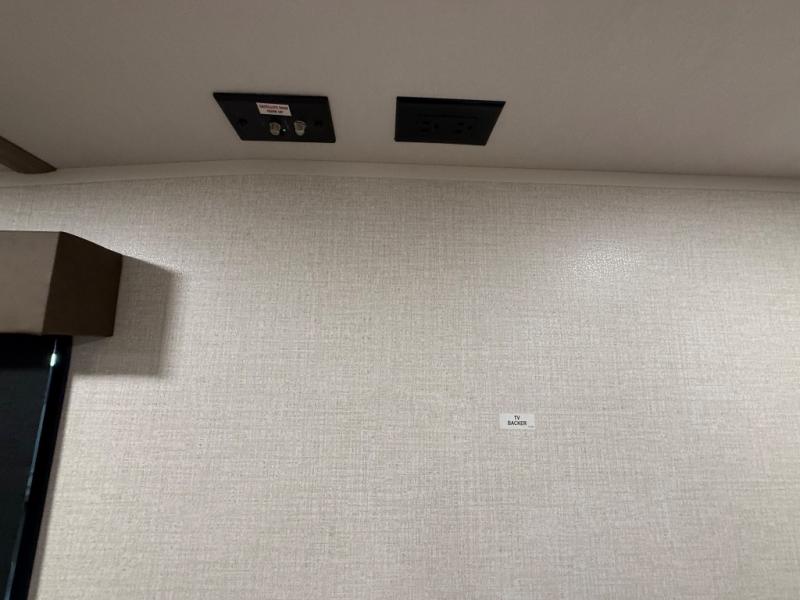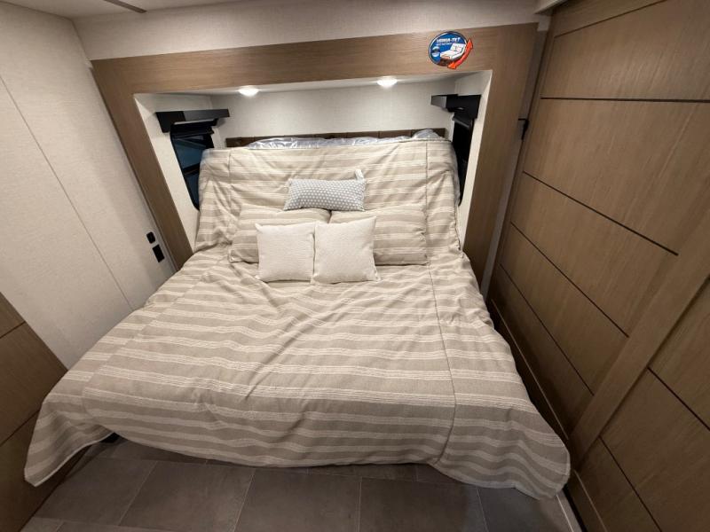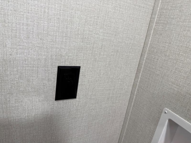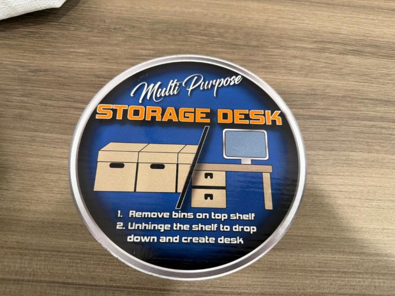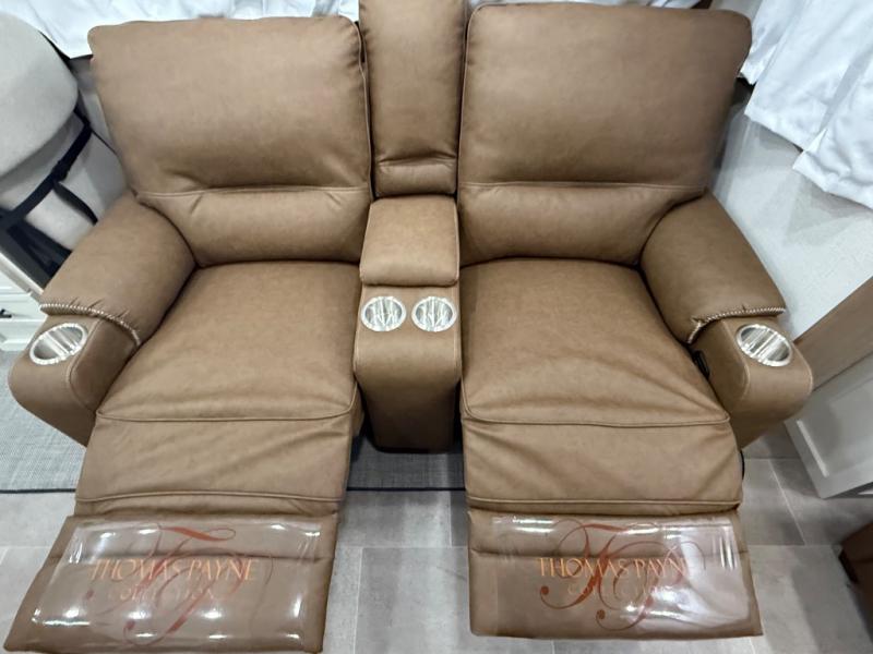Step inside this luxurious fifth wheel that can sleep the whole gang each night! The rear tri-fold hide-a-bed sofa and theater seating provide a relaxing evening by the entertainment center with a TV. Next to the entertainment center is a hidden door with cabinets and 16 cu. ft. 12V refrigerator, and a 36" x 74" flip-down bunk with storage. The kitchen has plenty of countertop space to prepare your best home cooked meals and an island with four bar stools to enjoy your meals. You also have a desk with storage to get some work done if needed. As you walk up the floating steps, you will notice the full bathroom to your left with a walk-in shower with a skylight for added natural lighting and a dual sink vanity for two to get ready at once. The front private bedroom has a king bed with Versa Tilt technology slide, a dresser next to a bench and a front wardrobe that is prepped for a washer and dryer!