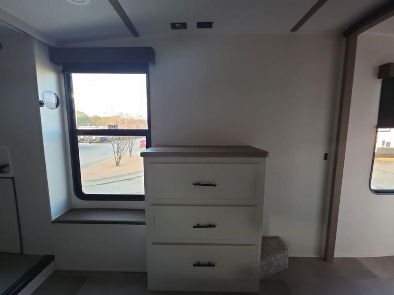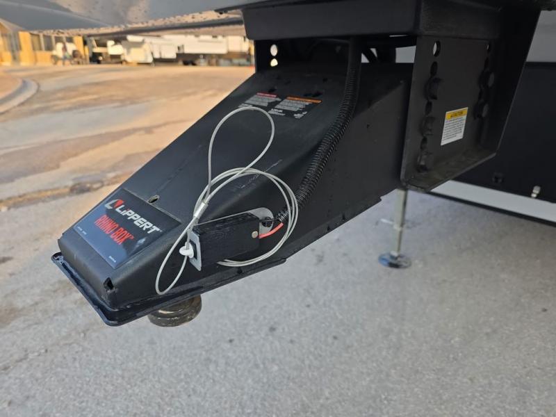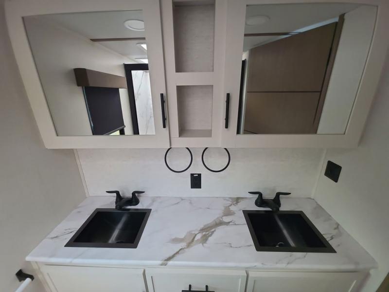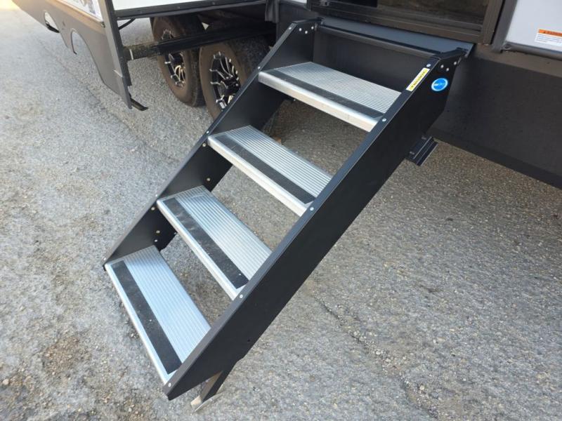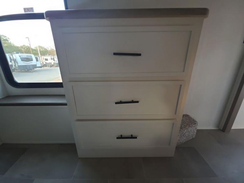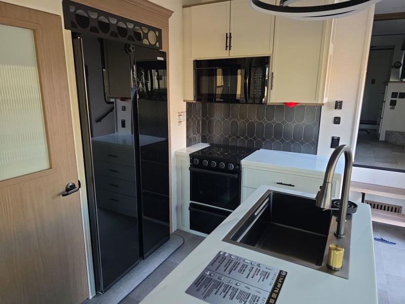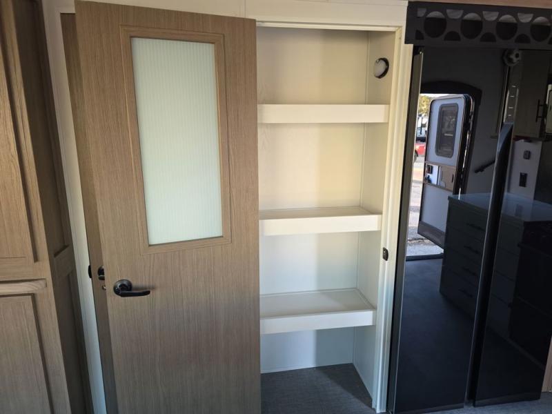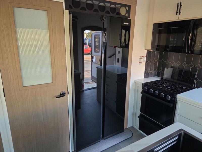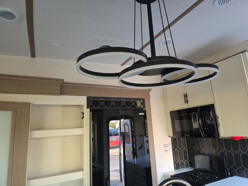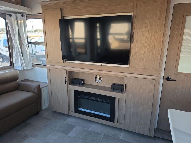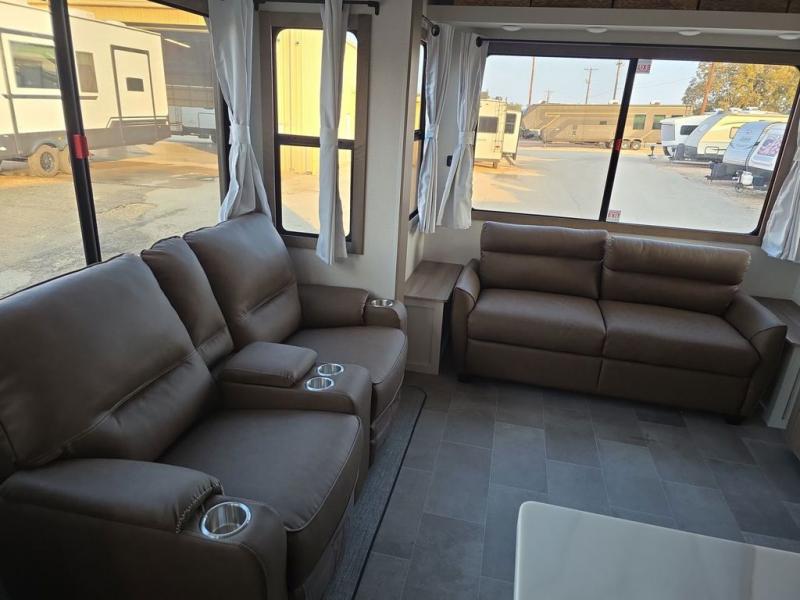 Step inside this luxurious fifth wheel that can sleep five each night! The rear tri-fold hide-a-bed sofa and theater seating provide a relaxing evening by the entertainment center with a 55" TV. Next to the entertainment center is a hidden door with cabinets and 16 cu. ft. 12V refrigerator, and a 36" x 74" flip-down bunk with storage. The kitchen has plenty of countertop space to prepare your best home cooked meals and an island with four bar stools to enjoy your meals. You also have a desk with storage to get some work done if needed. As you walk up the floating steps, you will notice the full bathroom to your left with a walk-in shower with a skylight for added natural lighting and a dual sink vanity for two to get ready at once. The front private bedroom has a king bed with Versa Tilt technology slide, a dresser next to a bench and a front wardrobe that is prepped for a washer and dryer!