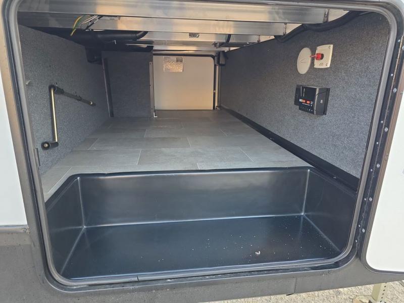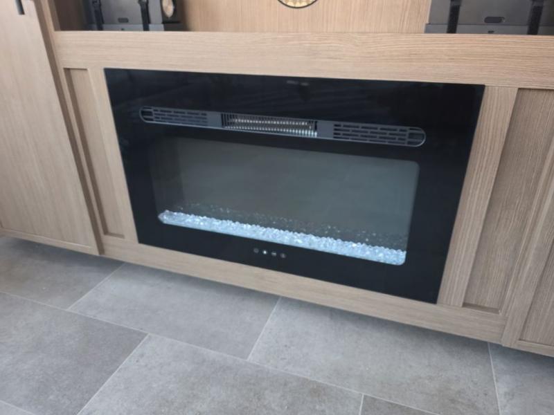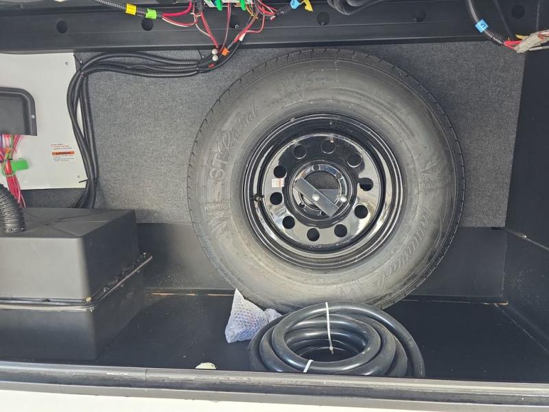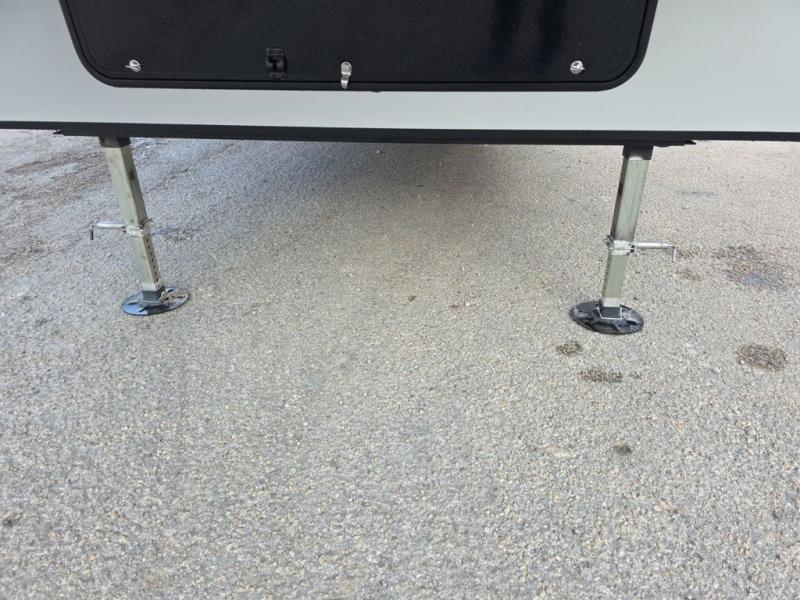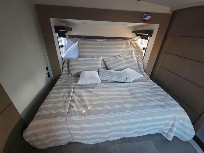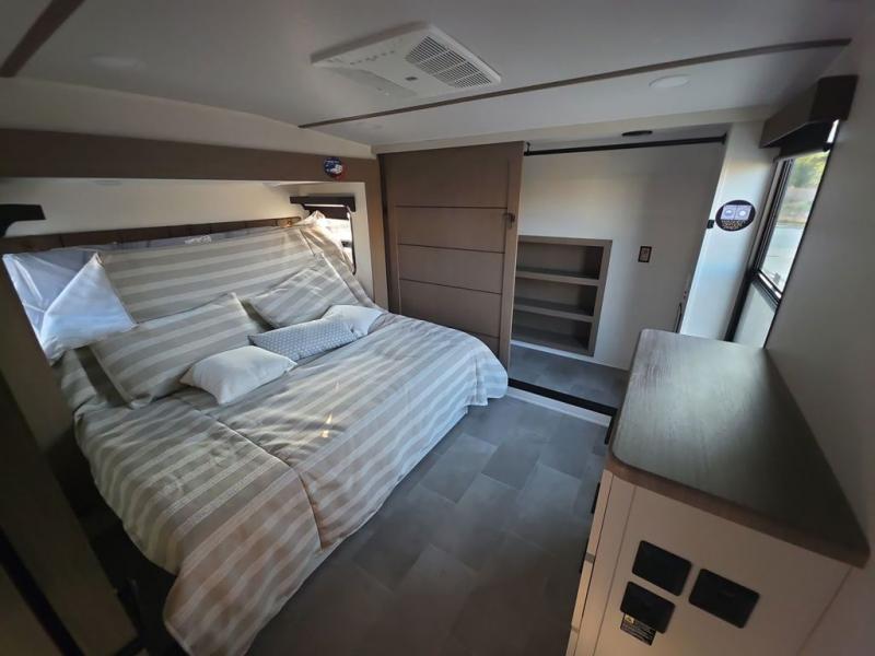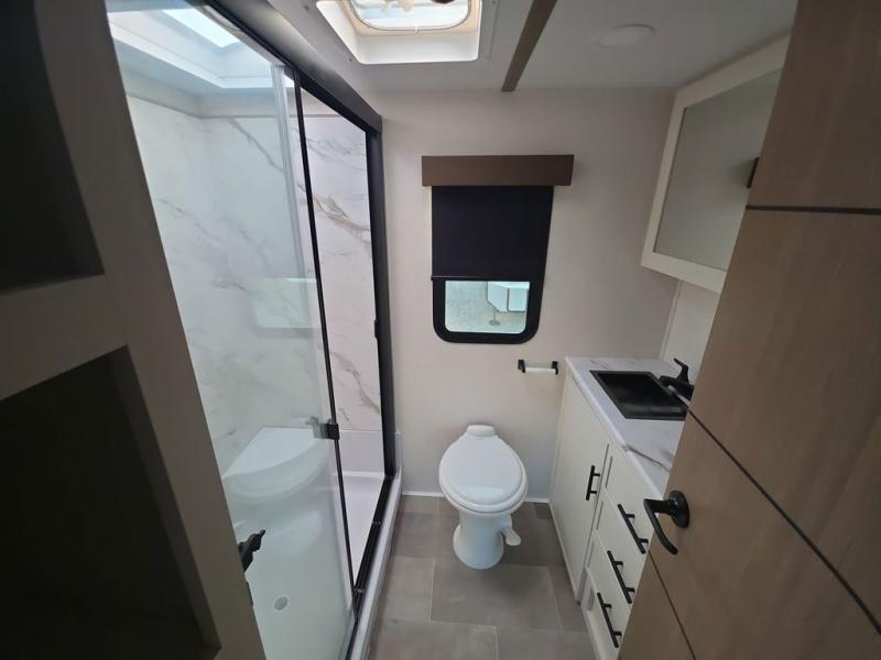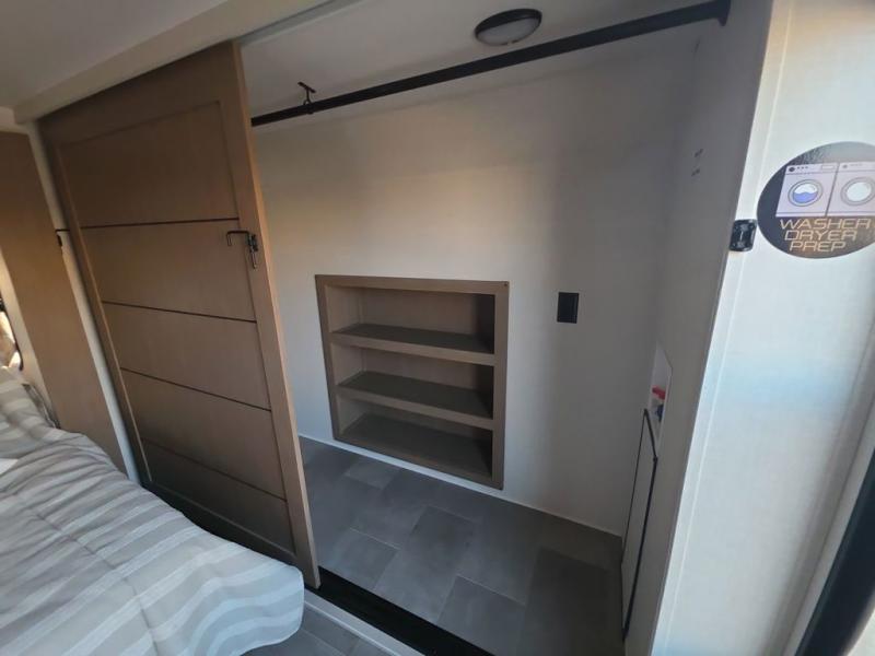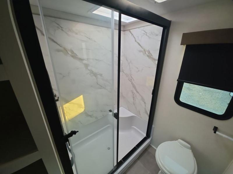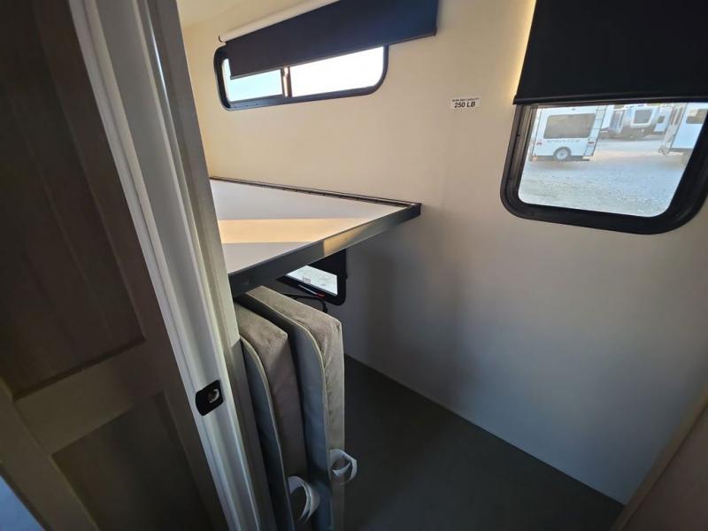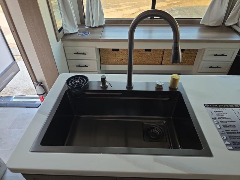 Step inside this luxurious fifth wheel that can sleep five each night! The rear tri-fold hide-a-bed sofa and theater seating provide a relaxing evening by the entertainment center with a 55" TV. Next to the entertainment center is a hidden door with cabinets and 16 cu. ft. 12V refrigerator, and a 36" x 74" flip-down bunk with storage. The kitchen has plenty of countertop space to prepare your best home cooked meals and an island with four bar stools to enjoy your meals. You also have a desk with storage to get some work done if needed. As you walk up the floating steps, you will notice the full bathroom to your left with a walk-in shower with a skylight for added natural lighting and a dual sink vanity for two to get ready at once. The front private bedroom has a king bed with Versa Tilt technology slide, a dresser next to a bench and a front wardrobe that is prepped for a washer and dryer!