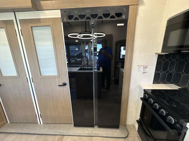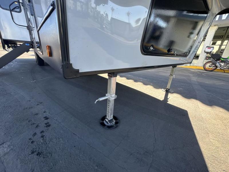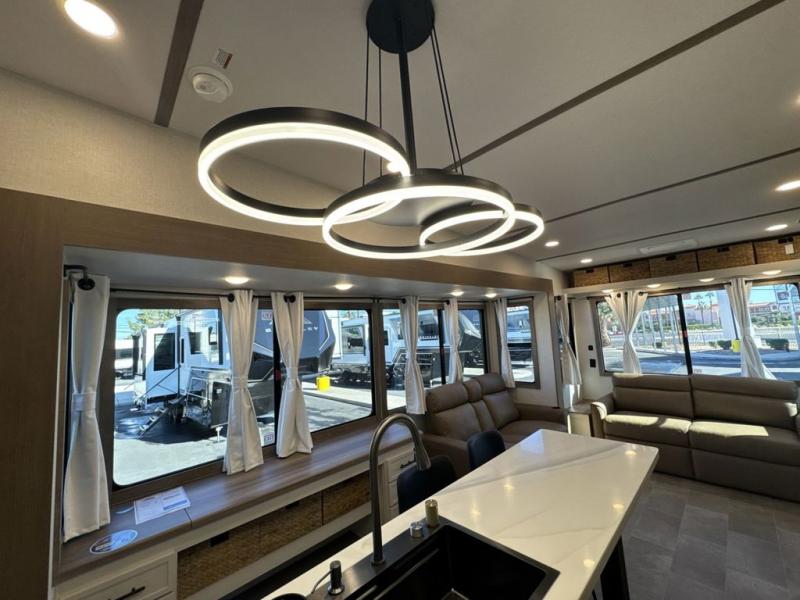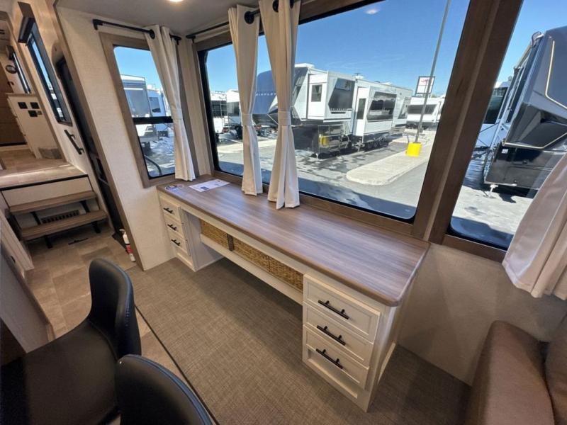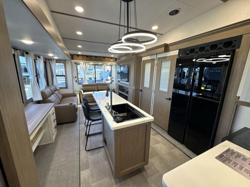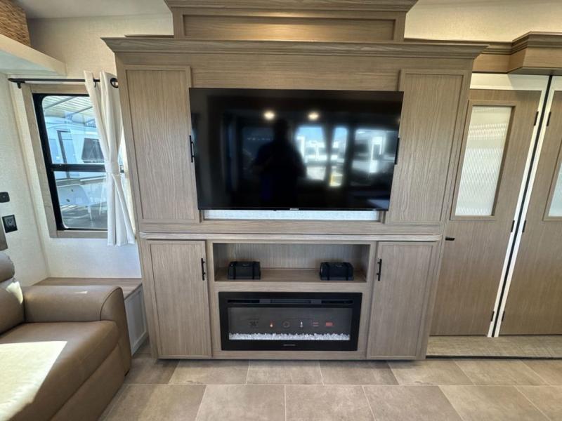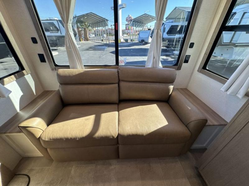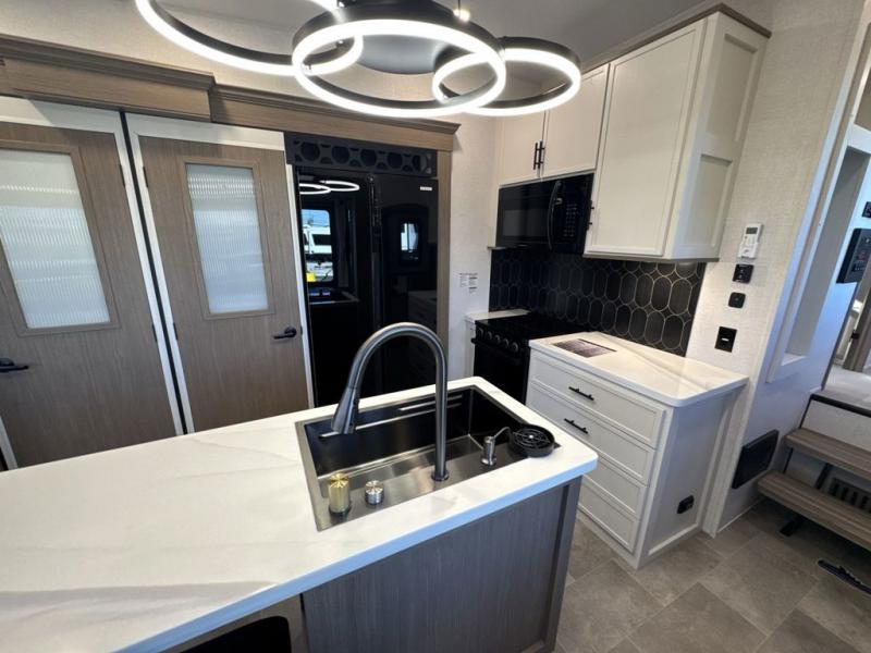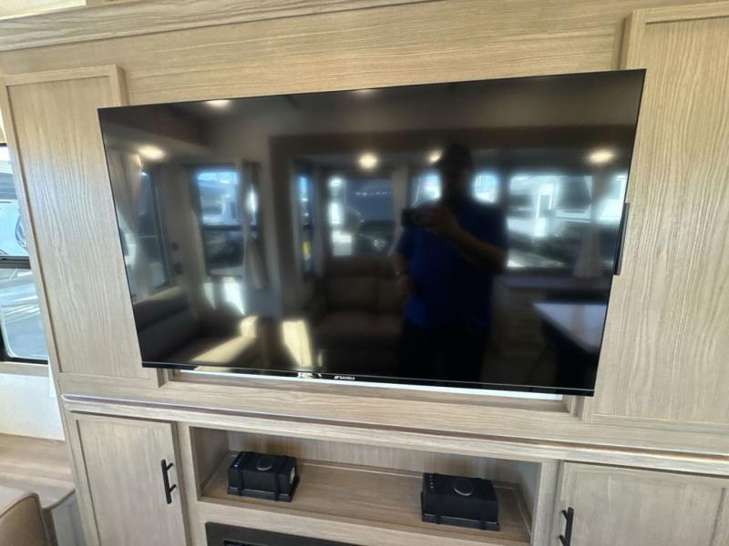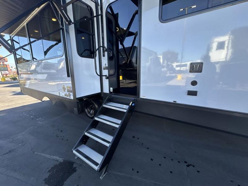 Step inside this luxurious fifth wheel that can sleep five each night! The rear tri-fold hide-a-bed sofa and theater seating provide a relaxing evening by the entertainment center with a 55" TV. Next to the entertainment center is a hidden door with cabinets and 16 cu. ft. 12V refrigerator, and a 36" x 74" flip-down bunk with storage. The kitchen has plenty of countertop space to prepare your best home cooked meals and an island with four bar stools to enjoy your meals. You also have a desk with storage to get some work done if needed. As you walk up the floating steps, you will notice the full bathroom to your left with a walk-in shower with a skylight for added natural lighting and a dual sink vanity for two to get ready at once. The front private bedroom has a king bed with Versa Tilt technology slide, a dresser next to a bench and a front wardrobe that is prepped for a washer and dryer!