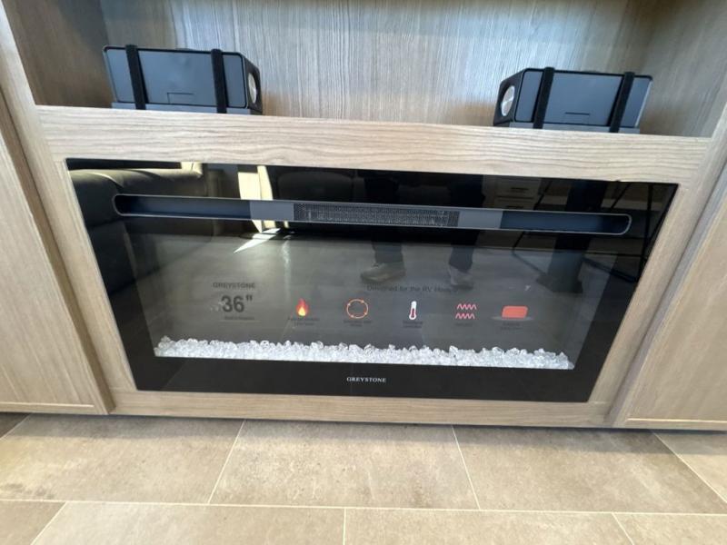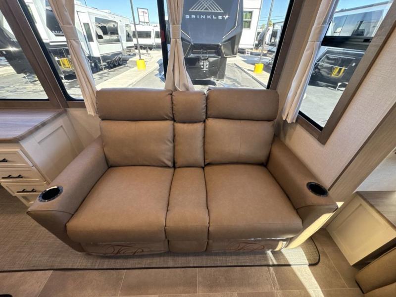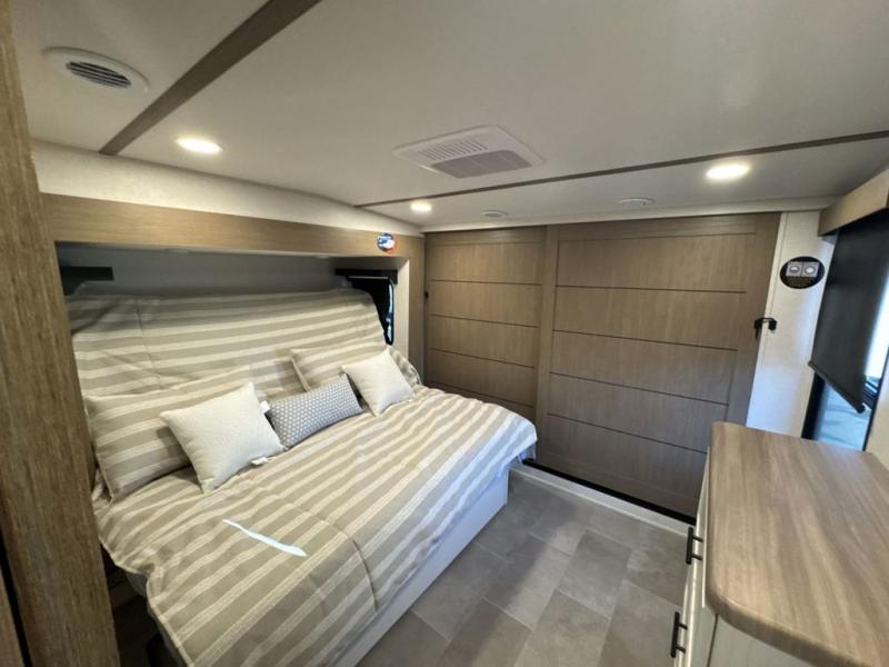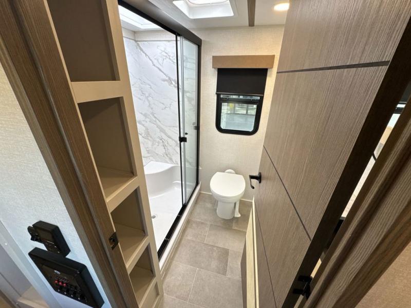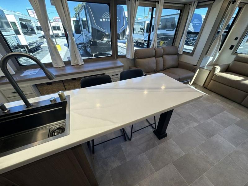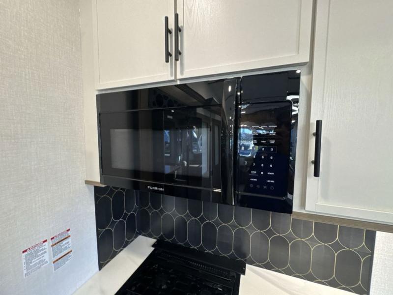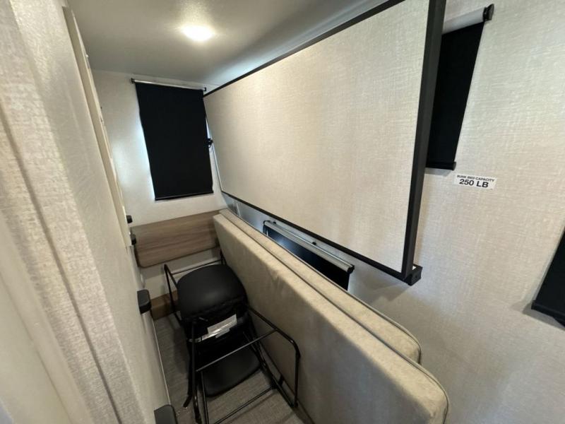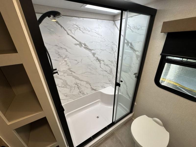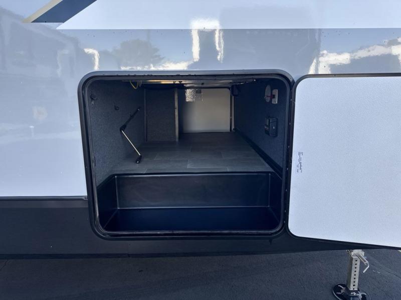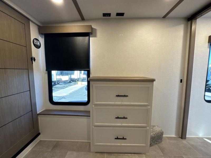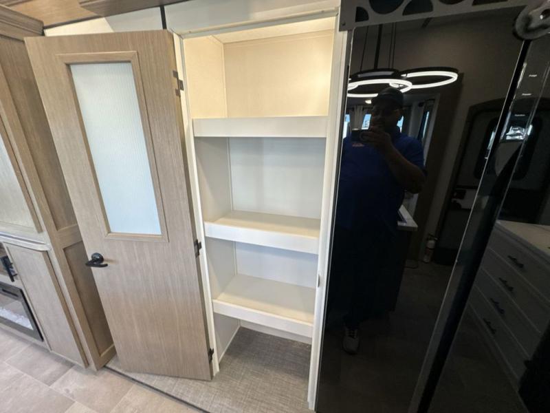 Step inside this luxurious fifth wheel that can sleep five each night! The rear tri-fold hide-a-bed sofa and theater seating provide a relaxing evening by the entertainment center with a 55" TV. Next to the entertainment center is a hidden door with cabinets and 16 cu. ft. 12V refrigerator, and a 36" x 74" flip-down bunk with storage. The kitchen has plenty of countertop space to prepare your best home cooked meals and an island with four bar stools to enjoy your meals. You also have a desk with storage to get some work done if needed. As you walk up the floating steps, you will notice the full bathroom to your left with a walk-in shower with a skylight for added natural lighting and a dual sink vanity for two to get ready at once. The front private bedroom has a king bed with Versa Tilt technology slide, a dresser next to a bench and a front wardrobe that is prepped for a washer and dryer!