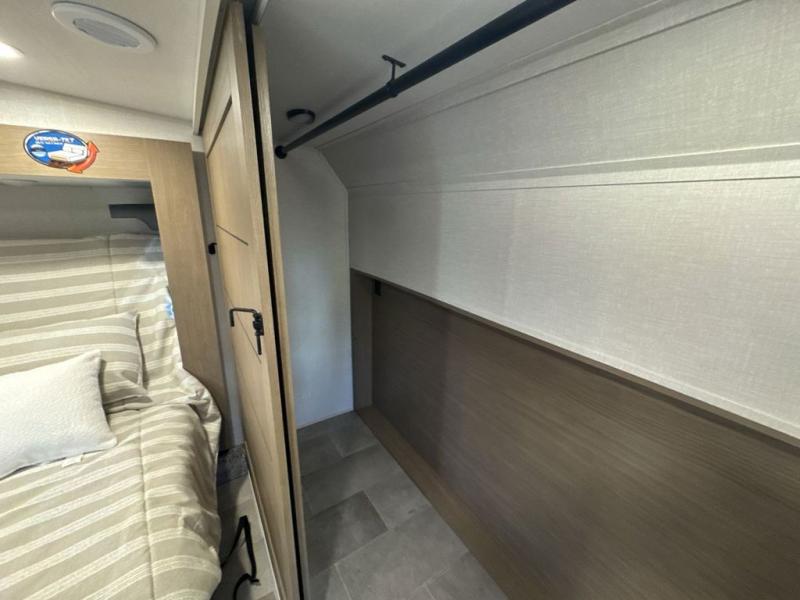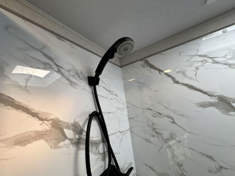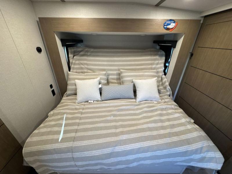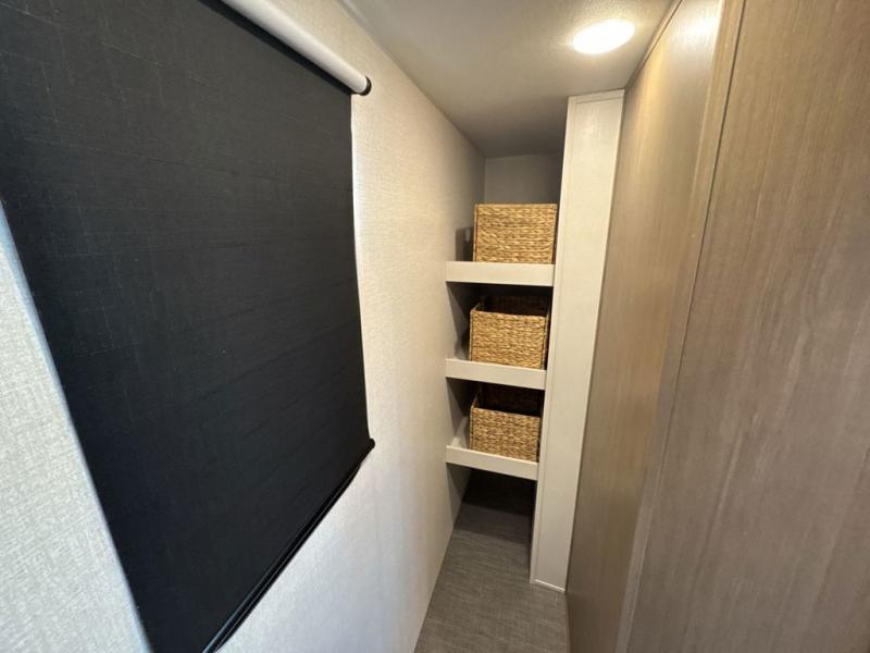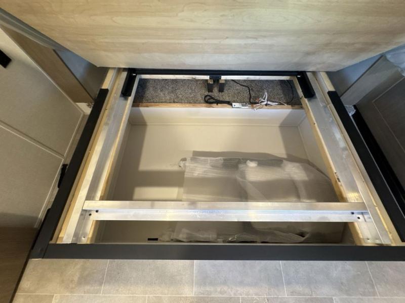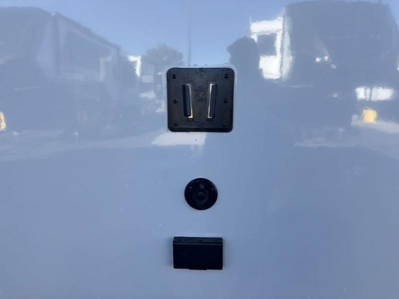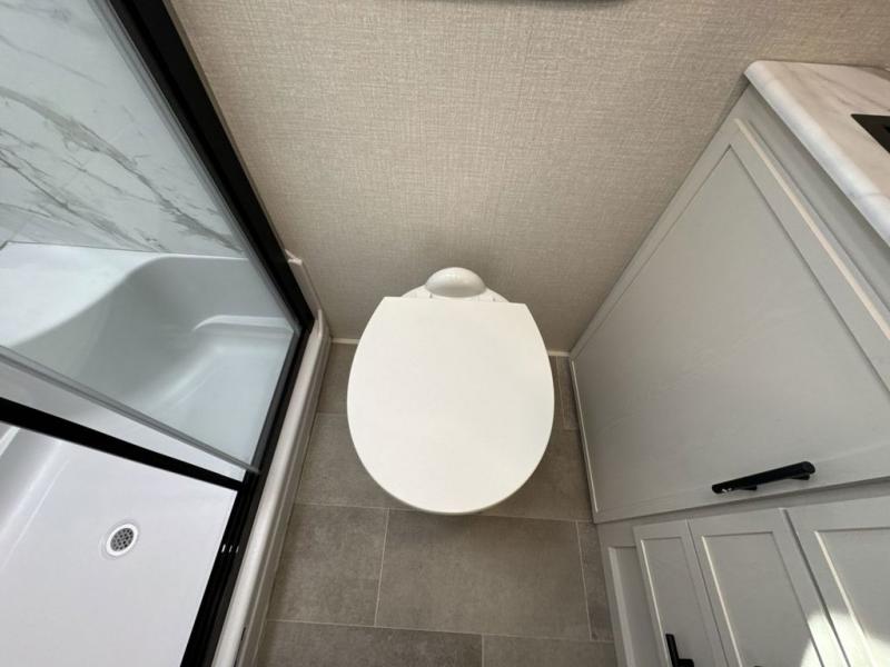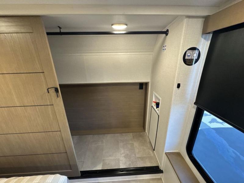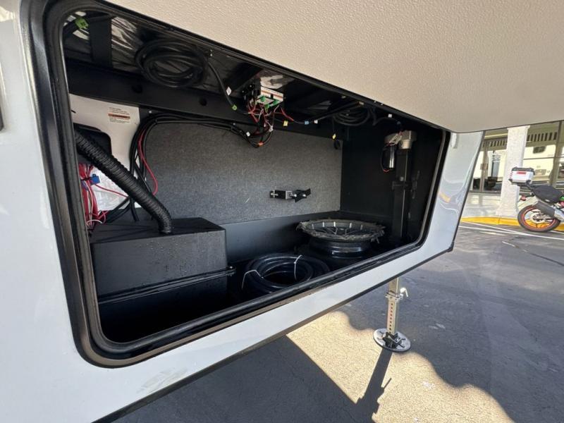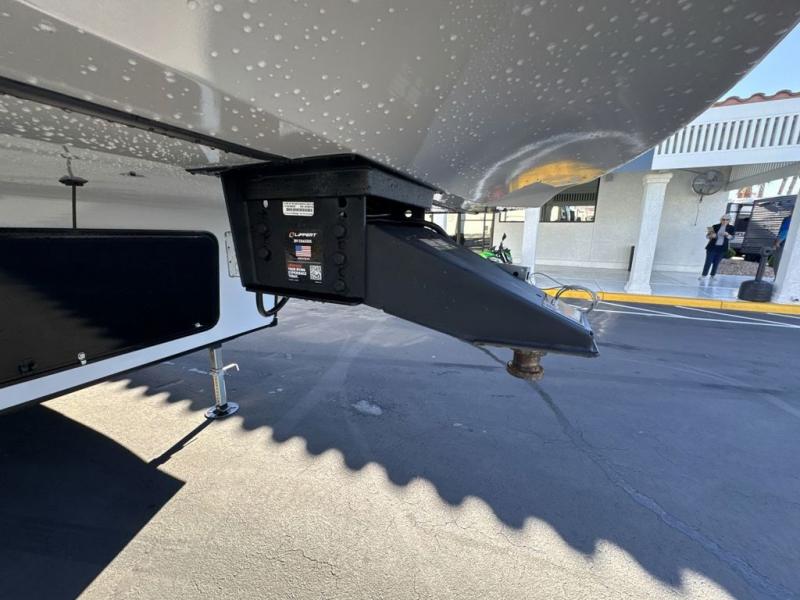 Step inside this luxurious fifth wheel that can sleep five each night! The rear tri-fold hide-a-bed sofa and theater seating provide a relaxing evening by the entertainment center with a 55" TV. Next to the entertainment center is a hidden door with cabinets and 16 cu. ft. 12V refrigerator, and a 36" x 74" flip-down bunk with storage. The kitchen has plenty of countertop space to prepare your best home cooked meals and an island with four bar stools to enjoy your meals. You also have a desk with storage to get some work done if needed. As you walk up the floating steps, you will notice the full bathroom to your left with a walk-in shower with a skylight for added natural lighting and a dual sink vanity for two to get ready at once. The front private bedroom has a king bed with Versa Tilt technology slide, a dresser next to a bench and a front wardrobe that is prepped for a washer and dryer!