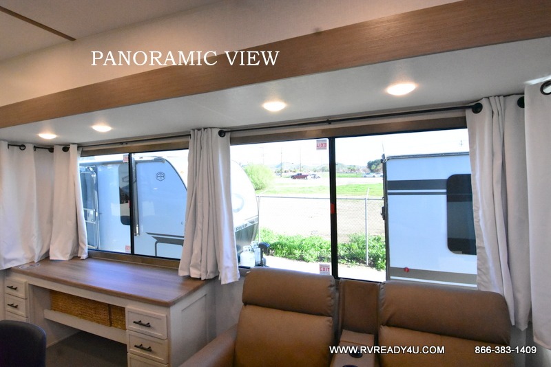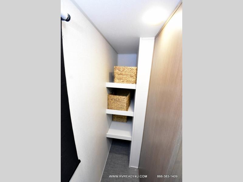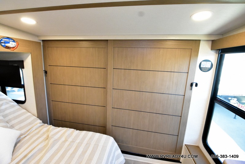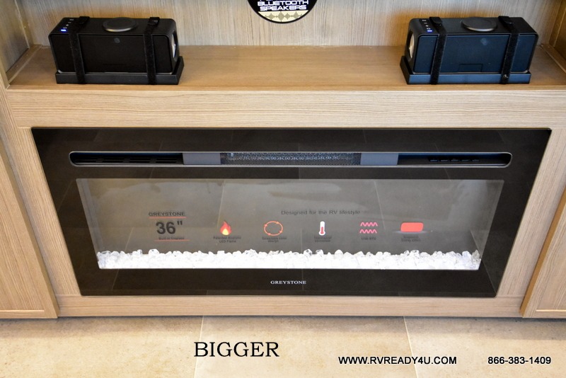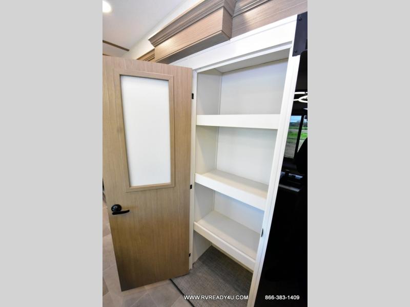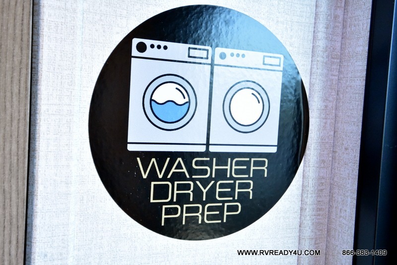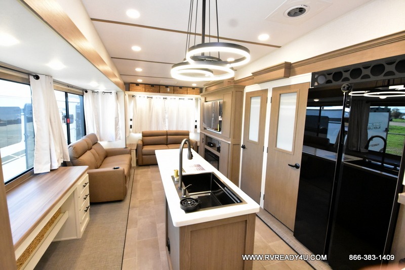 Step inside this luxurious fifth wheel that can sleep the whole gang each night! The rear tri-fold hide-a-bed sofa and theater seating provide a relaxing evening by the entertainment center with a TV. Next to the entertainment center is a hidden door with cabinets and 16 cu. ft. 12V refrigerator, and a 36" x 74" flip-down bunk with storage. The kitchen has plenty of countertop space to prepare your best home cooked meals and an island with four bar stools to enjoy your meals. You also have a desk with storage to get some work done if needed. As you walk up the floating steps, you will notice the full bathroom to your left with a walk-in shower with a skylight for added natural lighting and a dual sink vanity for two to get ready at once. The front private bedroom has a king bed with Versa Tilt technology slide, a dresser next to a bench and a front wardrobe that is prepped for a washer and dryer!