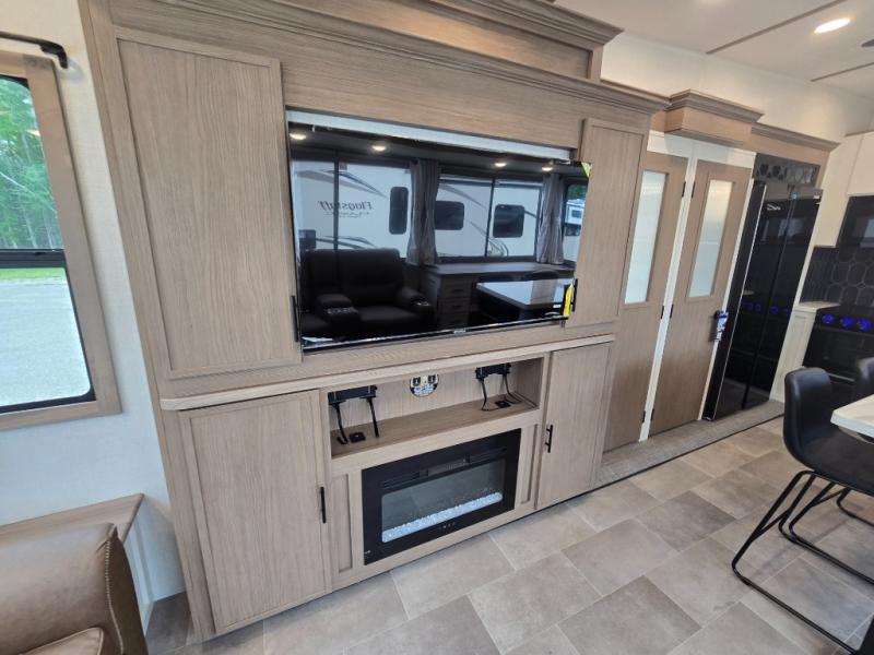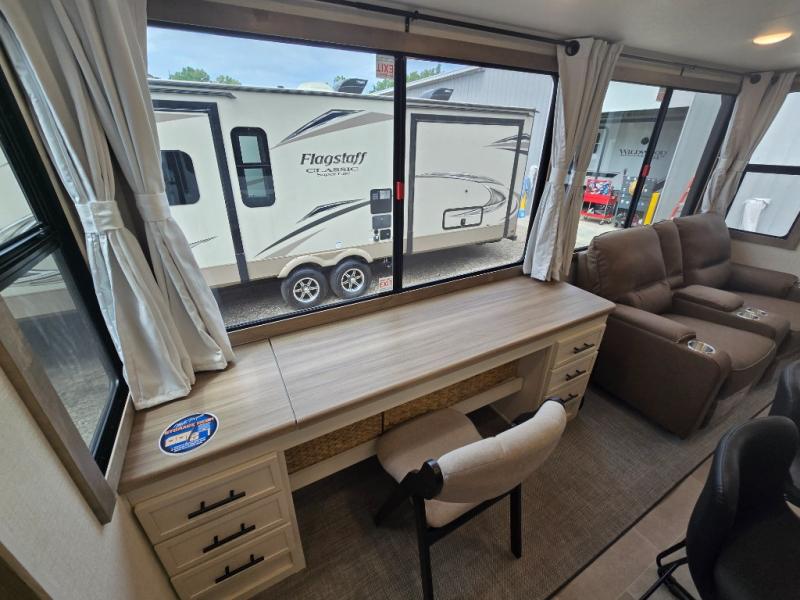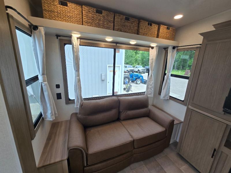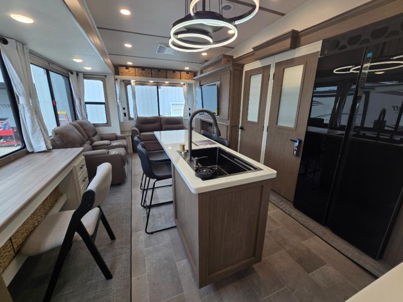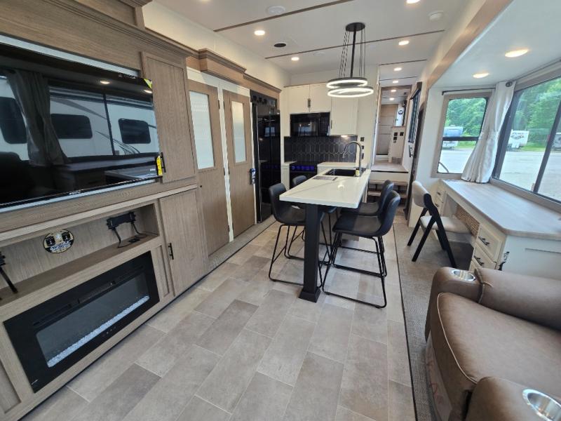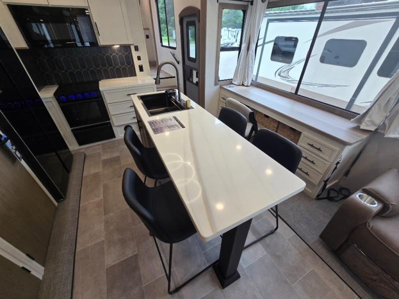 Step inside this luxurious fifth wheel that can sleep five each night! The rear tri-fold hide-a-bed sofa and theater seating provide a relaxing evening by the entertainment center with a 55" TV. Next to the entertainment center is a hidden door with cabinets and 16 cu. ft. 12V refrigerator, and a 36" x 74" flip-down bunk with storage. The kitchen has plenty of countertop space to prepare your best home cooked meals and an island with four bar stools to enjoy your meals. You also have a desk with storage to get some work done if needed. As you walk up the floating steps, you will notice the full bathroom to your left with a walk-in shower with a skylight for added natural lighting and a dual sink vanity for two to get ready at once. The front private bedroom has a king bed with Versa Tilt technology slide, a dresser next to a bench and a front wardrobe that is prepped for a washer and dryer!