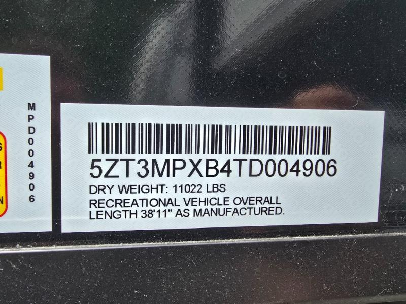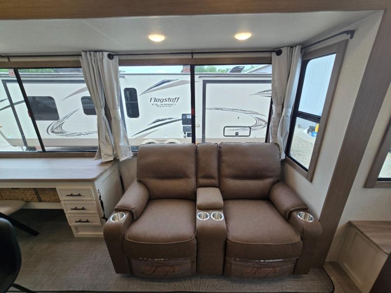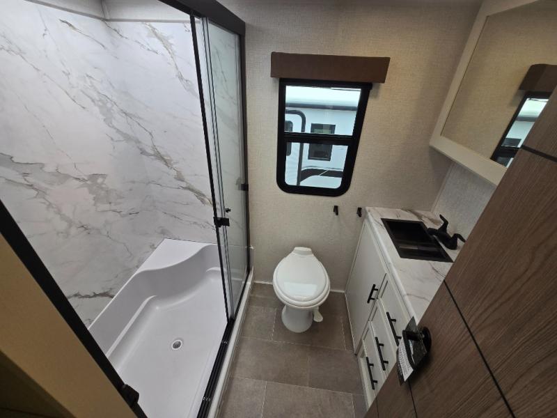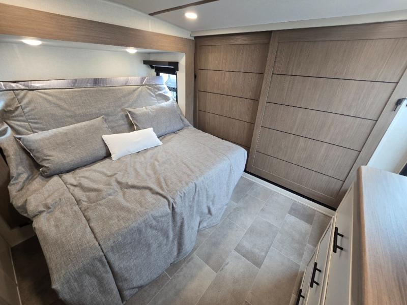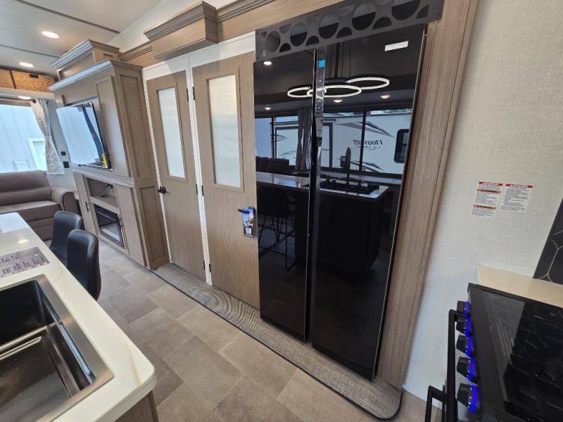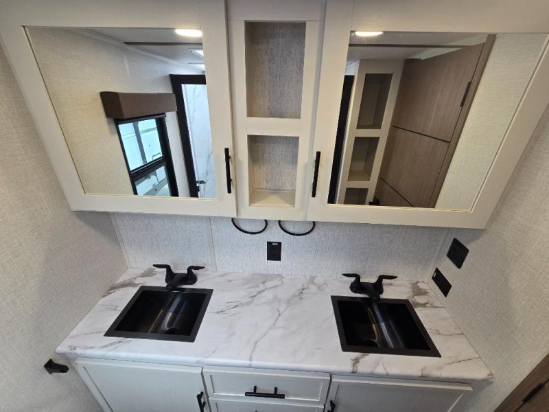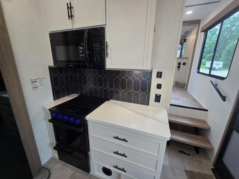 Step inside this luxurious fifth wheel that can sleep five each night! The rear tri-fold hide-a-bed sofa and theater seating provide a relaxing evening by the entertainment center with a 55" TV. Next to the entertainment center is a hidden door with cabinets and 16 cu. ft. 12V refrigerator, and a 36" x 74" flip-down bunk with storage. The kitchen has plenty of countertop space to prepare your best home cooked meals and an island with four bar stools to enjoy your meals. You also have a desk with storage to get some work done if needed. As you walk up the floating steps, you will notice the full bathroom to your left with a walk-in shower with a skylight for added natural lighting and a dual sink vanity for two to get ready at once. The front private bedroom has a king bed with Versa Tilt technology slide, a dresser next to a bench and a front wardrobe that is prepped for a washer and dryer!