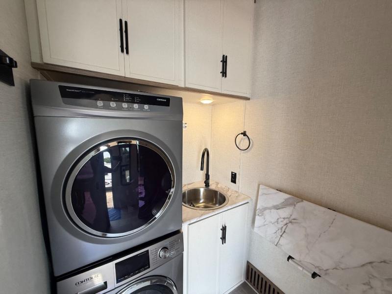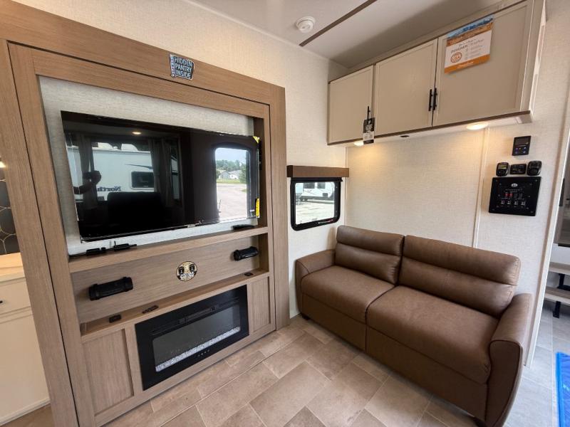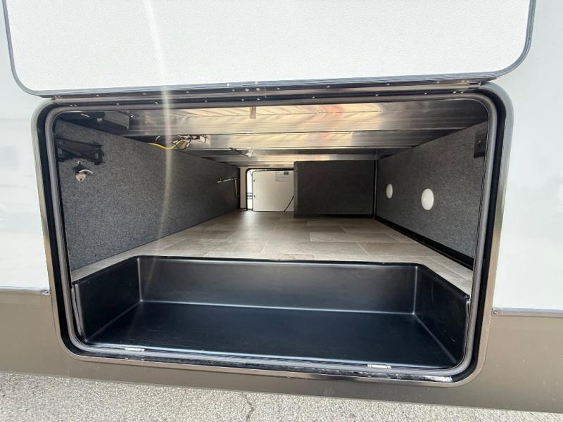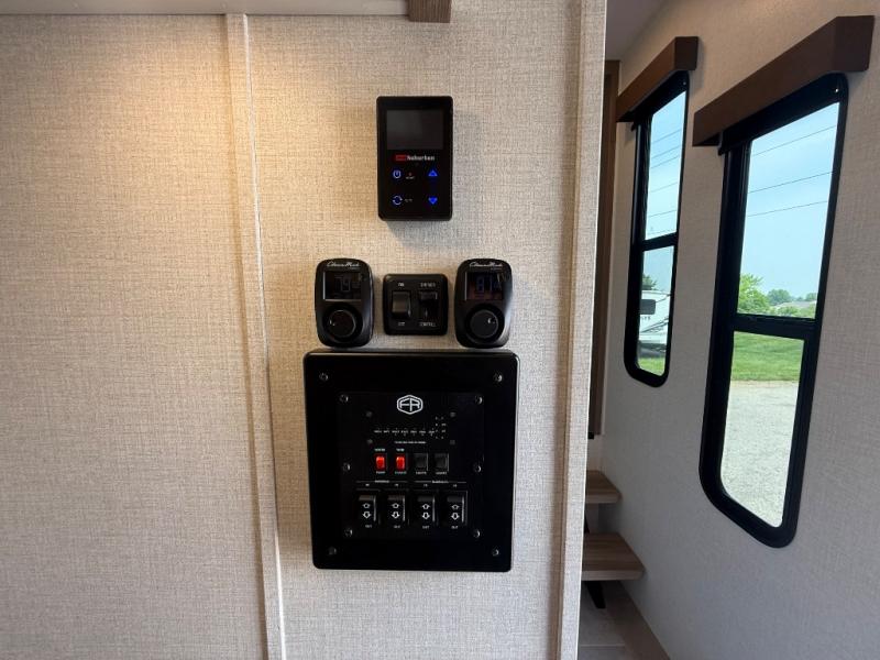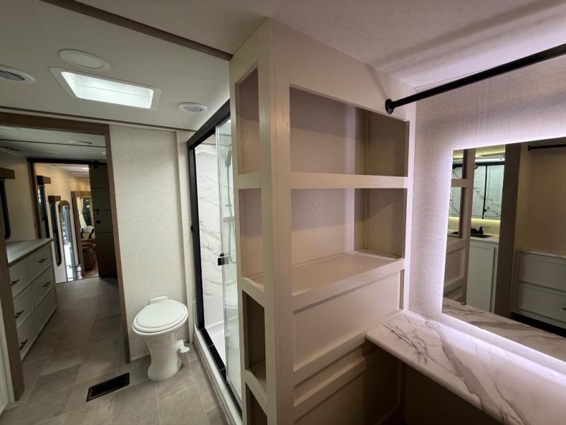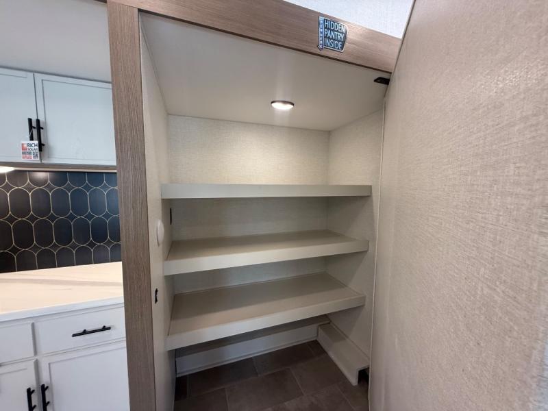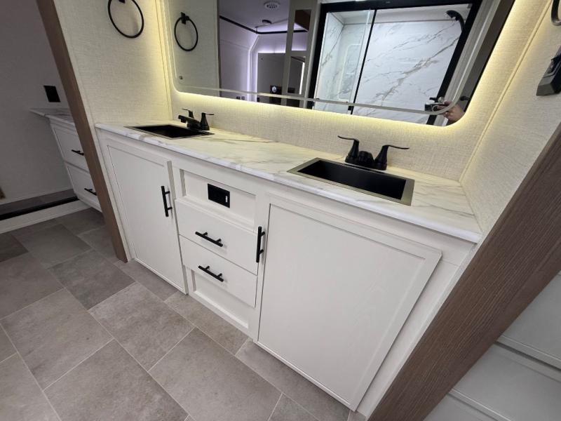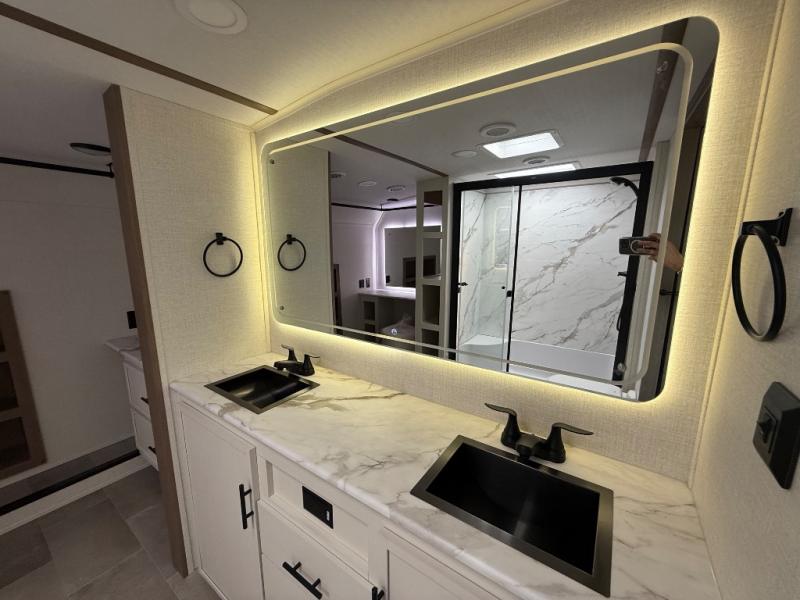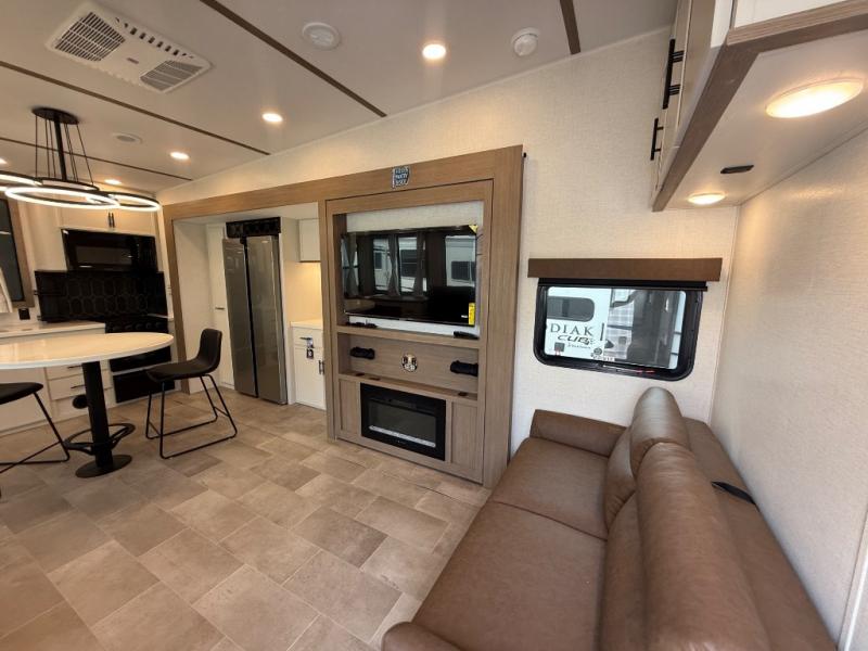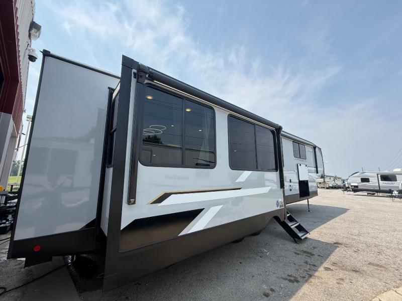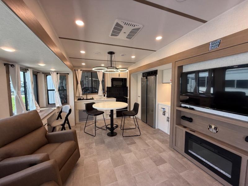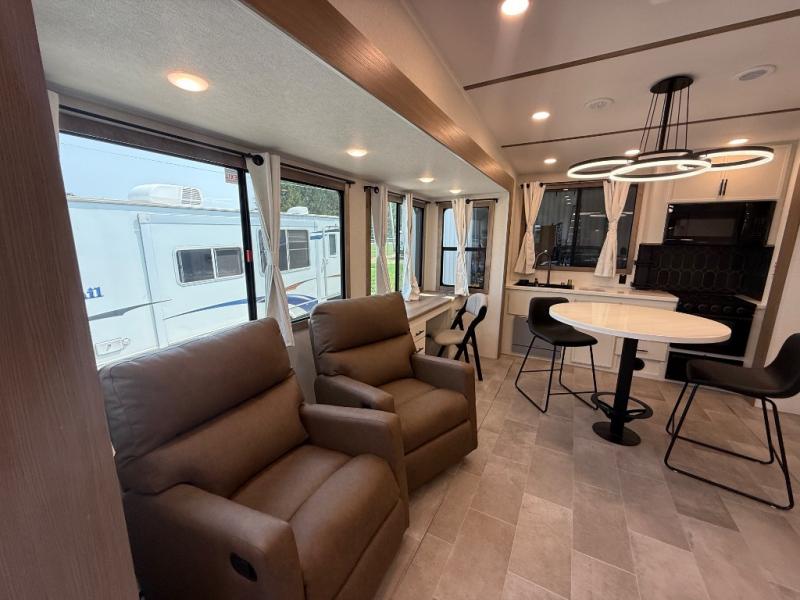 It's easy to see why this fifth wheel was voted Best New Model for 2025 by RV Pro! There are many residential features, such as a middle table with four seats, dual recliners, a desk to get some work done, and a master bedroom you are sure to love. You'll find a king bed with Versa Tilt technology, a dresser, and TV prep. A front master bath includes a walk-in shower with a skylight, dual bath sinks with a back-lit mirror, and a closet with shelves. The middle mud room includes washer/dryer prep, counter space and a pull-out drying rack to hang up swim clothes, towels, and more. Everyone will enjoy spending time in the main living room that includes dual opposing slides, a tri-fold sofa, and an entertainment center with hidden storage behind. And the chef of your group will love the rear kitchen with its 16 cu. ft. 12V refrigerator and pantry, an oven, and plenty of counter space. Head outdoors to enjoy the two power awnings in the evening!