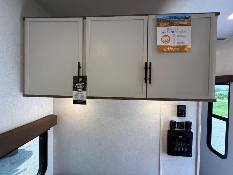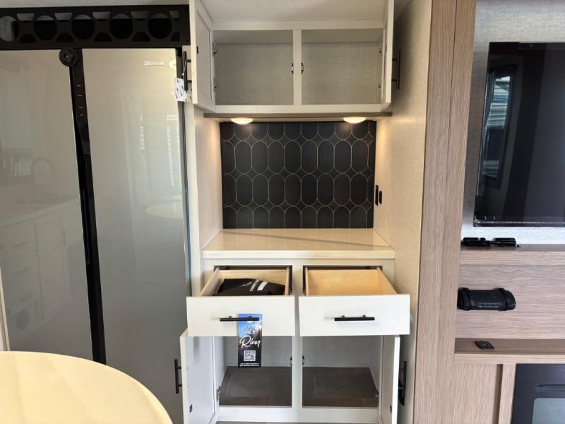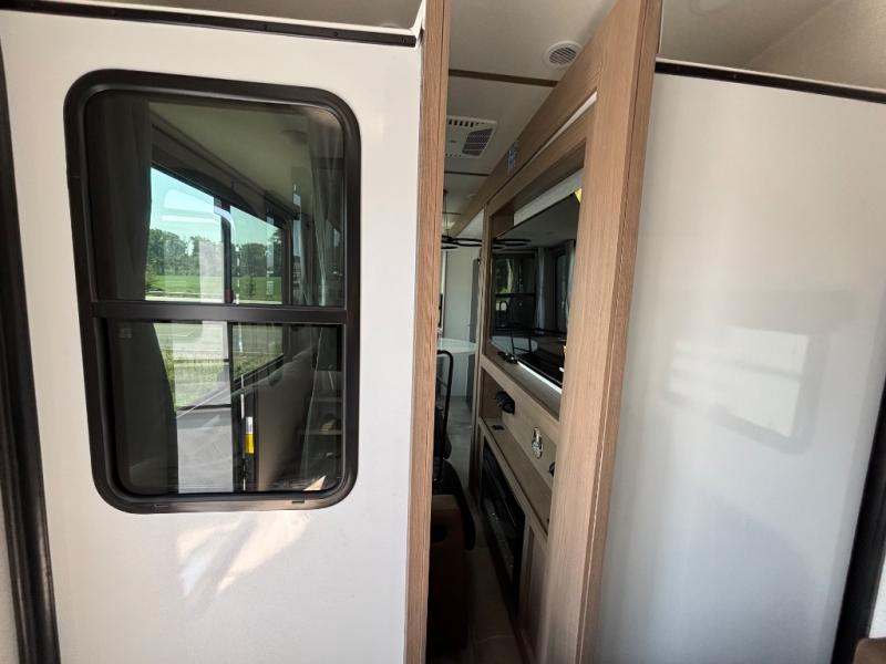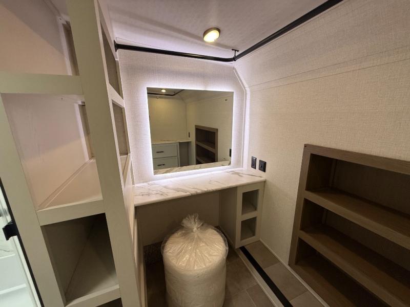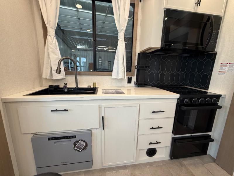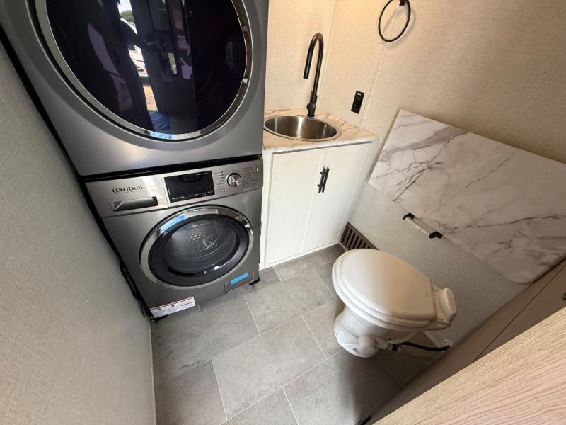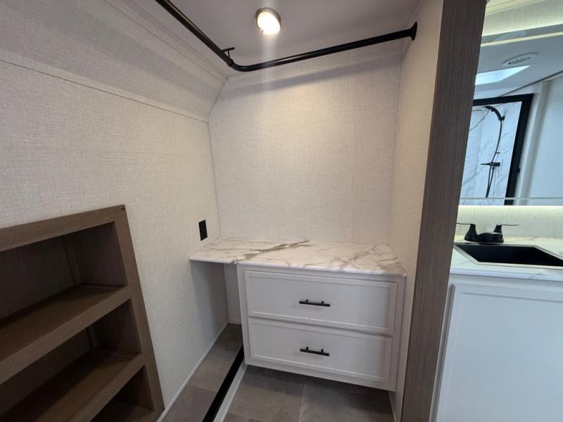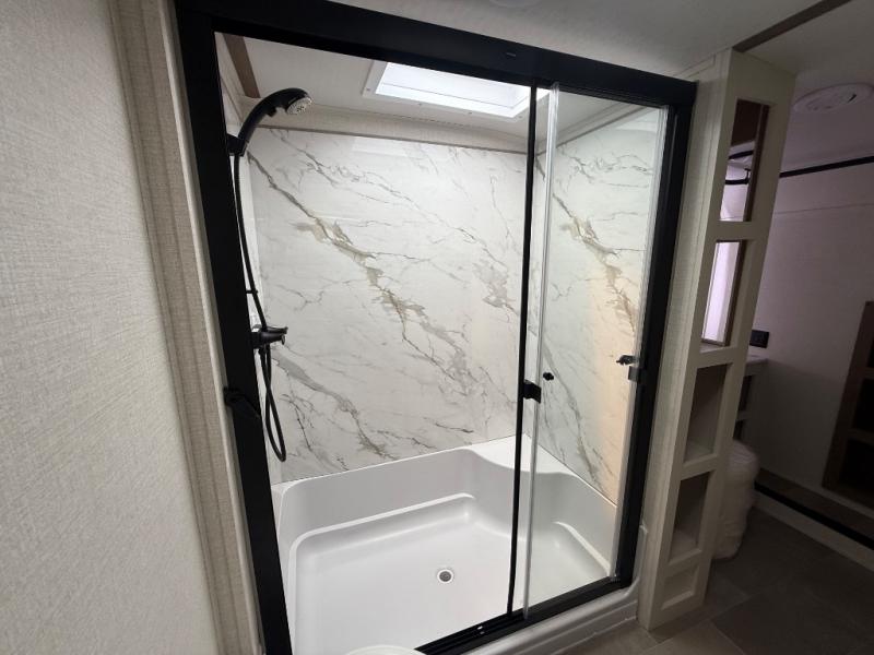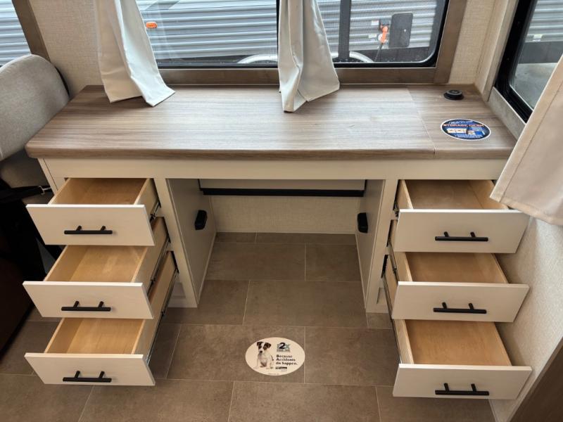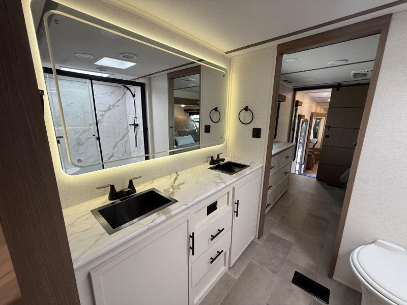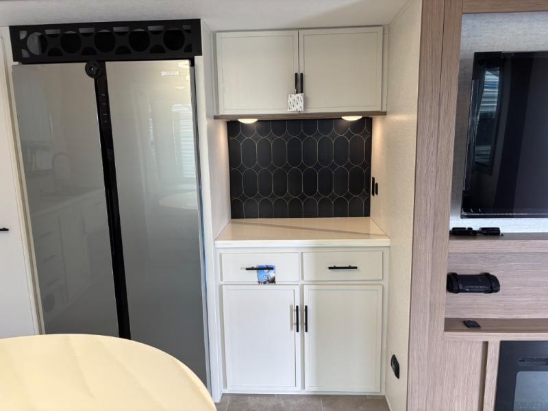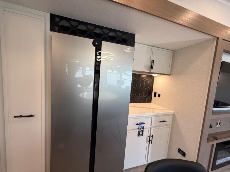 It's easy to see why this fifth wheel was voted Best New Model for 2025 by RV Pro! There are many residential features, such as a middle table with four seats, dual recliners, a desk to get some work done, and a master bedroom you are sure to love. You'll find a king bed with Versa Tilt technology, a dresser, and TV prep. A front master bath includes a walk-in shower with a skylight, dual bath sinks with a back-lit mirror, and a closet with shelves. The middle mud room includes washer/dryer prep, counter space and a pull-out drying rack to hang up swim clothes, towels, and more. Everyone will enjoy spending time in the main living room that includes dual opposing slides, a tri-fold sofa, and an entertainment center with hidden storage behind. And the chef of your group will love the rear kitchen with its 16 cu. ft. 12V refrigerator and pantry, an oven, and plenty of counter space. Head outdoors to enjoy the two power awnings in the evening!