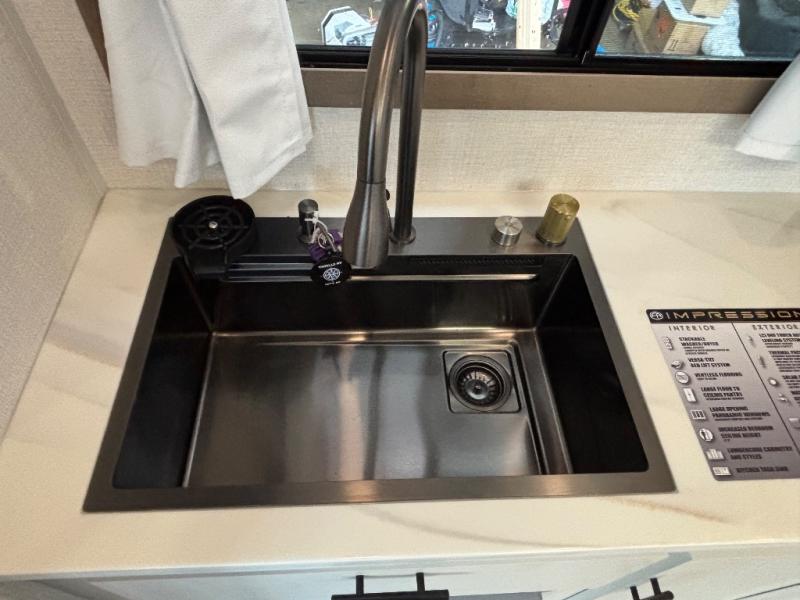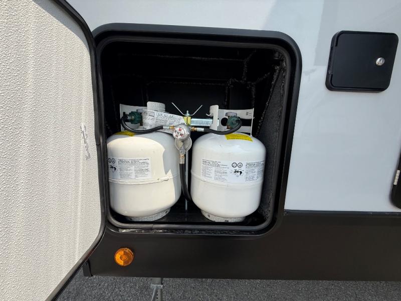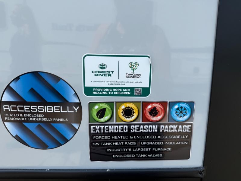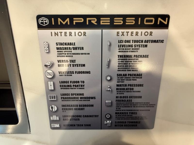 With any Impression mid-profile fifth wheel by Forest River, the focus of the design is comfort and value, built with quality craftsmanship and attention to customer's desires in each Impression! The exterior includes upgraded E-rated tires, custom exterior graphics package, and insulated slam latch baggage doors. There is also an enclosed docking station, an outside shower, and a 100W roof solar panel for off-grid capabilities. The fully heated and enclosed AccessiBelly has removable underbelly panels and offers four seasons of travel, and there is an industry leading 15K A/C plus 35K BTU furnace to keep you comfortable. The interior has lumbercore cabinetry, residential linoleum, residential backsplash in the kitchen, and oversized opening windows in the living area for more natural lighting and good air flow.