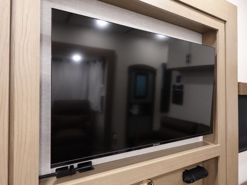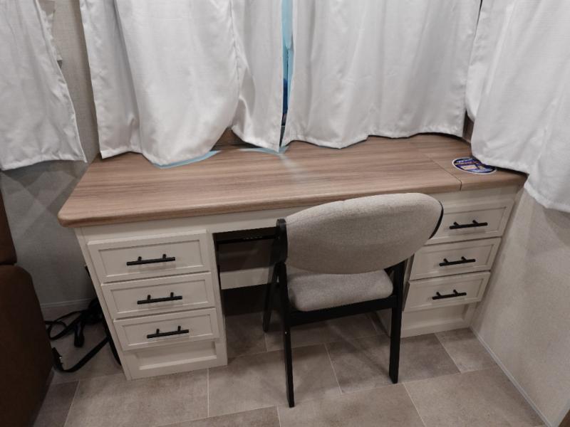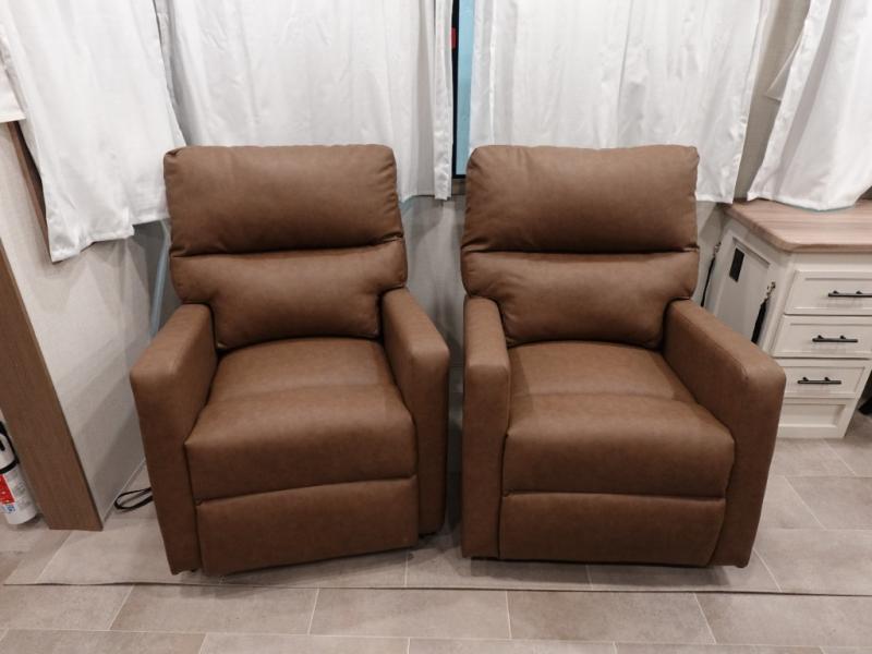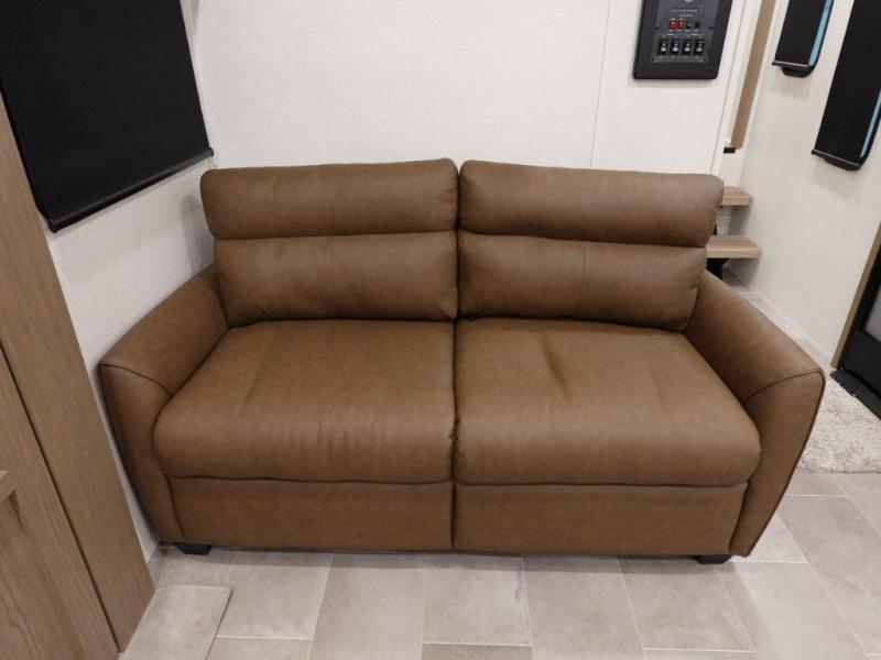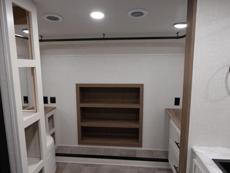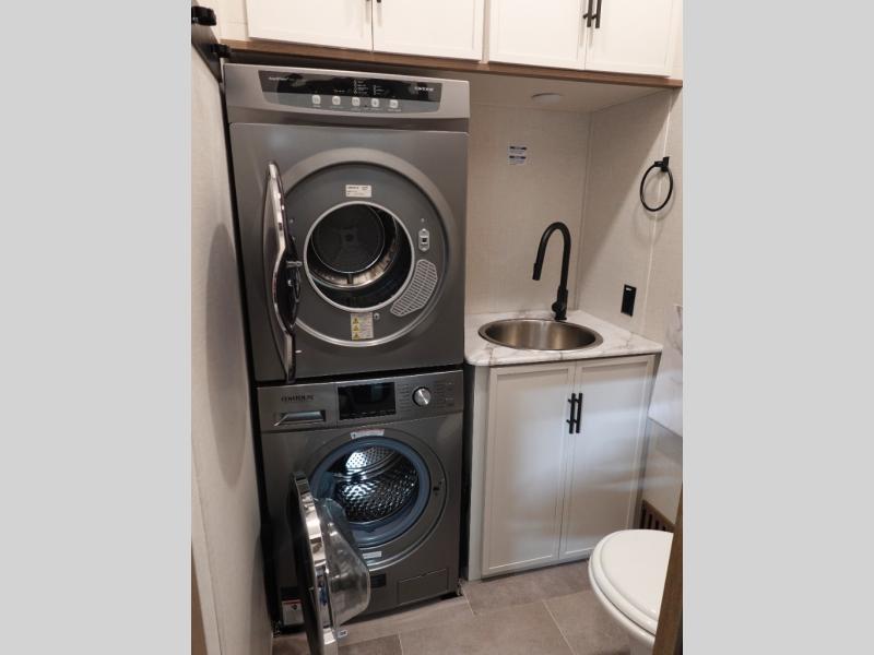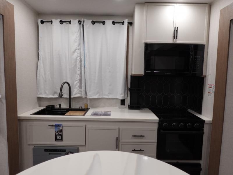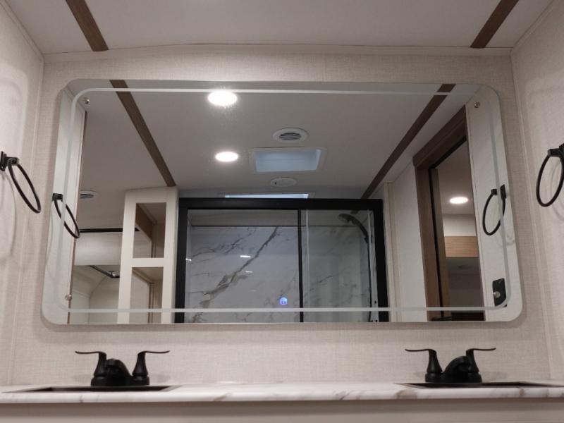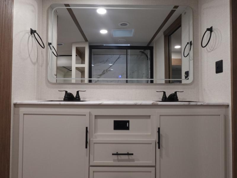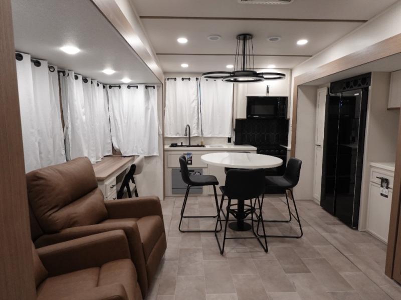 It's easy to see why this fifth wheel was voted Best New Model for 2025 by RV Pro! There are many residential features, such as a middle table with four seats, dual recliners, a desk to get some work done, and a master bedroom you are sure to love. You'll find a king bed with Versa Tilt technology, a dresser, and TV prep. A front master bath includes a walk-in shower with a skylight, dual bath sinks with a back-lit mirror, and a closet with shelves. The middle mud room includes washer/dryer prep, counter space and a pull-out drying rack to hang up swim clothes, towels, and more. Everyone will enjoy spending time in the main living room that includes dual opposing slides, a tri-fold sofa, and an entertainment center with hidden storage behind. And the chef of your group will love the rear kitchen with its 16 cu. ft. 12V refrigerator and pantry, an oven, and plenty of counter space. Head outdoors to enjoy the two power awnings in the evening!