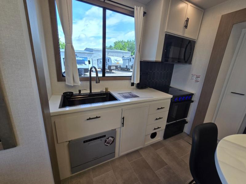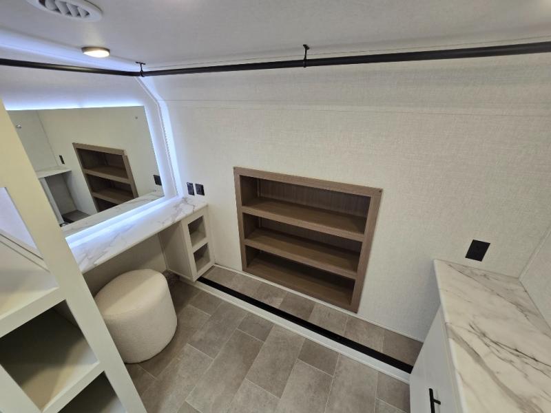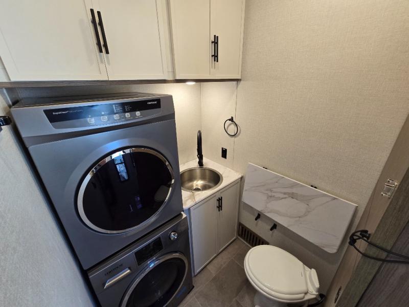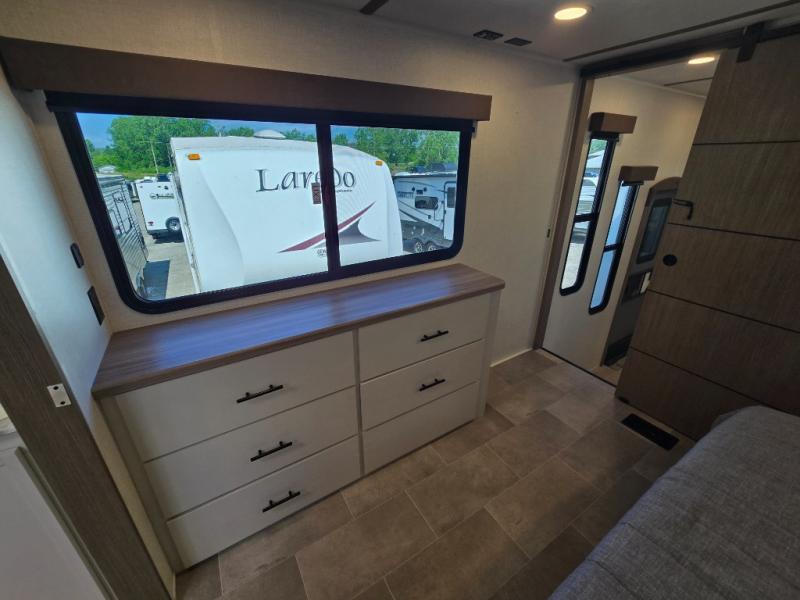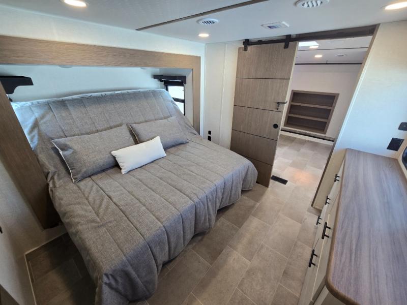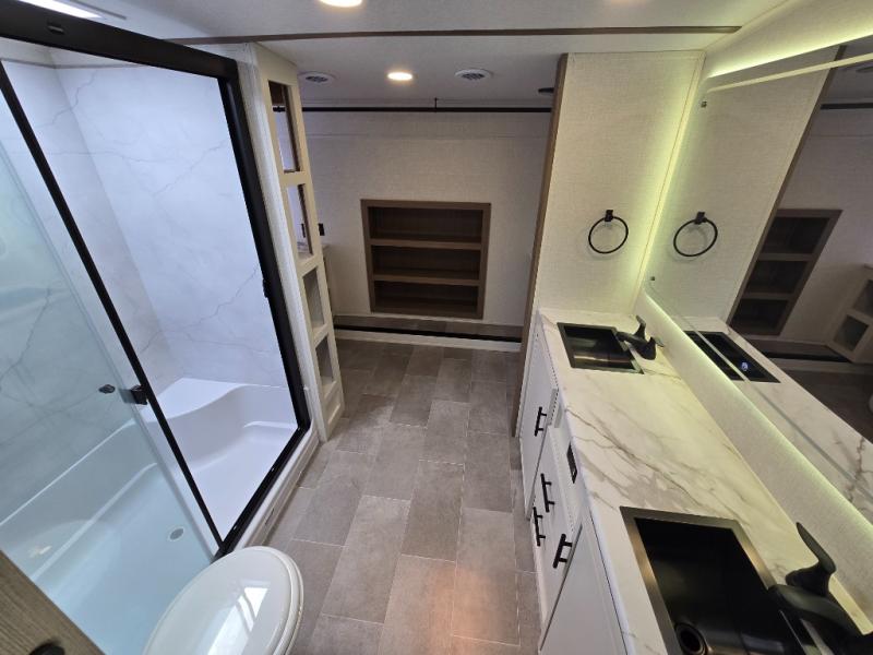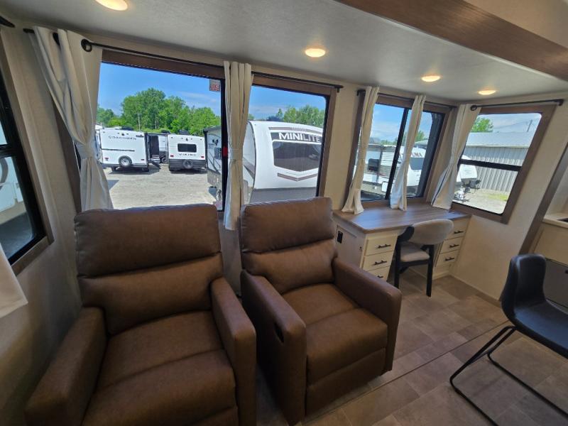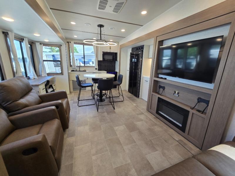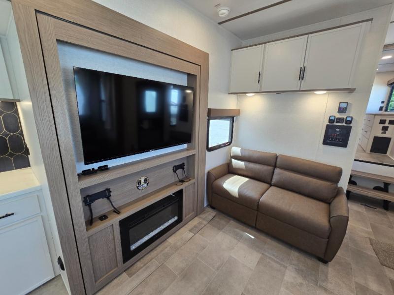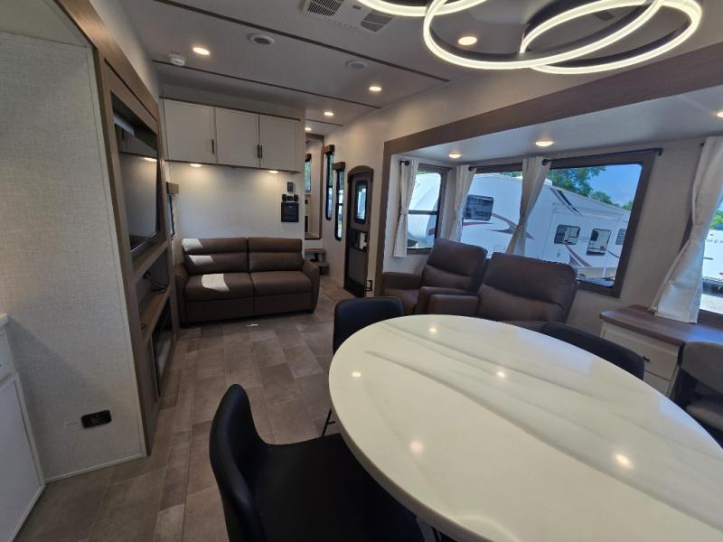 It's easy to see why this fifth wheel was voted Best New Model for 2025 by RV Pro! There are many residential features, such as a middle table with four seats, dual recliners, a desk to get some work done, and a master bedroom you are sure to love. You'll find a king bed with Versa Tilt technology, a dresser, and TV prep. A front master bath includes a walk-in shower with a skylight, dual bath sinks with a back-lit mirror, and a closet with shelves. The middle mud room includes washer/dryer prep, counter space and a pull-out drying rack to hang up swim clothes, towels, and more. Everyone will enjoy spending time in the main living room that includes dual opposing slides, a tri-fold sofa, and an entertainment center with hidden storage behind. And the chef of your group will love the rear kitchen with its 16 cu. ft. 12V refrigerator and pantry, an oven, and plenty of counter space. Head outdoors to enjoy the two power awnings in the evening!