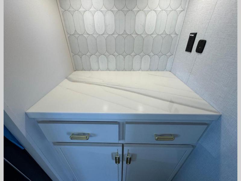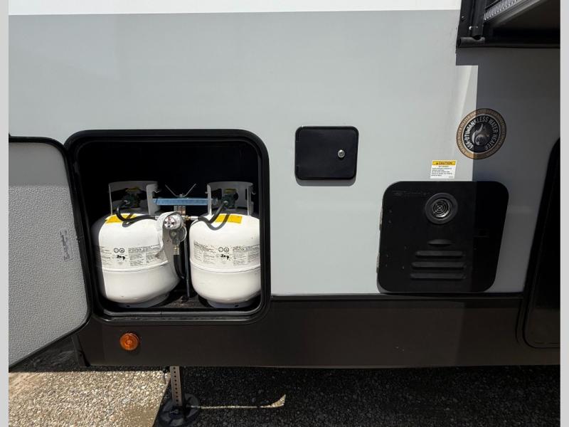 With any Impression mid-profile fifth wheel by Forest River, the focus of the design is comfort and value, built with quality craftsmanship and attention to customer's desires in each Impression! The exterior includes upgraded E-rated tires, custom exterior graphics package, and insulated slam latch baggage doors. There is also an enclosed docking station, an outside shower, and a 100W roof solar panel for off-grid capabilities. The fully heated and enclosed AccessiBelly has removable underbelly panels and offers four seasons of travel, and there is an industry leading 15K A/C plus 35K BTU furnace to keep you comfortable. The interior has lumbercore cabinetry, residential linoleum, residential backsplash in the kitchen, and oversized opening windows in the living area for more natural lighting and good air flow.