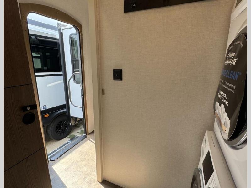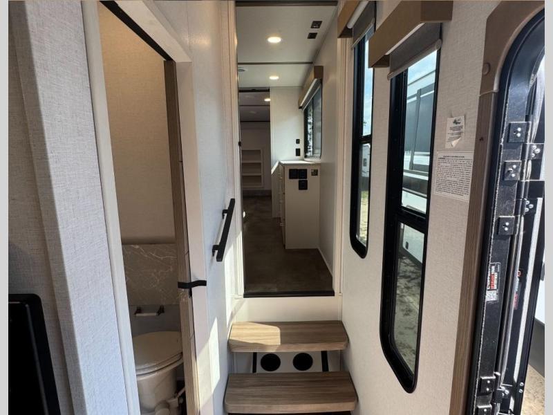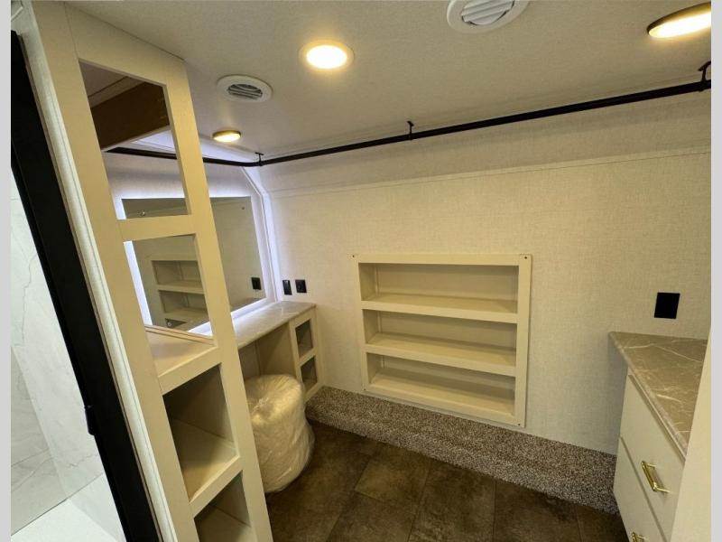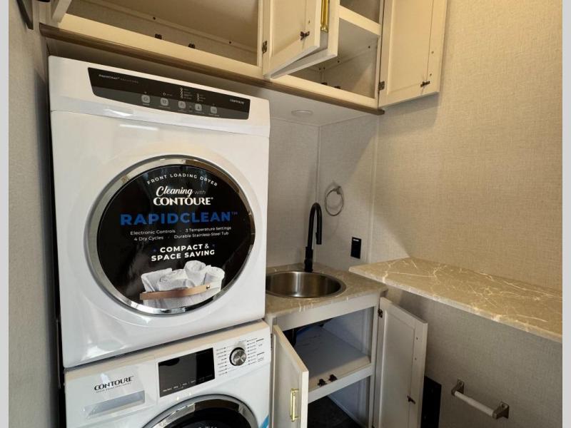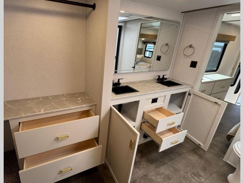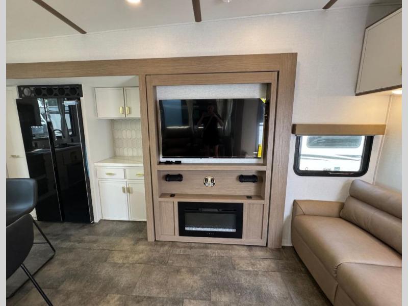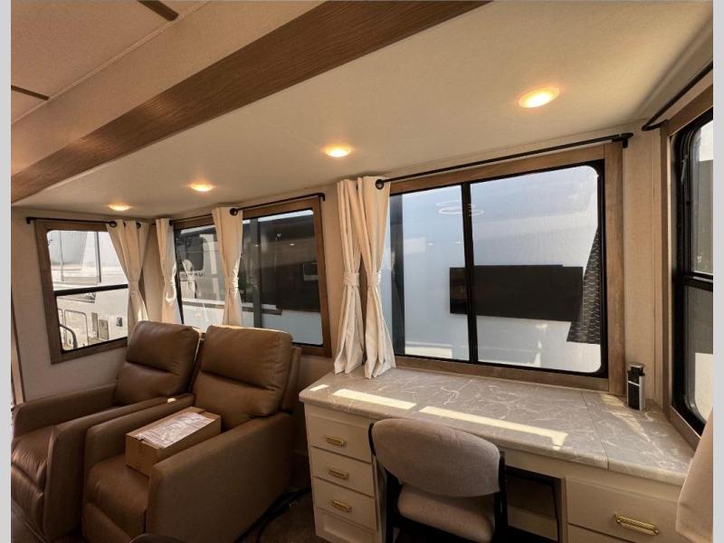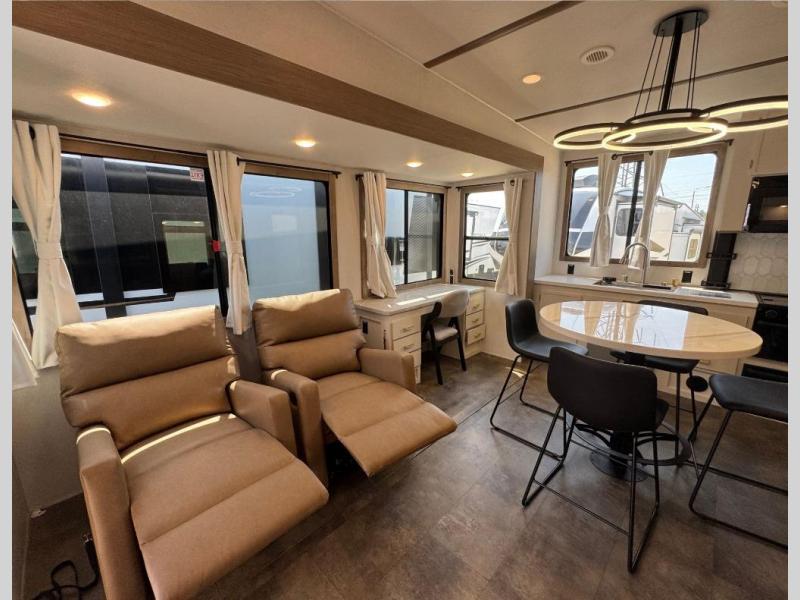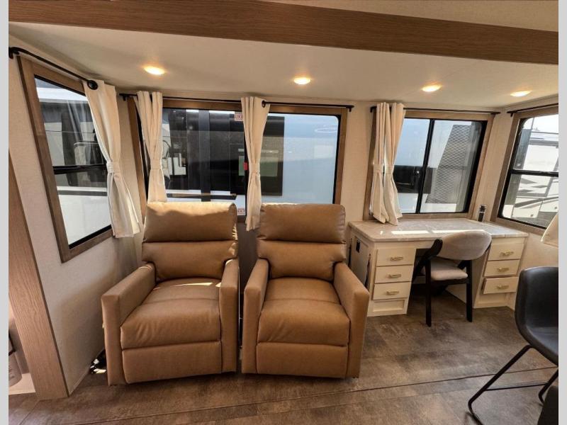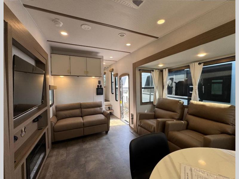 It's easy to see why this fifth wheel was voted Best New Model for 2025 by RV Pro! There are many residential features, such as a middle table with four seats, dual recliners, a desk to get some work done, and a master bedroom you are sure to love. You'll find a king bed with Versa Tilt technology, a dresser, and TV prep. A front master bath includes a walk-in shower with a skylight, dual bath sinks with a back-lit mirror, and a closet with shelves. The middle mud room includes washer/dryer prep, counter space and a pull-out drying rack to hang up swim clothes, towels, and more. Everyone will enjoy spending time in the main living room that includes dual opposing slides, a tri-fold sofa, and an entertainment center with hidden storage behind. And the chef of your group will love the rear kitchen with its 16 cu. ft. 12V refrigerator and pantry, an oven, and plenty of counter space. Head outdoors to enjoy the two power awnings in the evening!