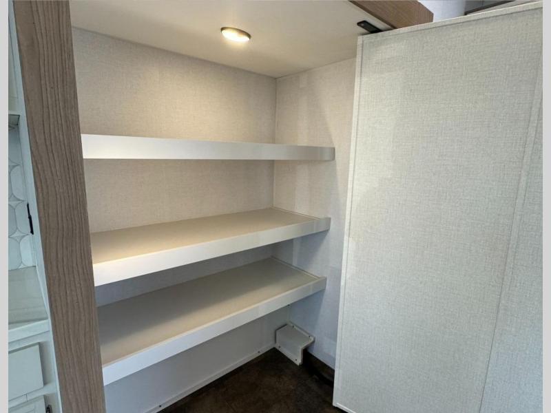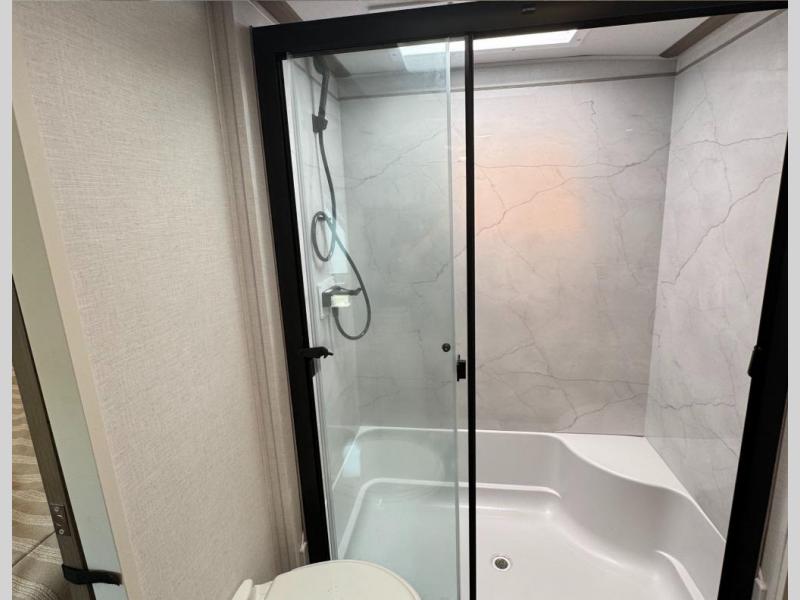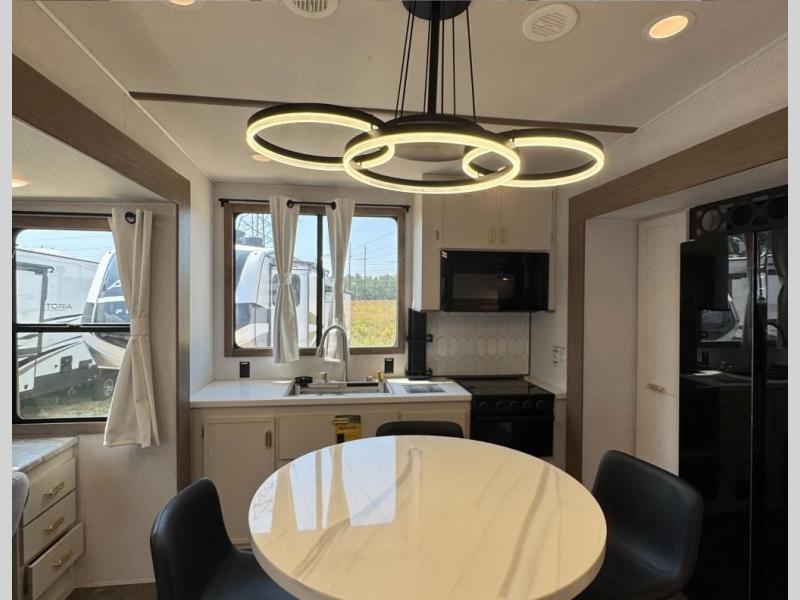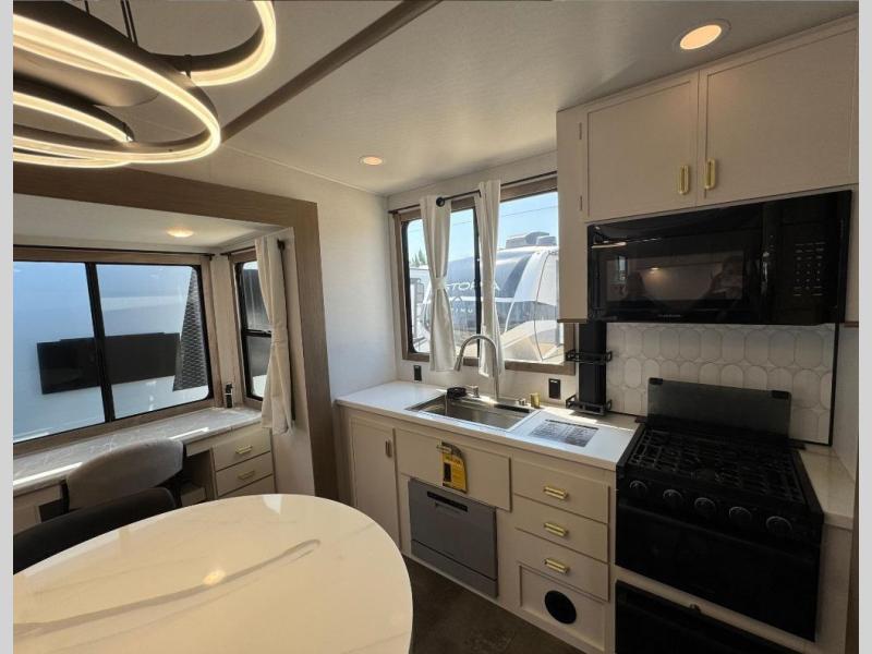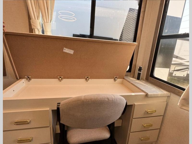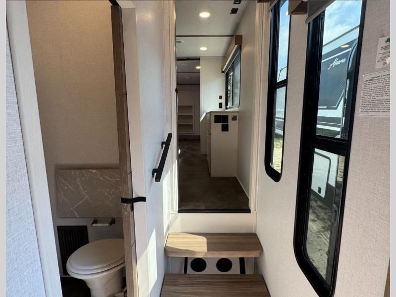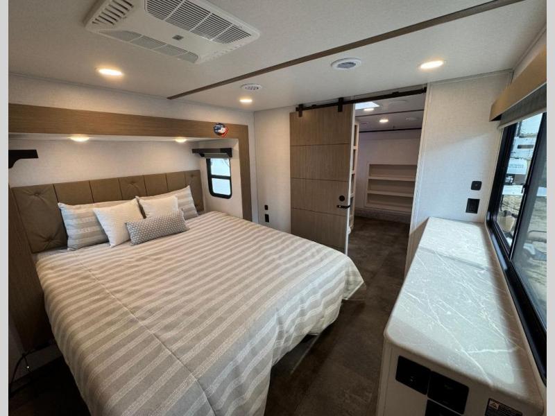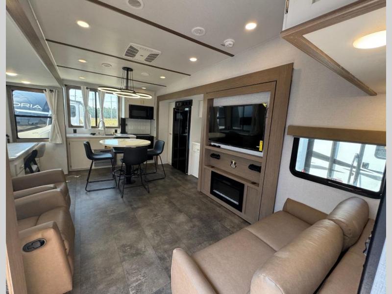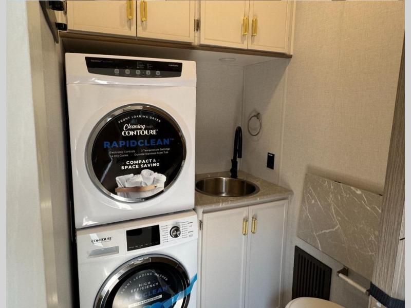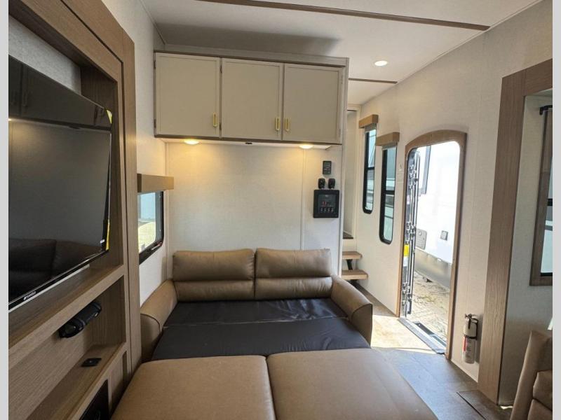It's easy to see why this fifth wheel was voted Best New Model for 2025 by RV Pro! There are many residential features, such as a middle table with four seats, dual recliners, a desk to get some work done, and a master bedroom you are sure to love. You'll find a king bed with Versa Tilt technology, a dresser, and TV prep. A front master bath includes a walk-in shower with a skylight, dual bath sinks with a back-lit mirror, and a closet with shelves. The middle mud room includes washer/dryer prep, counter space and a pull-out drying rack to hang up swim clothes, towels, and more. Everyone will enjoy spending time in the main living room that includes dual opposing slides, a tri-fold sofa, and an entertainment center with hidden storage behind. And the chef of your group will love the rear kitchen with its 16 cu. ft. 12V refrigerator and pantry, an oven, and plenty of counter space. Head outdoors to enjoy the two power awnings in the evening!