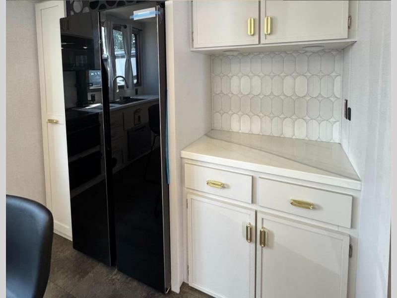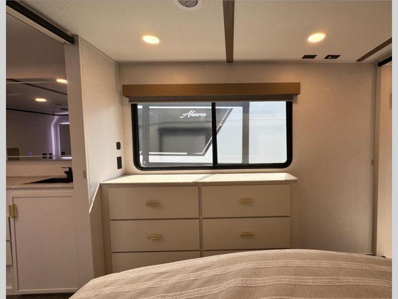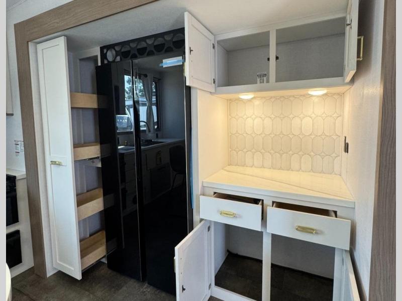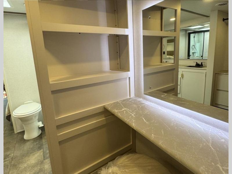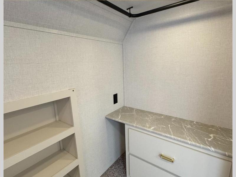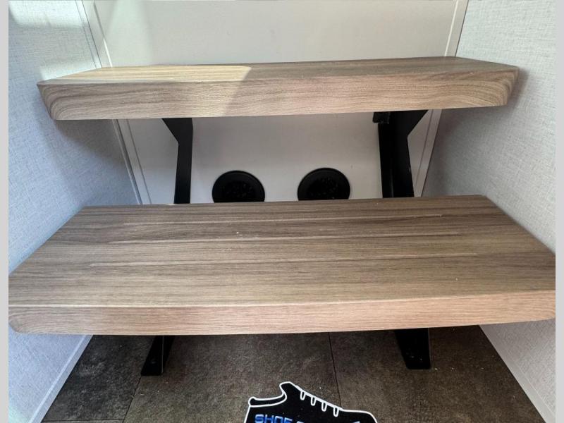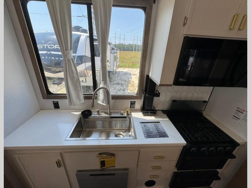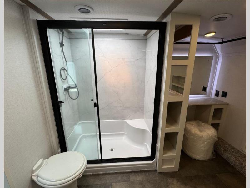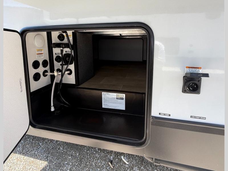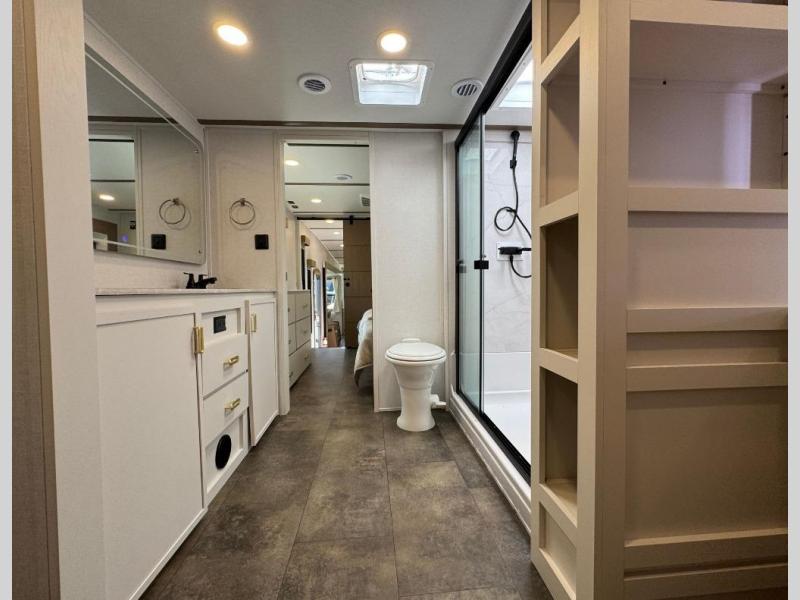 It's easy to see why this fifth wheel was voted Best New Model for 2025 by RV Pro! There are many residential features, such as a middle table with four seats, dual recliners, a desk to get some work done, and a master bedroom you are sure to love. You'll find a king bed with Versa Tilt technology, a dresser, and TV prep. A front master bath includes a walk-in shower with a skylight, dual bath sinks with a back-lit mirror, and a closet with shelves. The middle mud room includes washer/dryer prep, counter space and a pull-out drying rack to hang up swim clothes, towels, and more. Everyone will enjoy spending time in the main living room that includes dual opposing slides, a tri-fold sofa, and an entertainment center with hidden storage behind. And the chef of your group will love the rear kitchen with its 16 cu. ft. 12V refrigerator and pantry, an oven, and plenty of counter space. Head outdoors to enjoy the two power awnings in the evening!