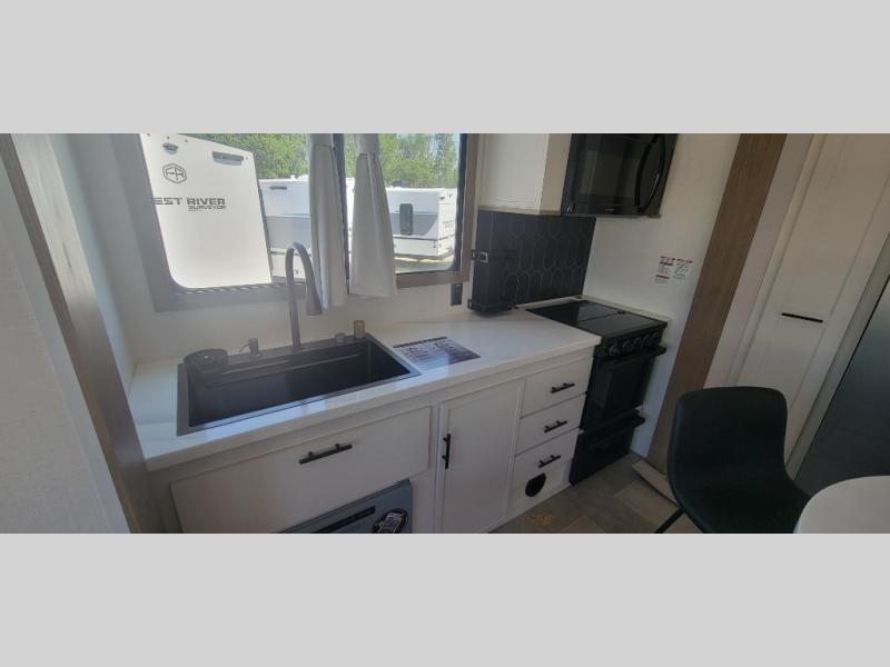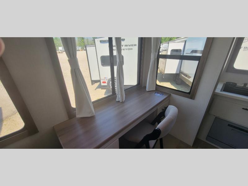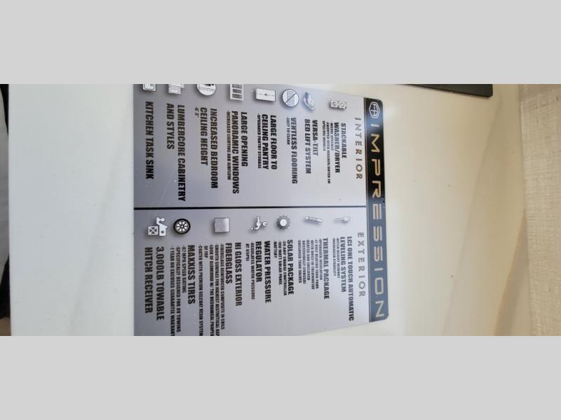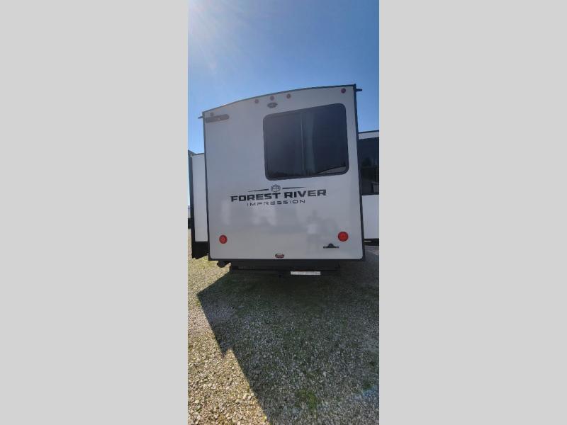 With any Impression mid-profile fifth wheel by Forest River, the focus of the design is comfort and value, built with quality craftsmanship and attention to customer's desires in each Impression! The exterior includes upgraded E-rated tires, custom exterior graphics package, and insulated slam latch baggage doors. There is also an enclosed docking station, an outside shower, and a 100W roof solar panel for off-grid capabilities. The fully heated and enclosed AccessiBelly has removable underbelly panels and offers four seasons of travel, and there is an industry leading 15K A/C plus 35K BTU furnace to keep you comfortable. The interior has lumbercore cabinetry, residential linoleum, residential backsplash in the kitchen, and oversized opening windows in the living area for more natural lighting and good air flow.