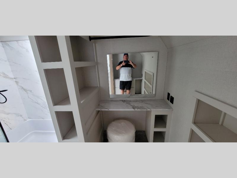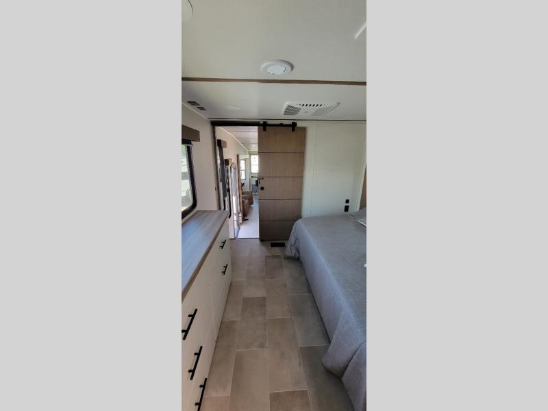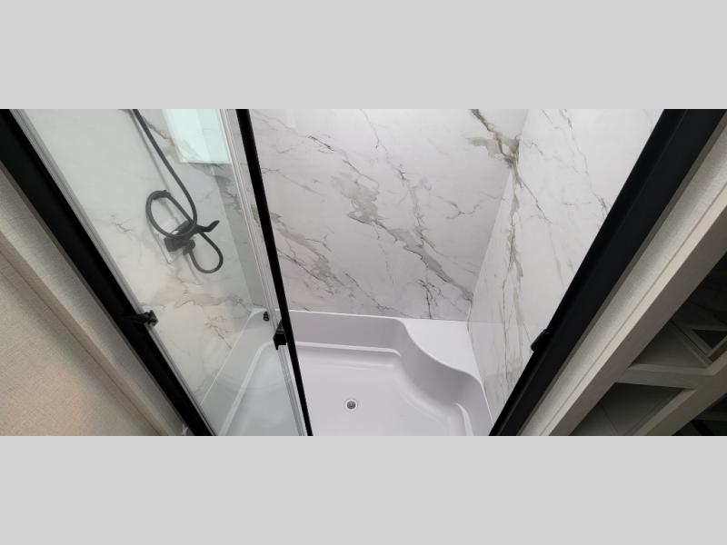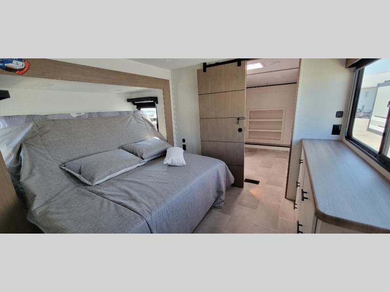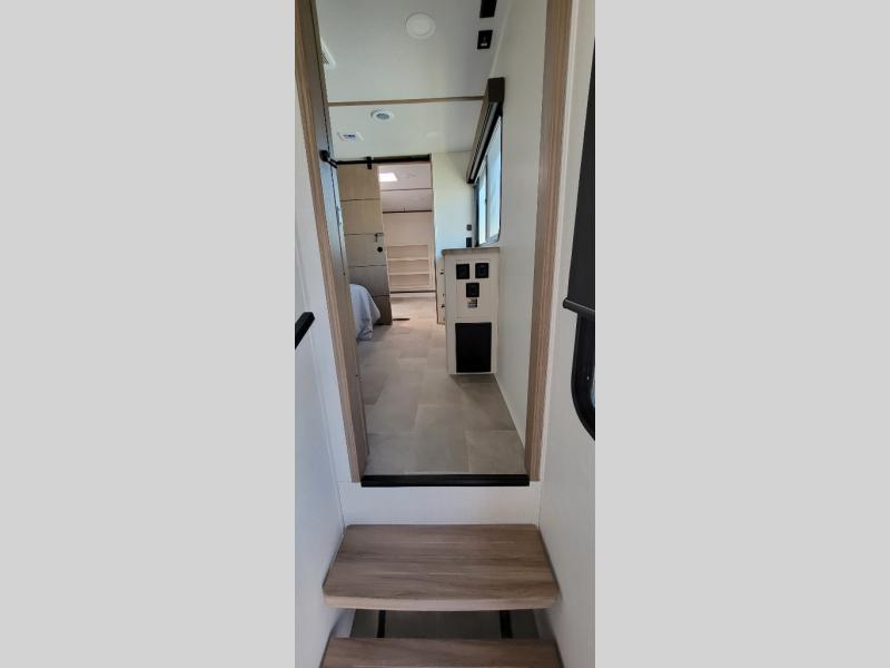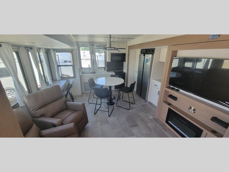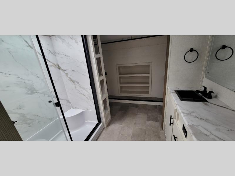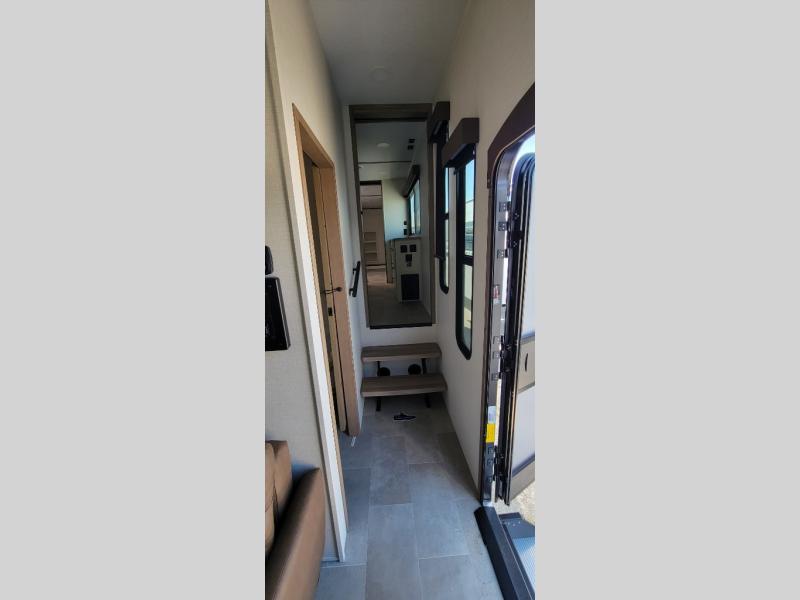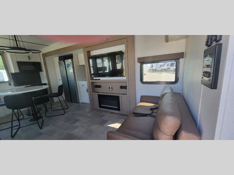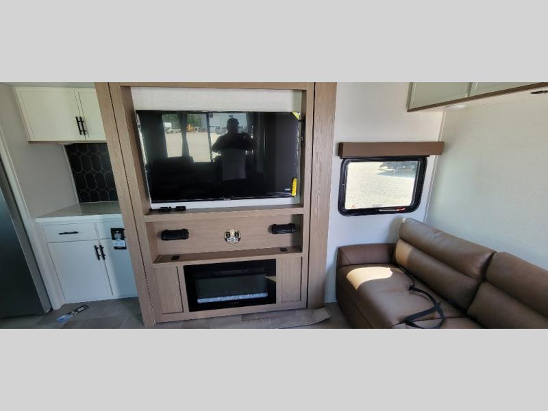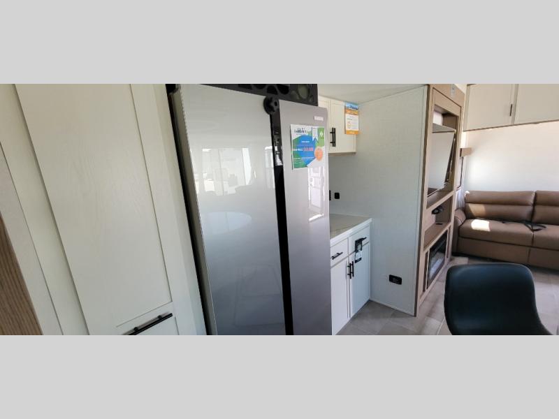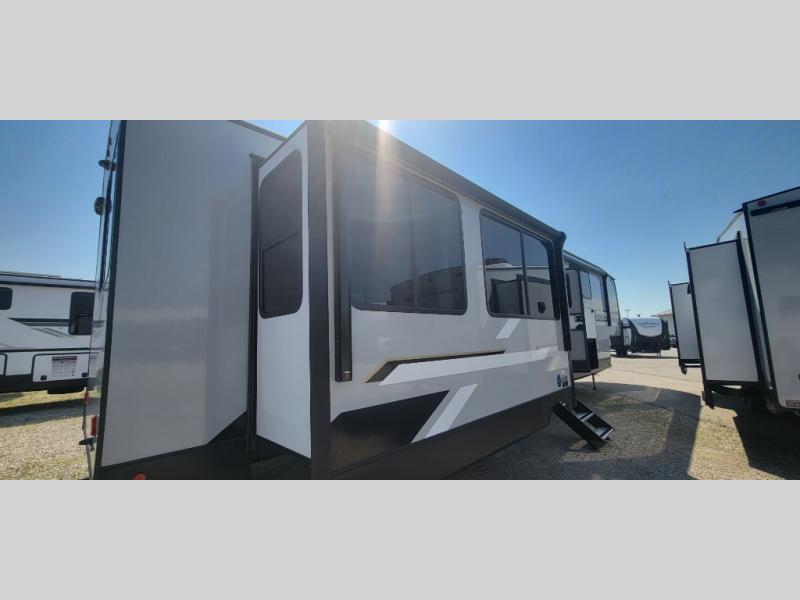 It's easy to see why this fifth wheel was voted Best New Model for 2025 by RV Pro! There are many residential features, such as a middle table with four seats, dual recliners, a desk to get some work done, and a master bedroom you are sure to love. You'll find a king bed with Versa Tilt technology, a dresser, and TV prep. A front master bath includes a walk-in shower with a skylight, dual bath sinks with a back-lit mirror, and a closet with shelves. The middle mud room includes washer/dryer prep, counter space and a pull-out drying rack to hang up swim clothes, towels, and more. Everyone will enjoy spending time in the main living room that includes dual opposing slides, a tri-fold sofa, and an entertainment center with hidden storage behind. And the chef of your group will love the rear kitchen with its 16 cu. ft. 12V refrigerator and pantry, an oven, and plenty of counter space. Head outdoors to enjoy the two power awnings in the evening!