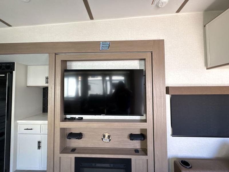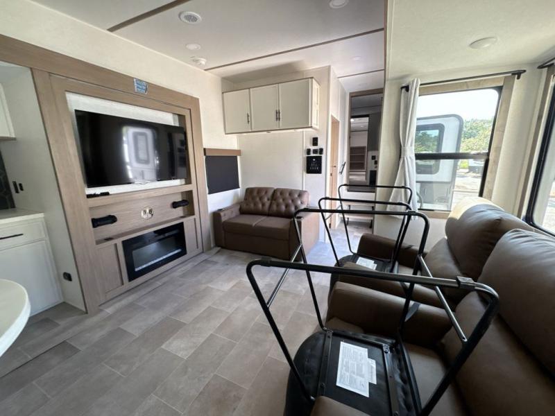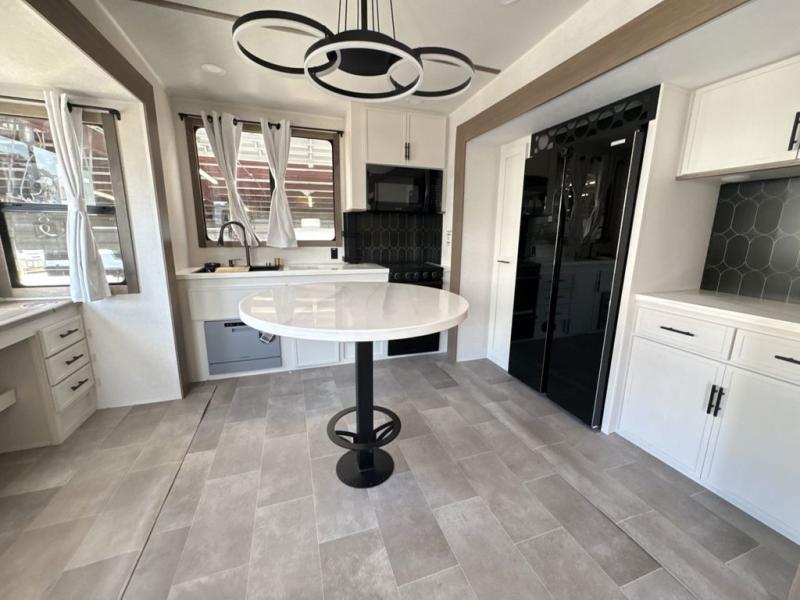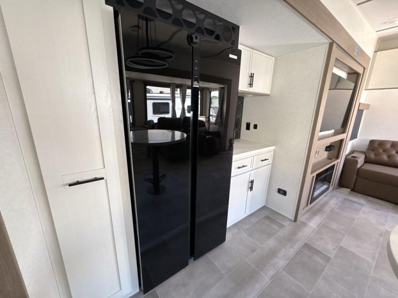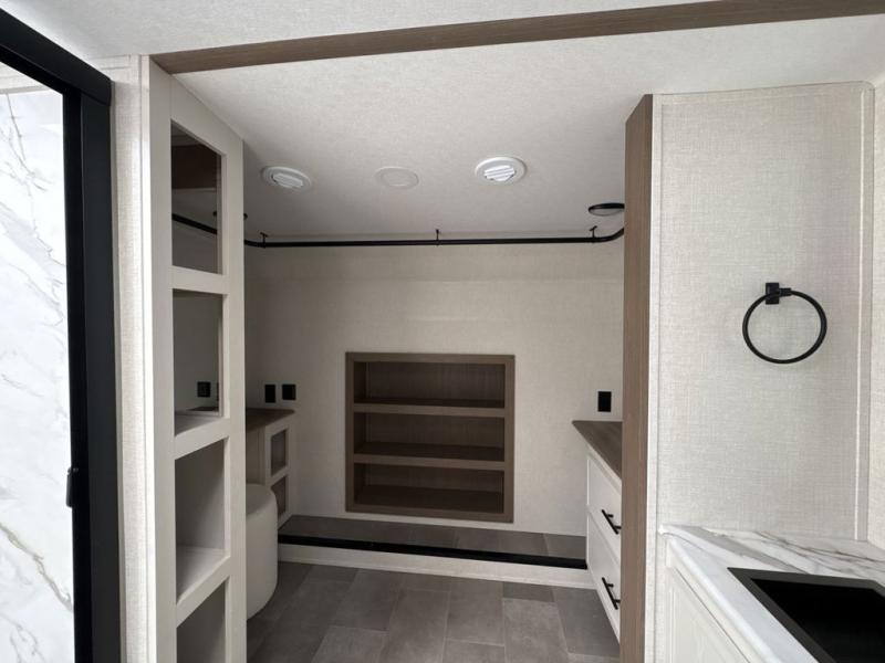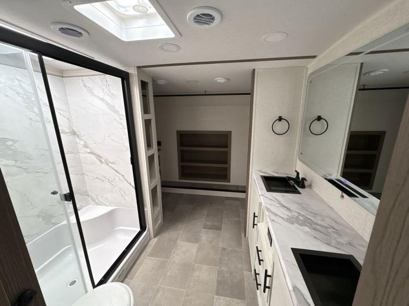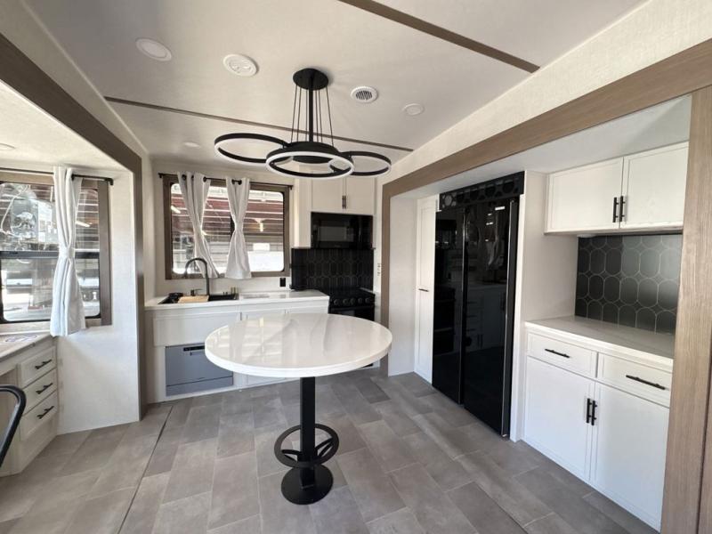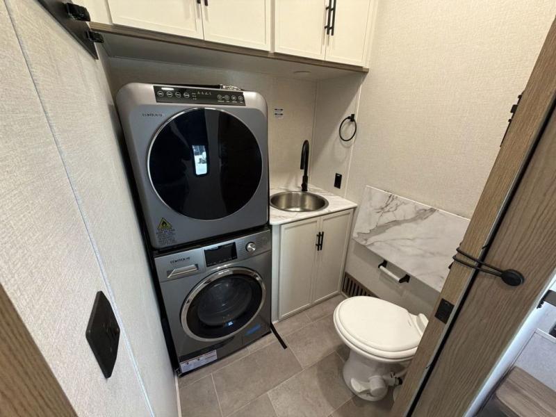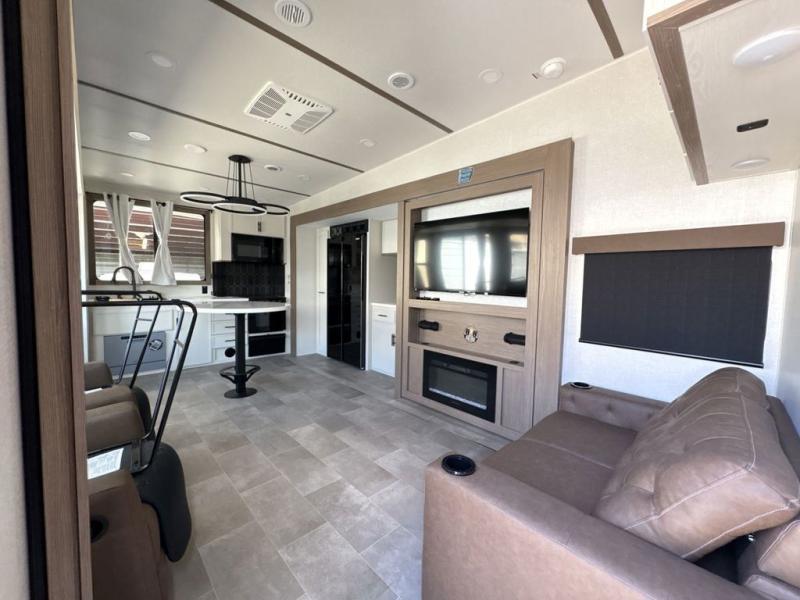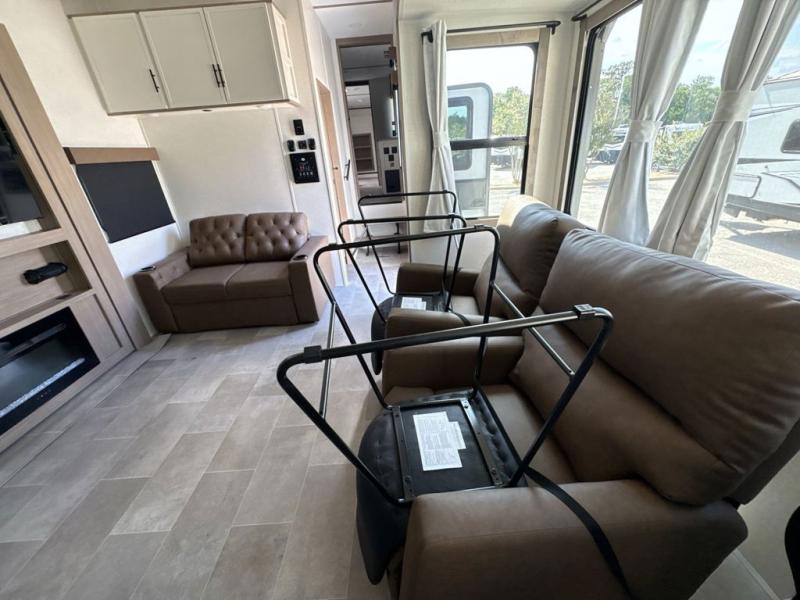 It's easy to see why this fifth wheel was voted Best New Model for 2025 by RV Pro! There are many residential features, such as a middle table with four seats, dual recliners, a desk to get some work done, and a master bedroom you are sure to love. You'll find a king bed with Versa Tilt technology, a dresser, and TV prep. A front master bath includes a walk-in shower with a skylight, dual bath sinks with a back-lit mirror, and a closet with shelves. The middle mud room includes washer/dryer prep, counter space and a pull-out drying rack to hang up swim clothes, towels, and more. Everyone will enjoy spending time in the main living room that includes dual opposing slides, a tri-fold sofa, and an entertainment center with hidden storage behind. And the chef of your group will love the rear kitchen with its 16 cu. ft. 12V refrigerator and pantry, an oven, and plenty of counter space. Head outdoors to enjoy the two power awnings in the evening!