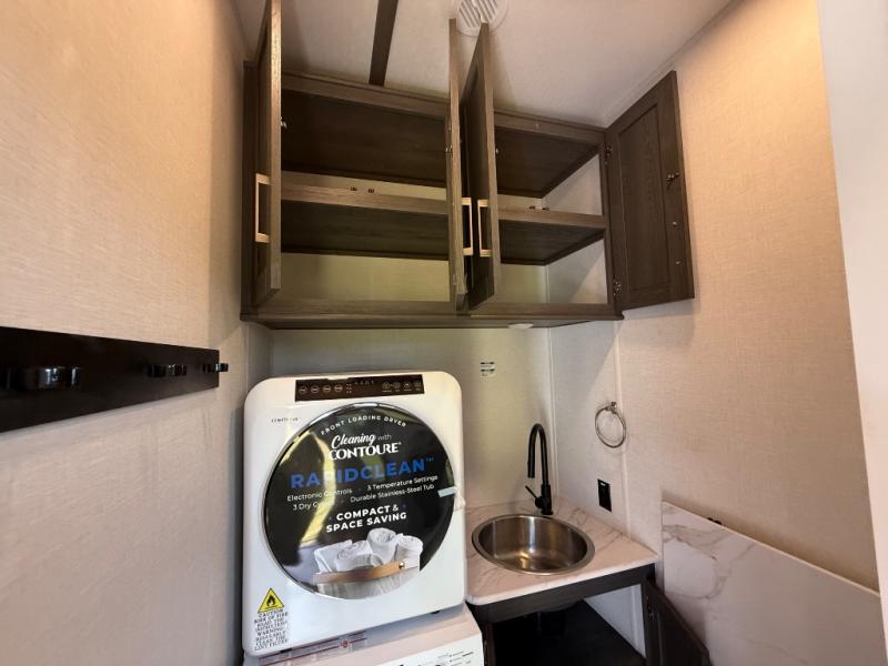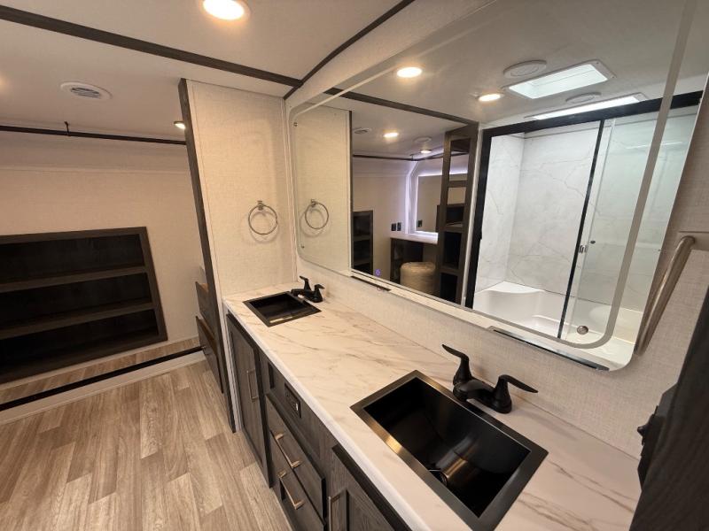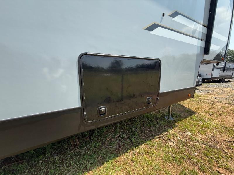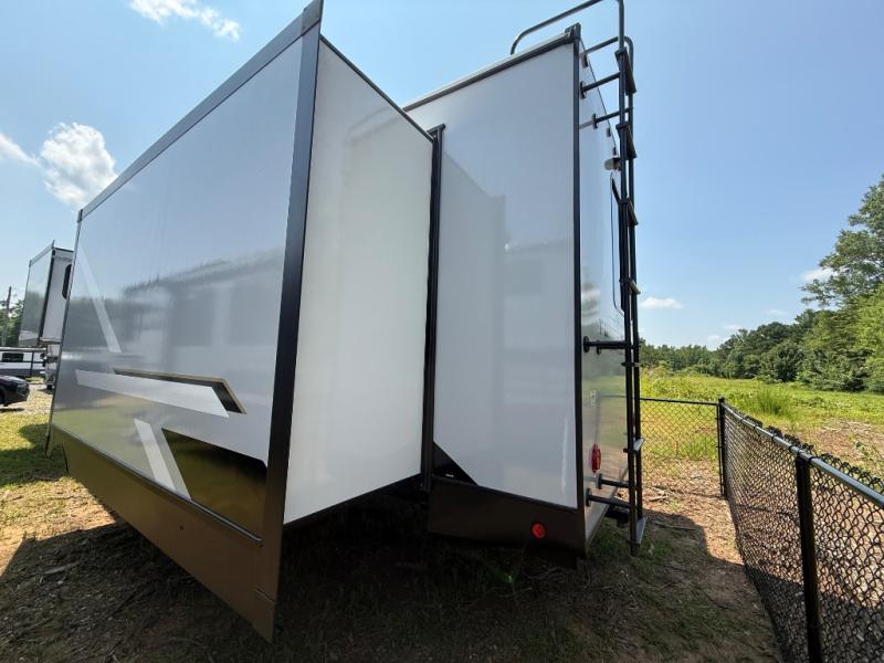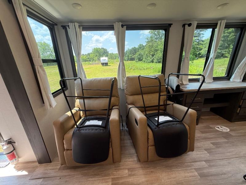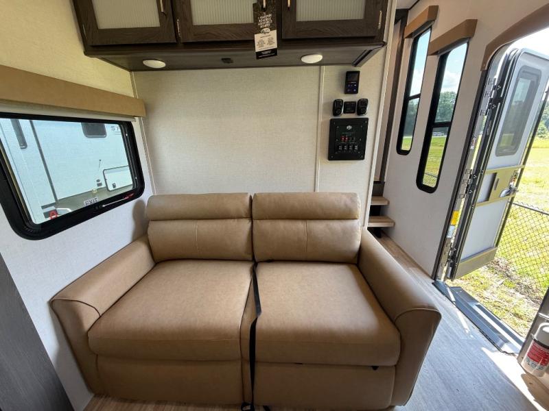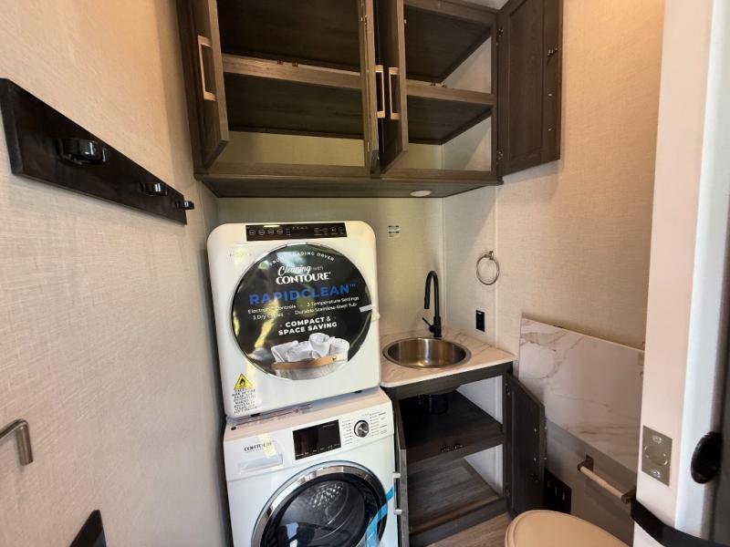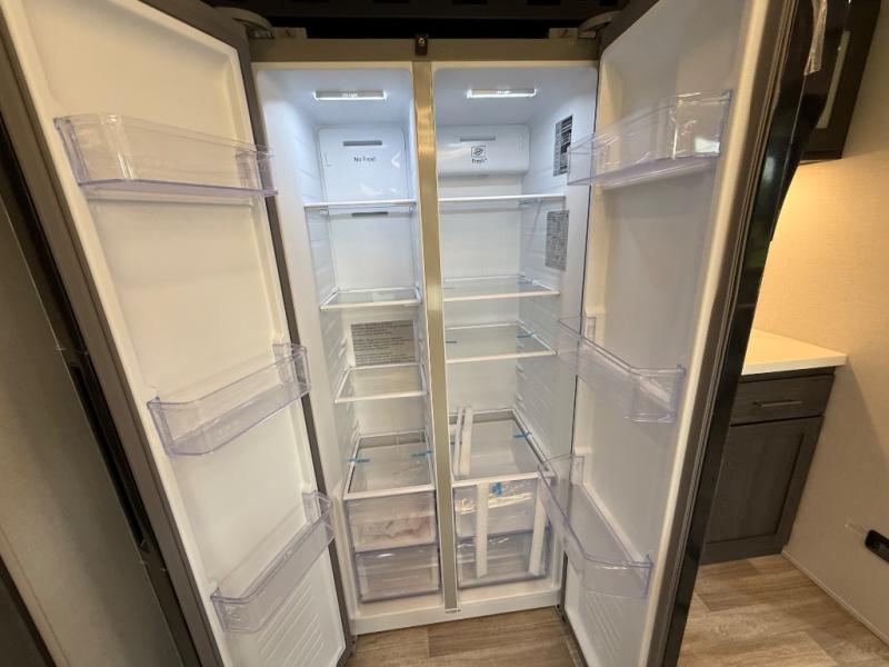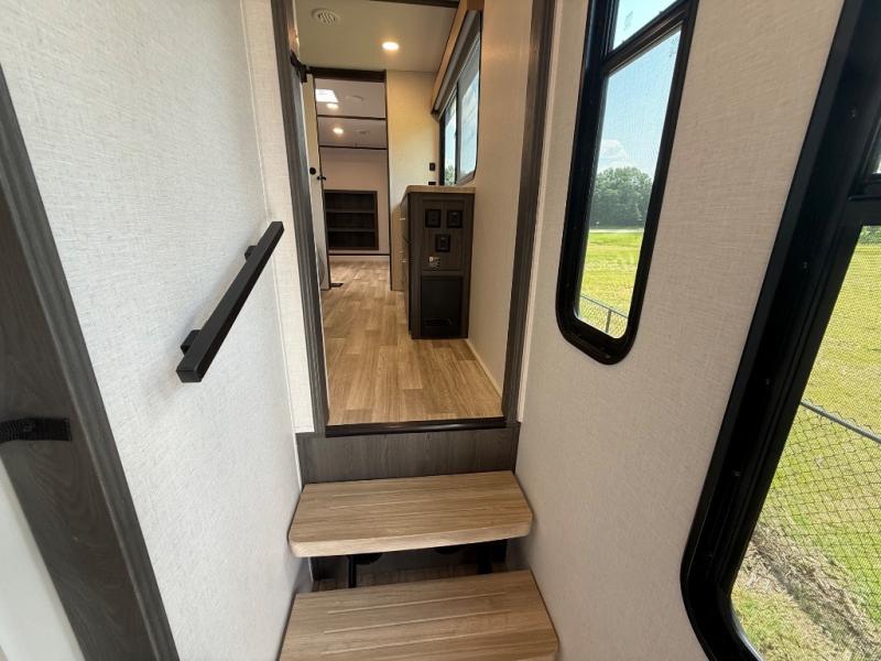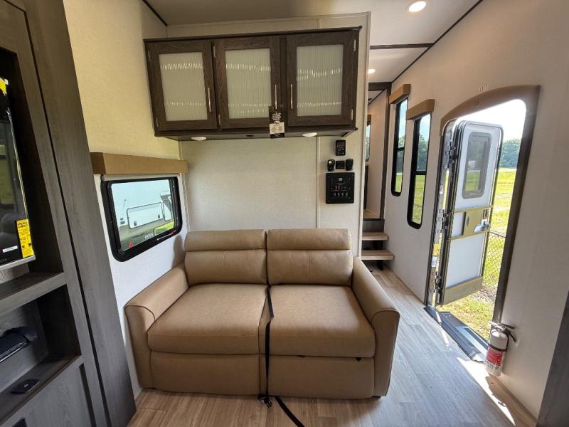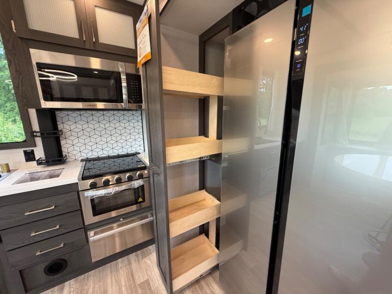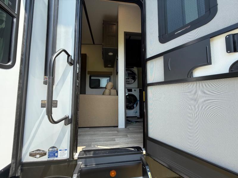It's easy to see why this fifth wheel was voted Best New Model for 2025 by RV Pro! There are many residential features, such as a middle table with four seats, dual recliners, a desk to get some work done, and a master bedroom you are sure to love. You'll find a king bed with Versa Tilt technology, a dresser, and TV prep. A front master bath includes a walk-in shower with a skylight, dual bath sinks with a back-lit mirror, and a closet with shelves. The middle mud room includes washer/dryer prep, counter space and a pull-out drying rack to hang up swim clothes, towels, and more. Everyone will enjoy spending time in the main living room that includes dual opposing slides, a tri-fold sofa, and an entertainment center with hidden storage behind. And the chef of your group will love the rear kitchen with its 16 cu. ft. 12V refrigerator and pantry, an oven, and plenty of counter space. Head outdoors to enjoy the two power awnings in the evening!