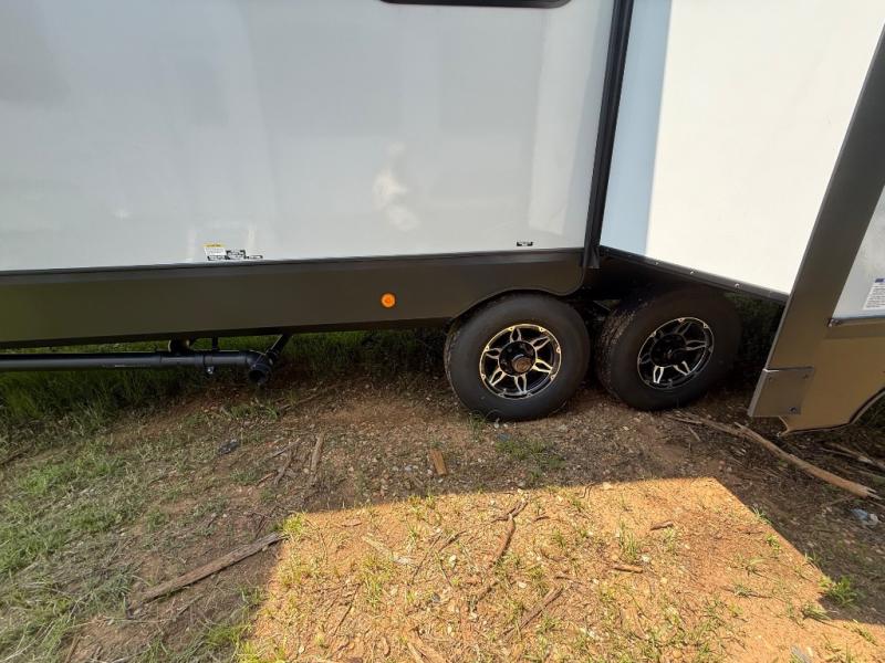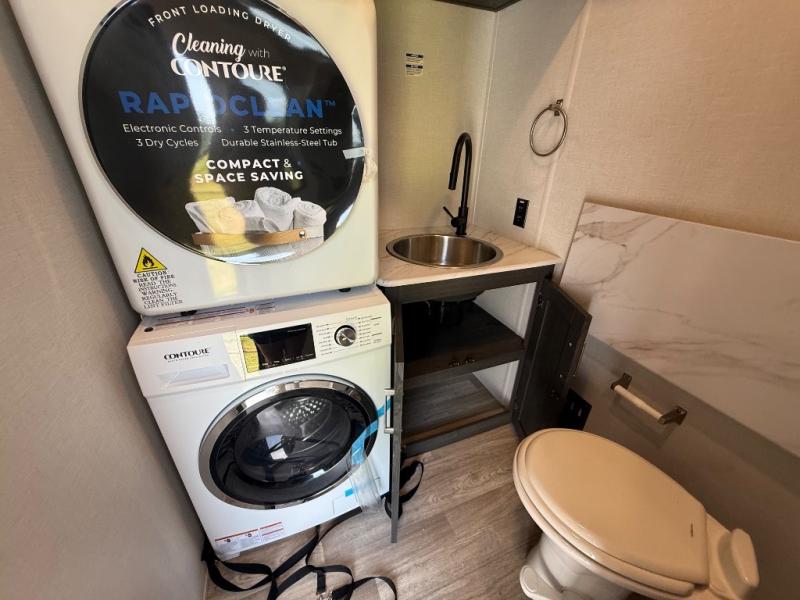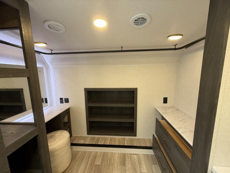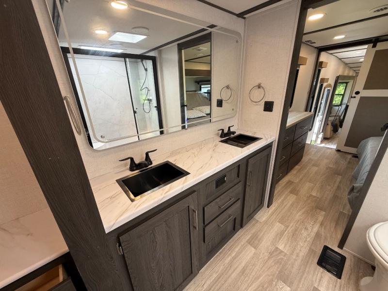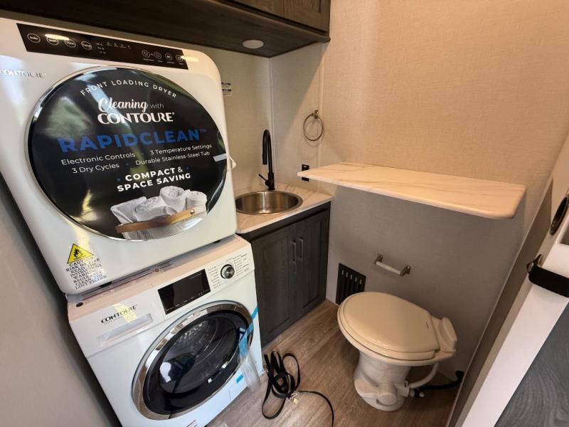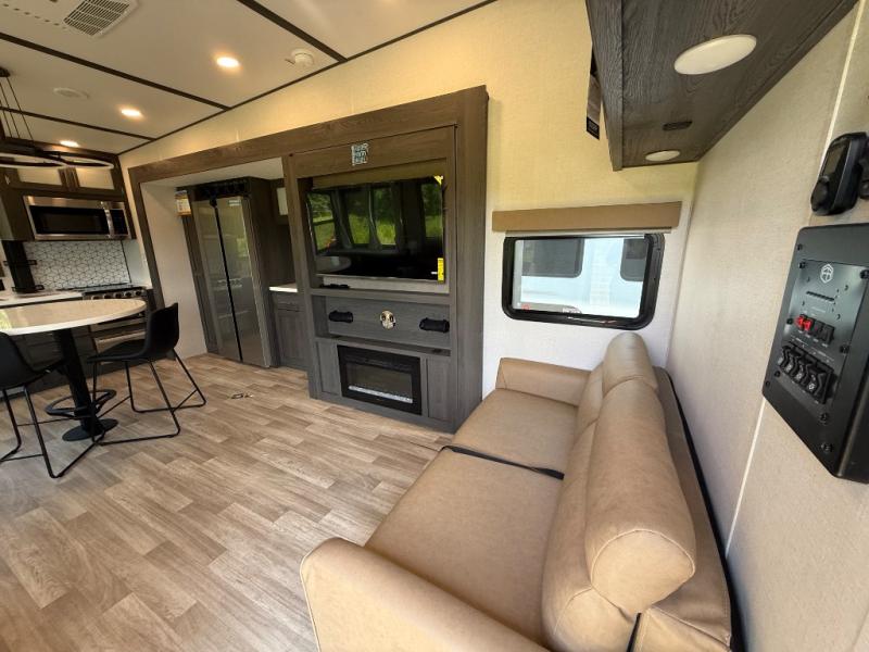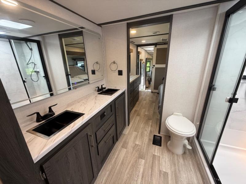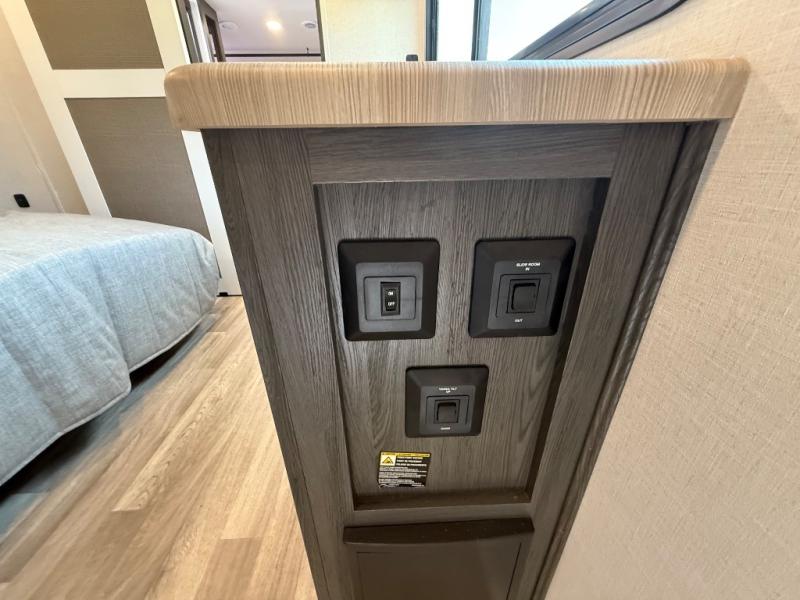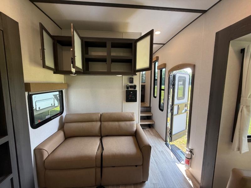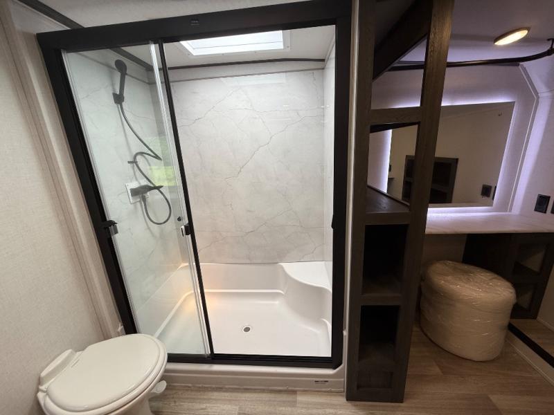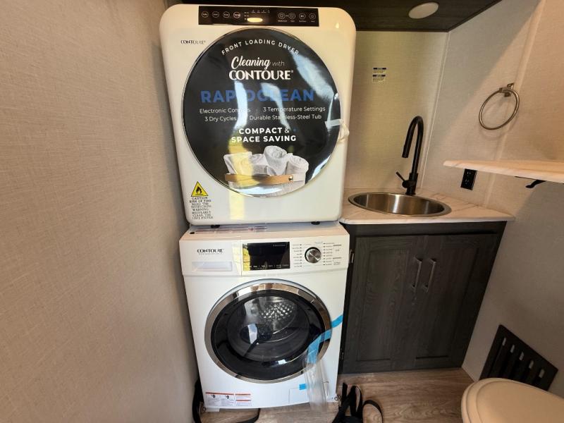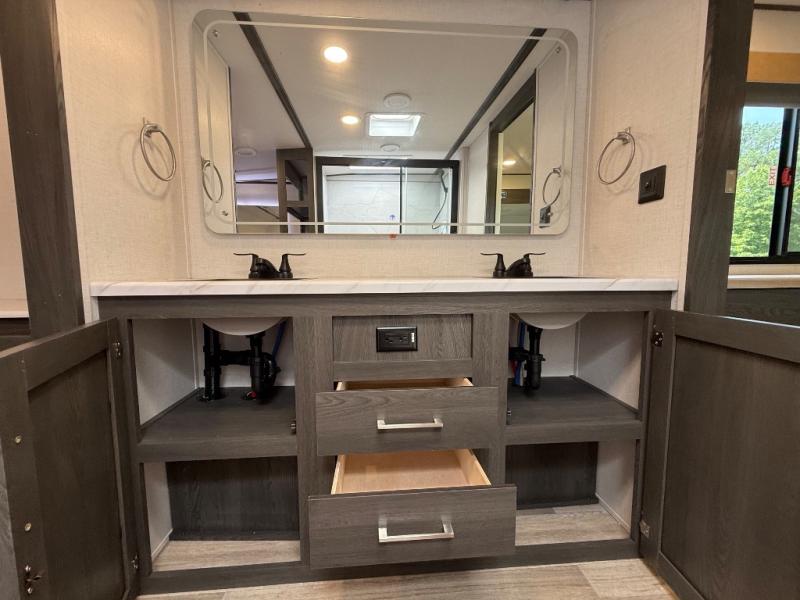 It's easy to see why this fifth wheel was voted Best New Model for 2025 by RV Pro! There are many residential features, such as a middle table with four seats, dual recliners, a desk to get some work done, and a master bedroom you are sure to love. You'll find a king bed with Versa Tilt technology, a dresser, and TV prep. A front master bath includes a walk-in shower with a skylight, dual bath sinks with a back-lit mirror, and a closet with shelves. The middle mud room includes washer/dryer prep, counter space and a pull-out drying rack to hang up swim clothes, towels, and more. Everyone will enjoy spending time in the main living room that includes dual opposing slides, a tri-fold sofa, and an entertainment center with hidden storage behind. And the chef of your group will love the rear kitchen with its 16 cu. ft. 12V refrigerator and pantry, an oven, and plenty of counter space. Head outdoors to enjoy the two power awnings in the evening!