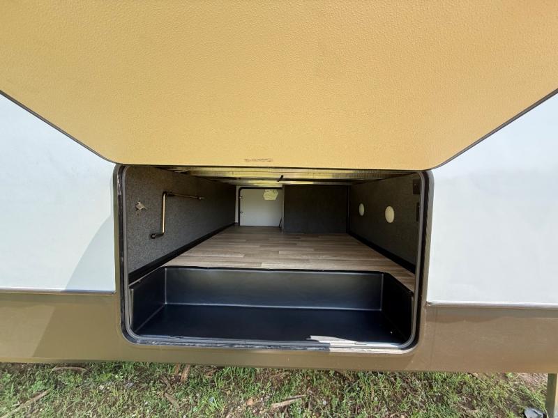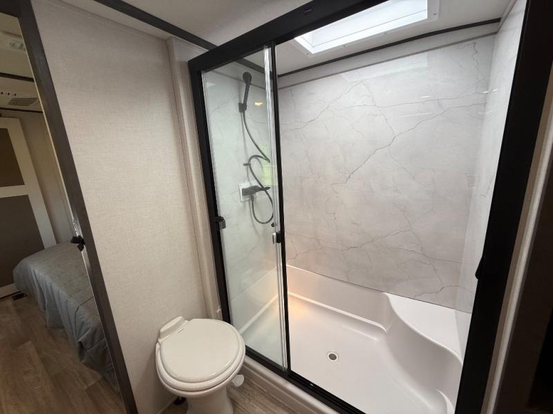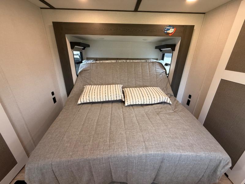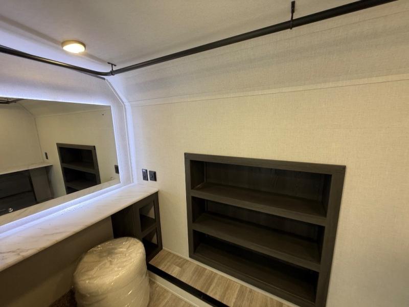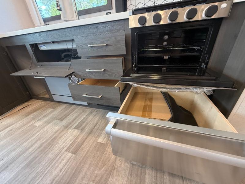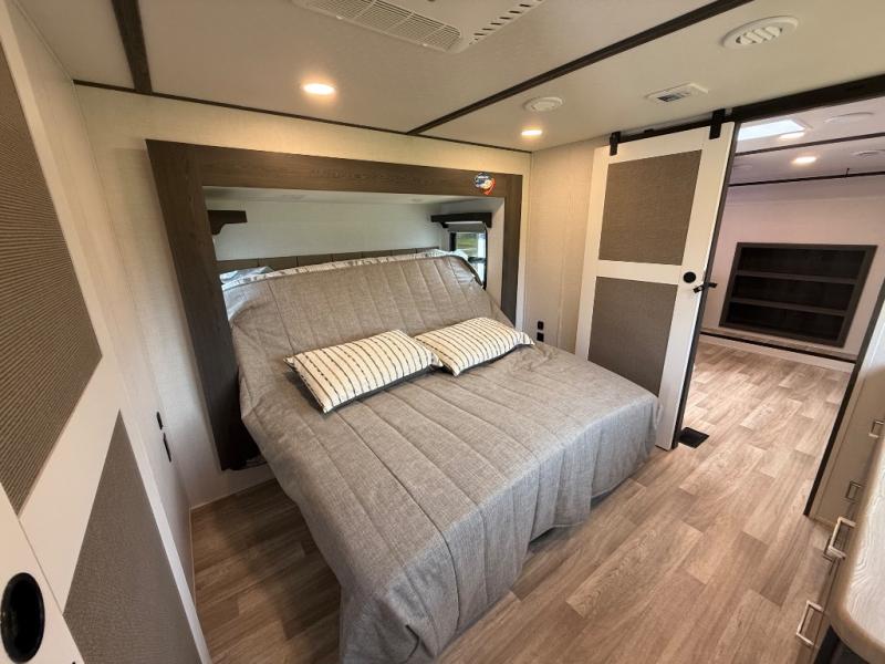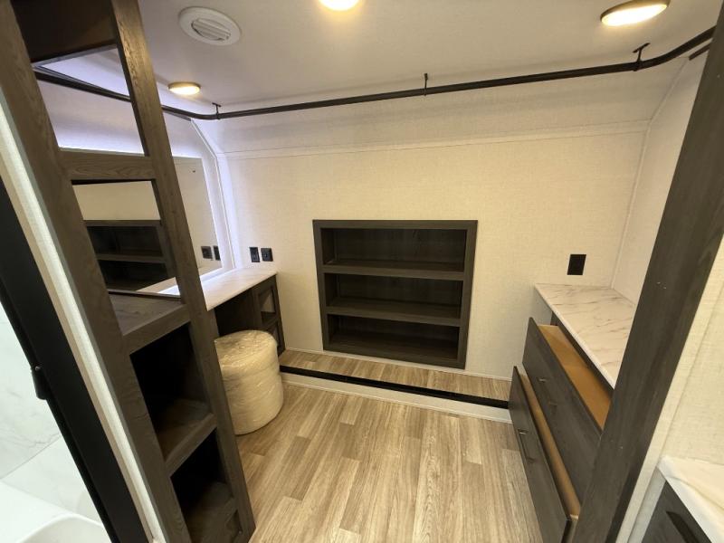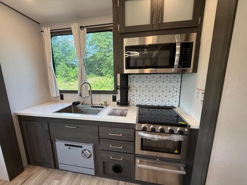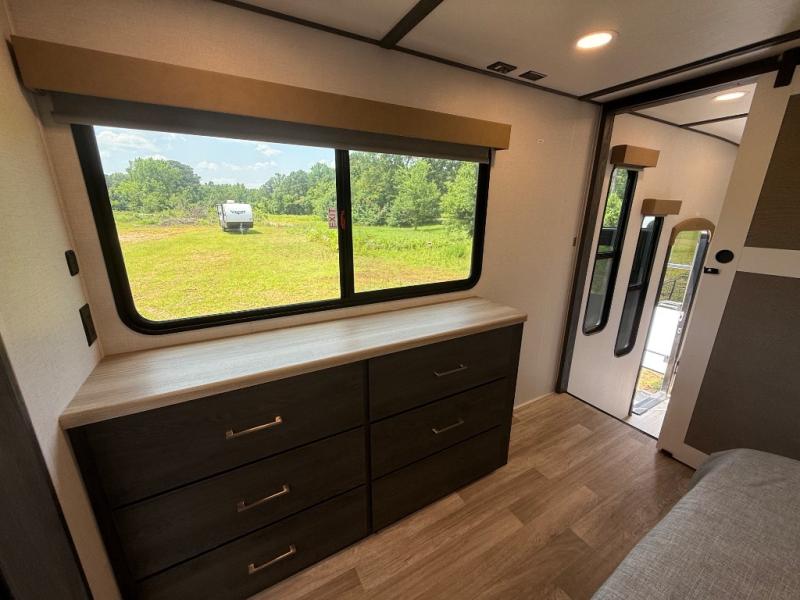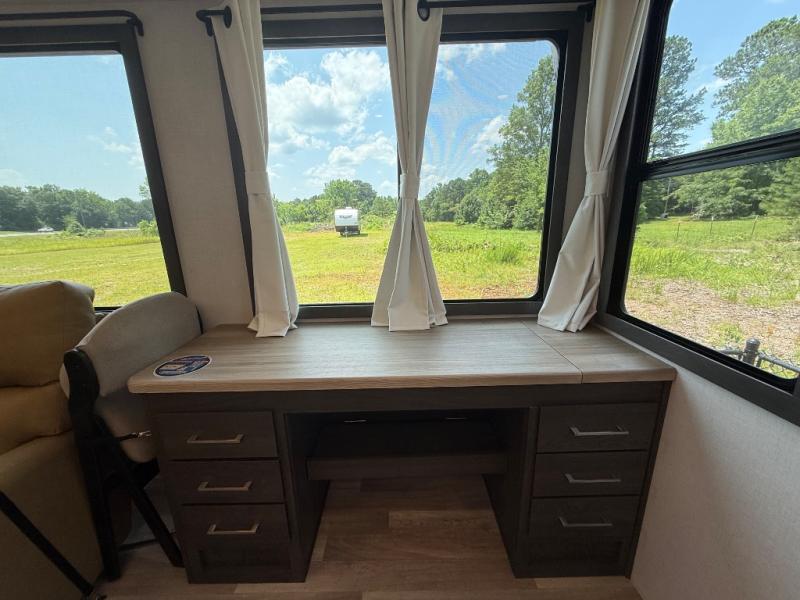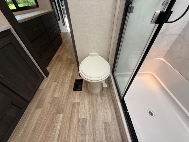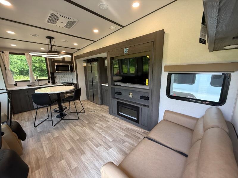 It's easy to see why this fifth wheel was voted Best New Model for 2025 by RV Pro! There are many residential features, such as a middle table with four seats, dual recliners, a desk to get some work done, and a master bedroom you are sure to love. You'll find a king bed with Versa Tilt technology, a dresser, and TV prep. A front master bath includes a walk-in shower with a skylight, dual bath sinks with a back-lit mirror, and a closet with shelves. The middle mud room includes washer/dryer prep, counter space and a pull-out drying rack to hang up swim clothes, towels, and more. Everyone will enjoy spending time in the main living room that includes dual opposing slides, a tri-fold sofa, and an entertainment center with hidden storage behind. And the chef of your group will love the rear kitchen with its 16 cu. ft. 12V refrigerator and pantry, an oven, and plenty of counter space. Head outdoors to enjoy the two power awnings in the evening!