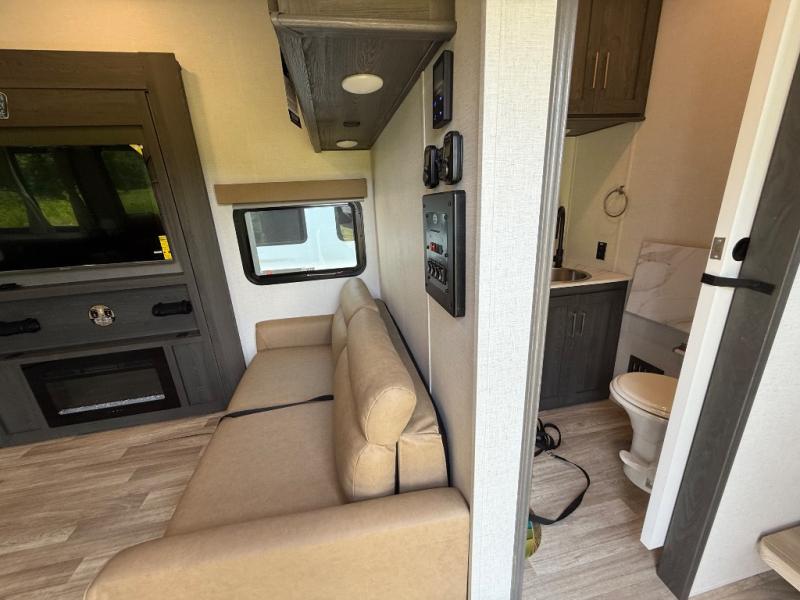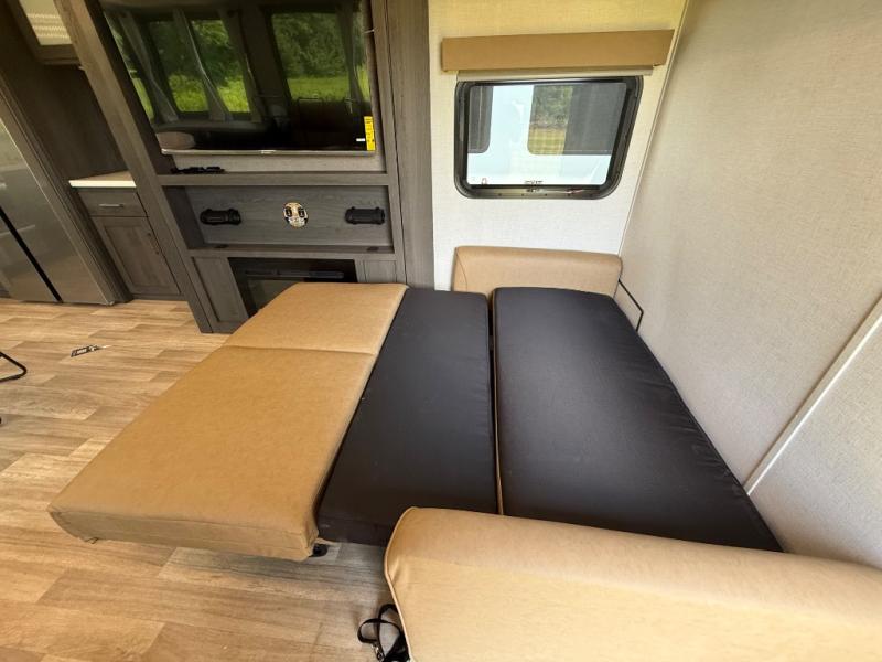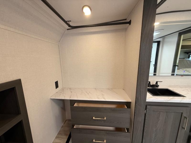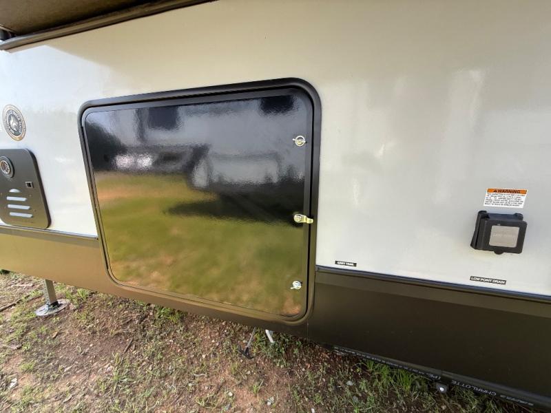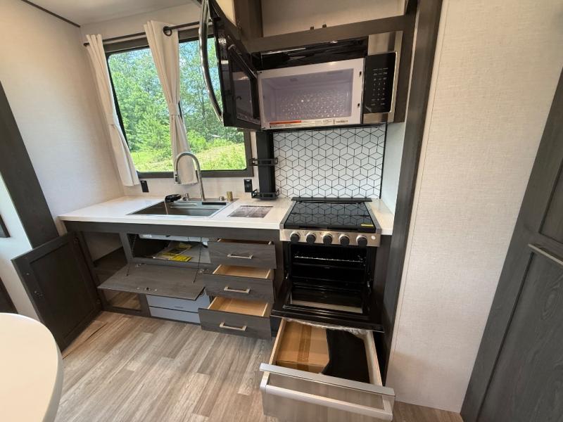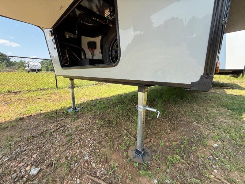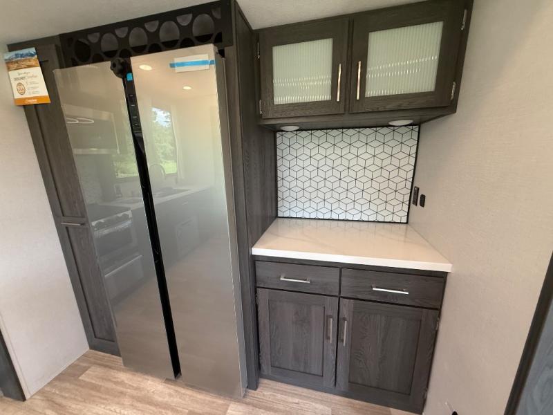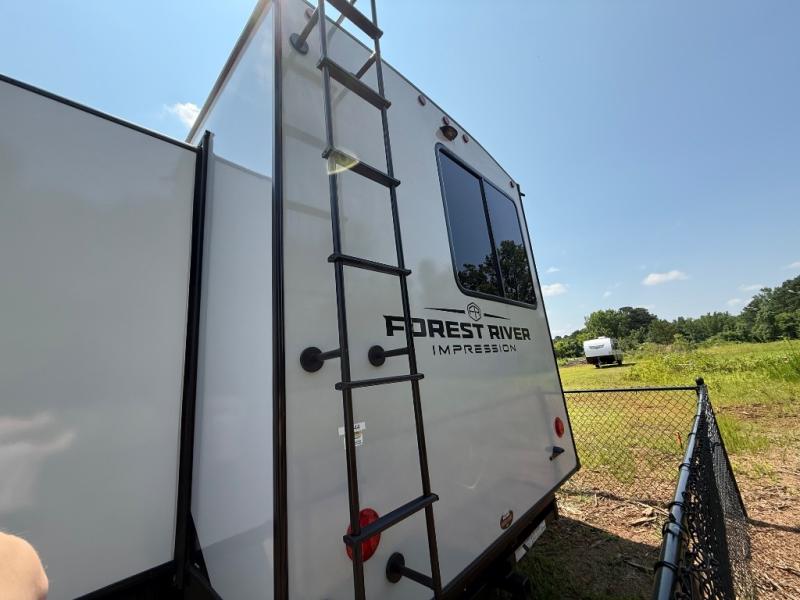 With any Impression mid-profile fifth wheel by Forest River, the focus of the design is comfort and value, built with quality craftsmanship and attention to customer's desires in each Impression! The exterior includes upgraded E-rated tires, custom exterior graphics package, and insulated slam latch baggage doors. There is also an enclosed docking station, an outside shower, and a 100W roof solar panel for off-grid capabilities. The fully heated and enclosed AccessiBelly has removable underbelly panels and offers four seasons of travel, and there is an industry leading 15K A/C plus 35K BTU furnace to keep you comfortable. The interior has lumbercore cabinetry, residential linoleum, residential backsplash in the kitchen, and oversized opening windows in the living area for more natural lighting and good air flow.