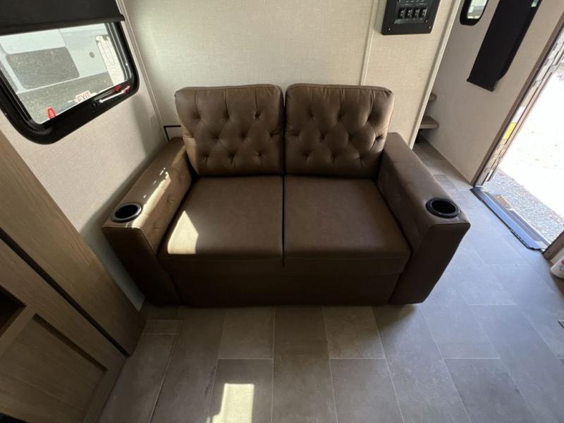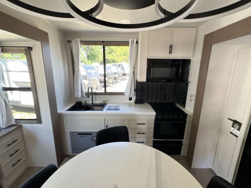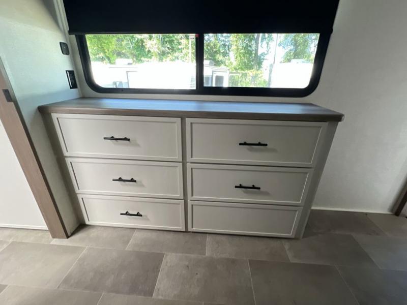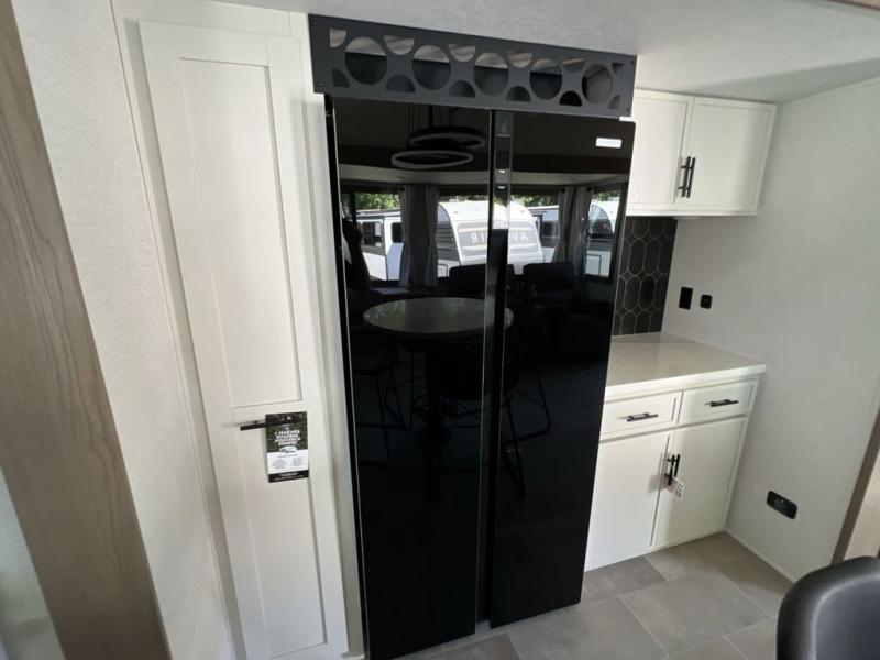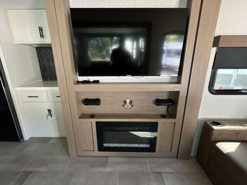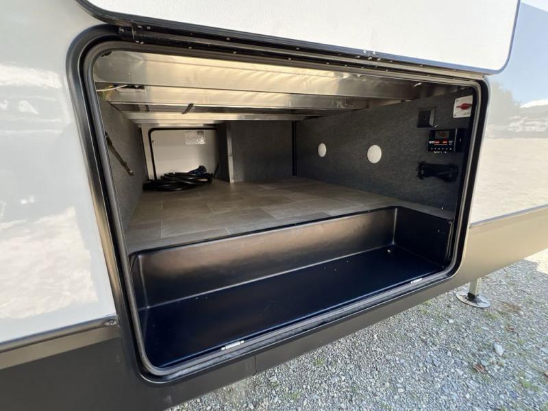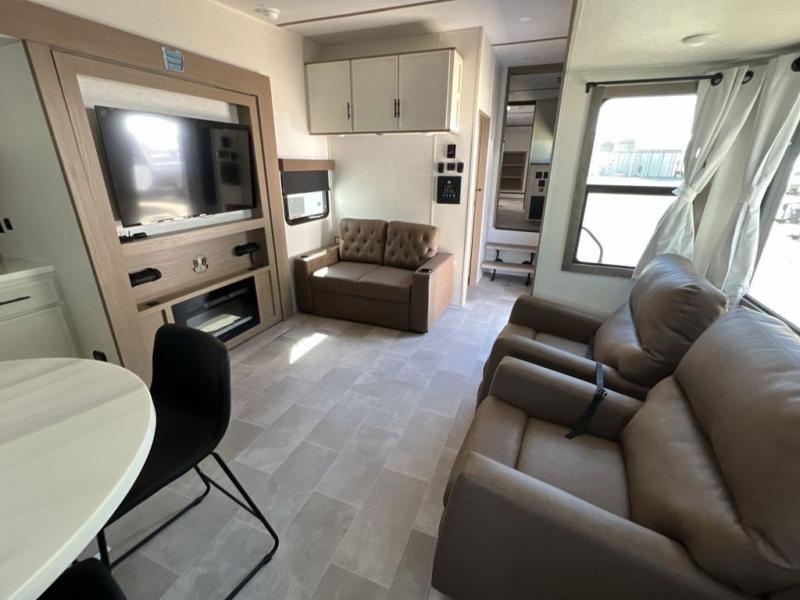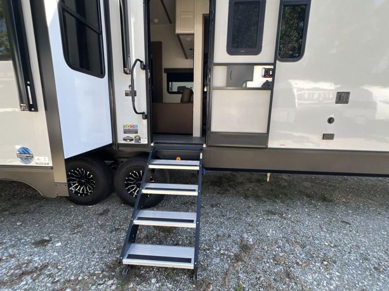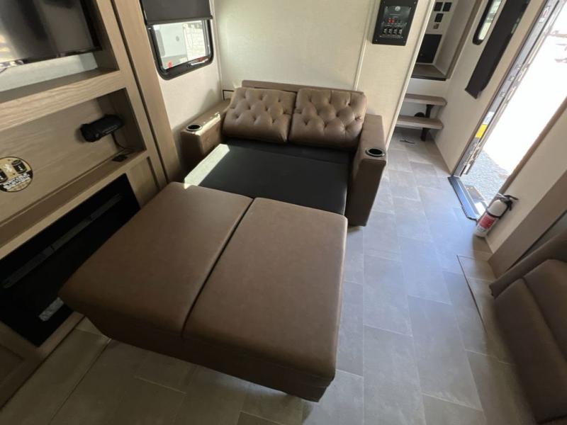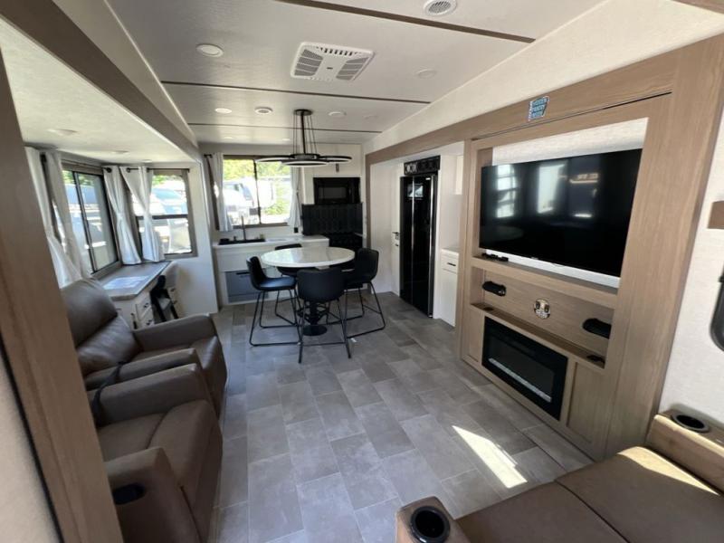 It's easy to see why this fifth wheel was voted Best New Model for 2025 by RV Pro! There are many residential features, such as a middle table with four seats, dual recliners, a desk to get some work done, and a master bedroom you are sure to love. You'll find a king bed with Versa Tilt technology, a dresser, and TV prep. A front master bath includes a walk-in shower with a skylight, dual bath sinks with a back-lit mirror, and a closet with shelves. The middle mud room includes washer/dryer prep, counter space and a pull-out drying rack to hang up swim clothes, towels, and more. Everyone will enjoy spending time in the main living room that includes dual opposing slides, a tri-fold sofa, and an entertainment center with hidden storage behind. And the chef of your group will love the rear kitchen with its 16 cu. ft. 12V refrigerator and pantry, an oven, and plenty of counter space. Head outdoors to enjoy the two power awnings in the evening!
