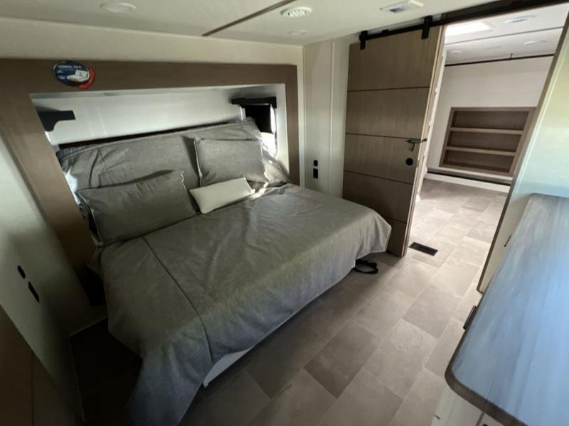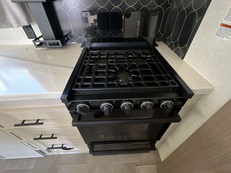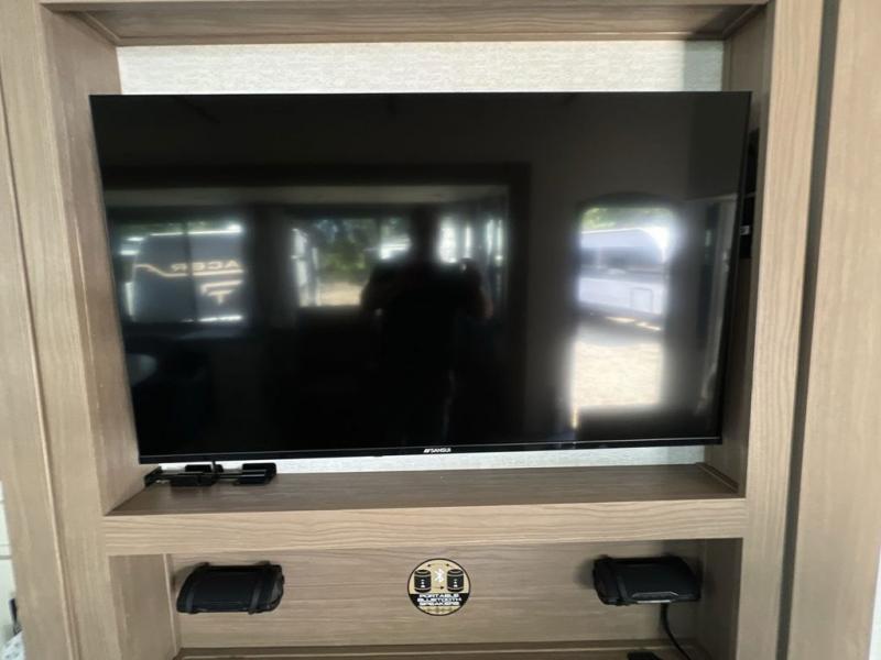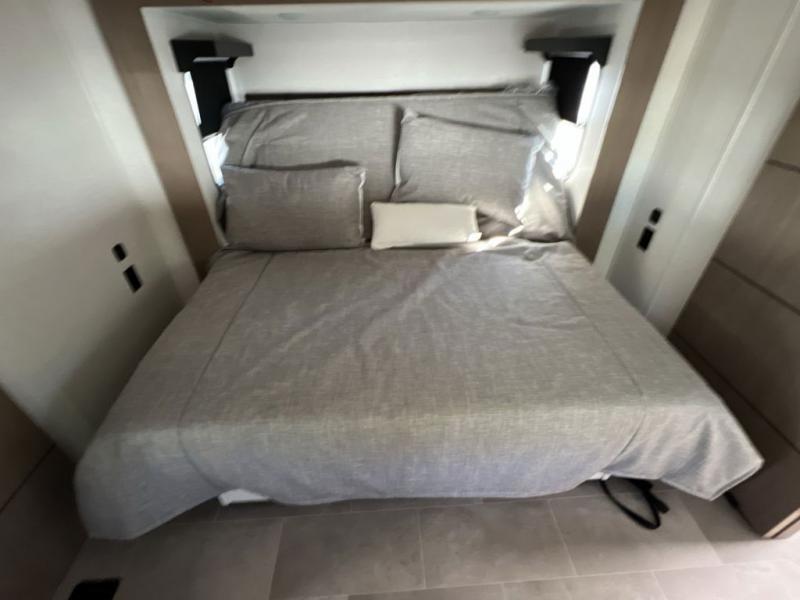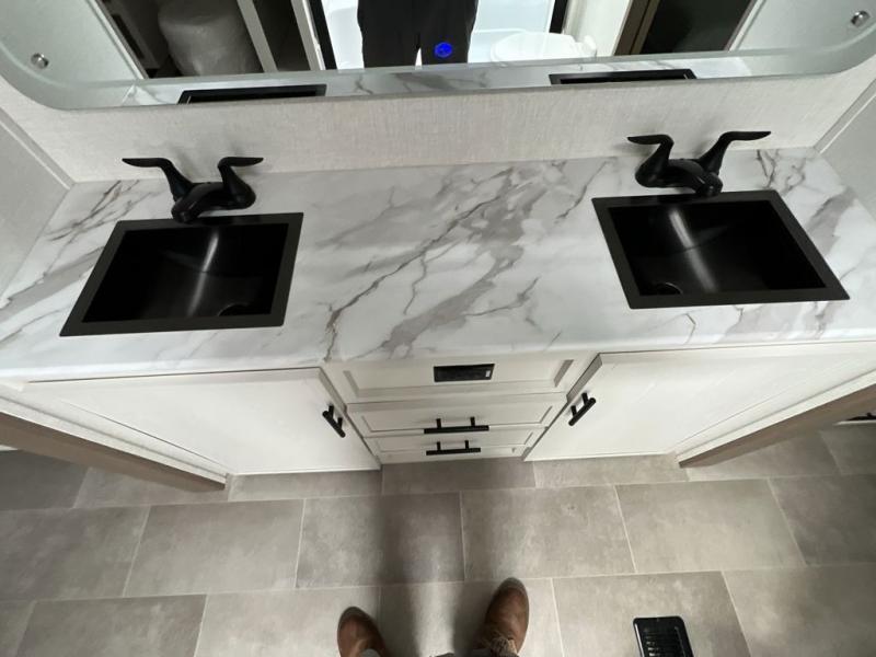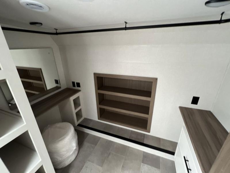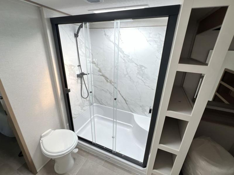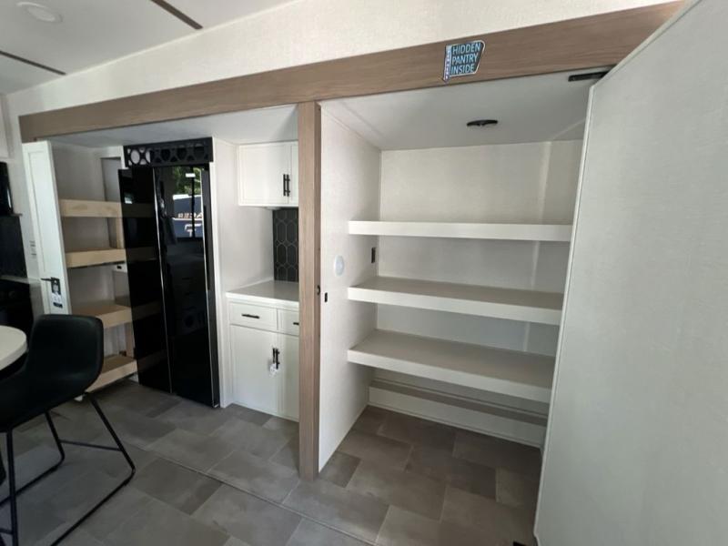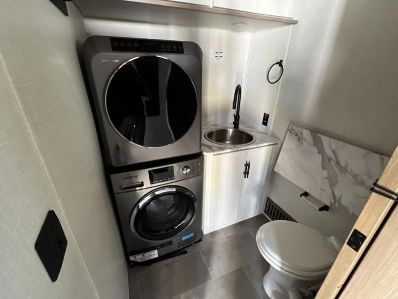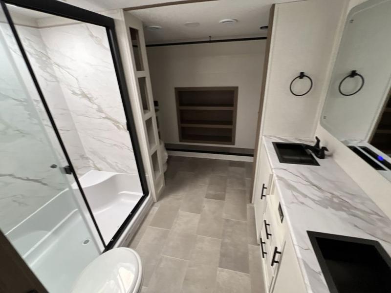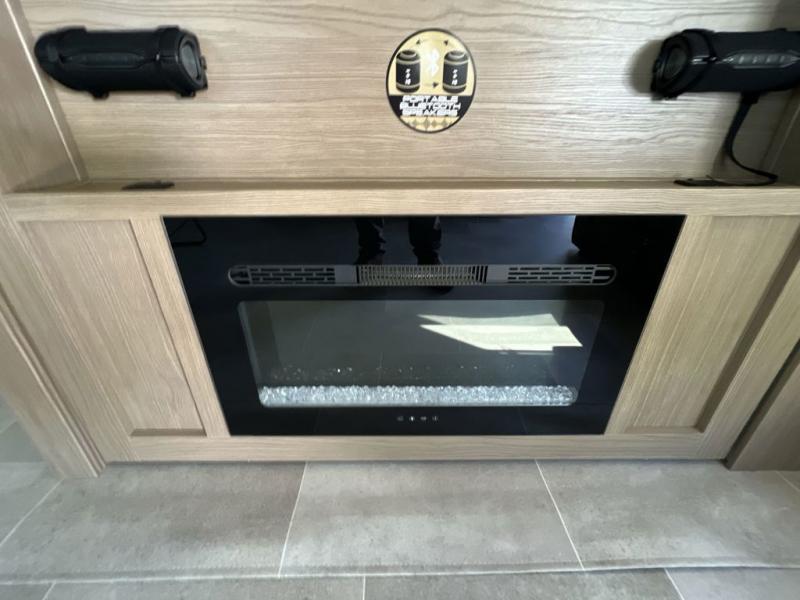 It's easy to see why this fifth wheel was voted Best New Model for 2025 by RV Pro! There are many residential features, such as a middle table with four seats, dual recliners, a desk to get some work done, and a master bedroom you are sure to love. You'll find a king bed with Versa Tilt technology, a dresser, and TV prep. A front master bath includes a walk-in shower with a skylight, dual bath sinks with a back-lit mirror, and a closet with shelves. The middle mud room includes washer/dryer prep, counter space and a pull-out drying rack to hang up swim clothes, towels, and more. Everyone will enjoy spending time in the main living room that includes dual opposing slides, a tri-fold sofa, and an entertainment center with hidden storage behind. And the chef of your group will love the rear kitchen with its 16 cu. ft. 12V refrigerator and pantry, an oven, and plenty of counter space. Head outdoors to enjoy the two power awnings in the evening!