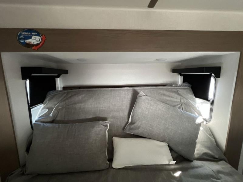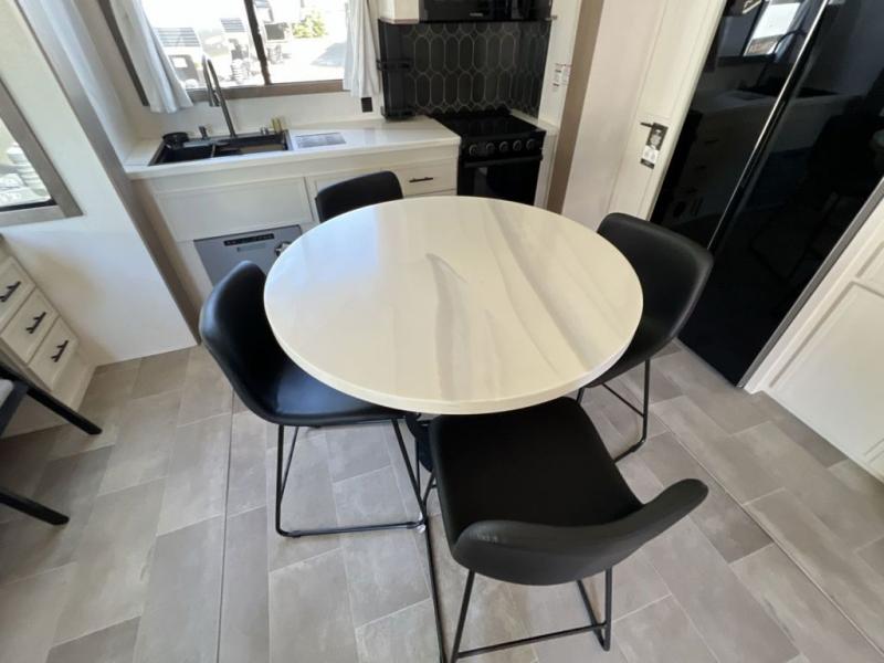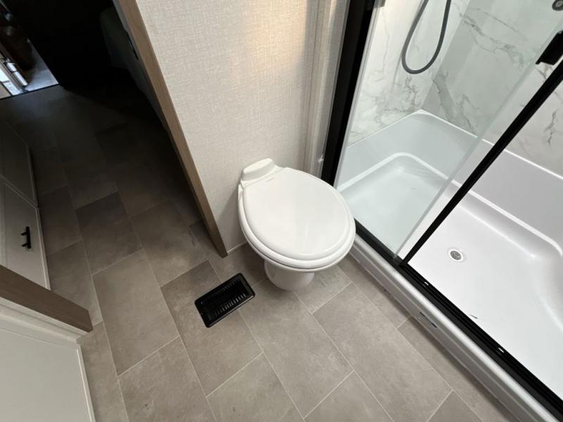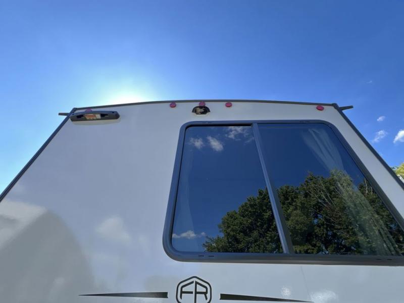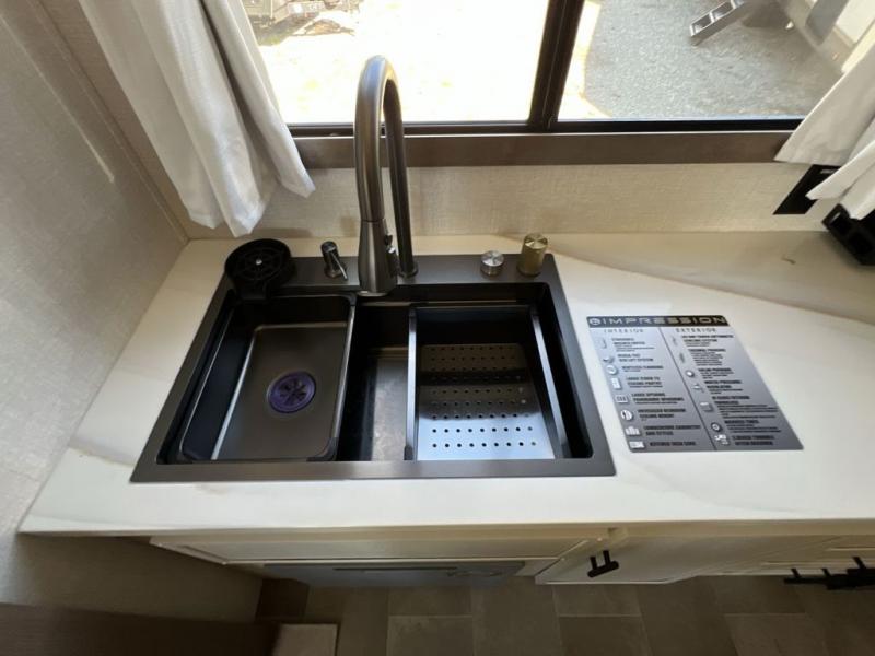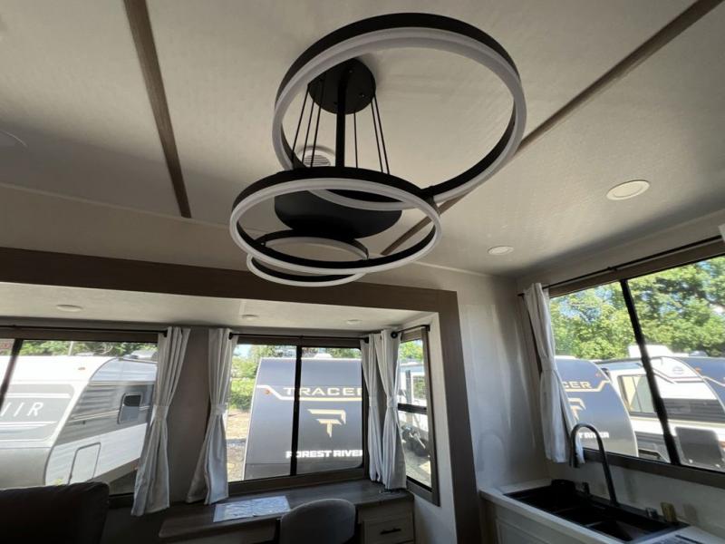 With any Impression mid-profile fifth wheel by Forest River, the focus of the design is comfort and value, built with quality craftsmanship and attention to customer's desires in each Impression! The exterior includes upgraded E-rated tires, custom exterior graphics package, and insulated slam latch baggage doors. There is also an enclosed docking station, an outside shower, and a 100W roof solar panel for off-grid capabilities. The fully heated and enclosed AccessiBelly has removable underbelly panels and offers four seasons of travel, and there is an industry leading 15K A/C plus 35K BTU furnace to keep you comfortable. The interior has lumbercore cabinetry, residential linoleum, residential backsplash in the kitchen, and oversized opening windows in the living area for more natural lighting and good air flow.